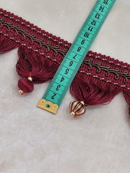Este o bandă decor cu mărgele textile bordo/crem cu o lățime de 8 cm.