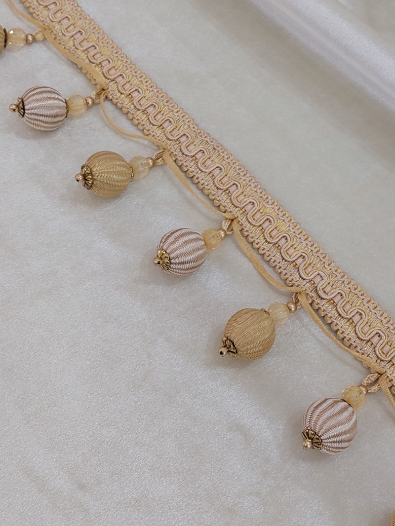 Este o bandă decor cu mărgele textile muștar aurii. Banda are o lățime de 7 cm, iar o mărgea are diametru de 2 cm.