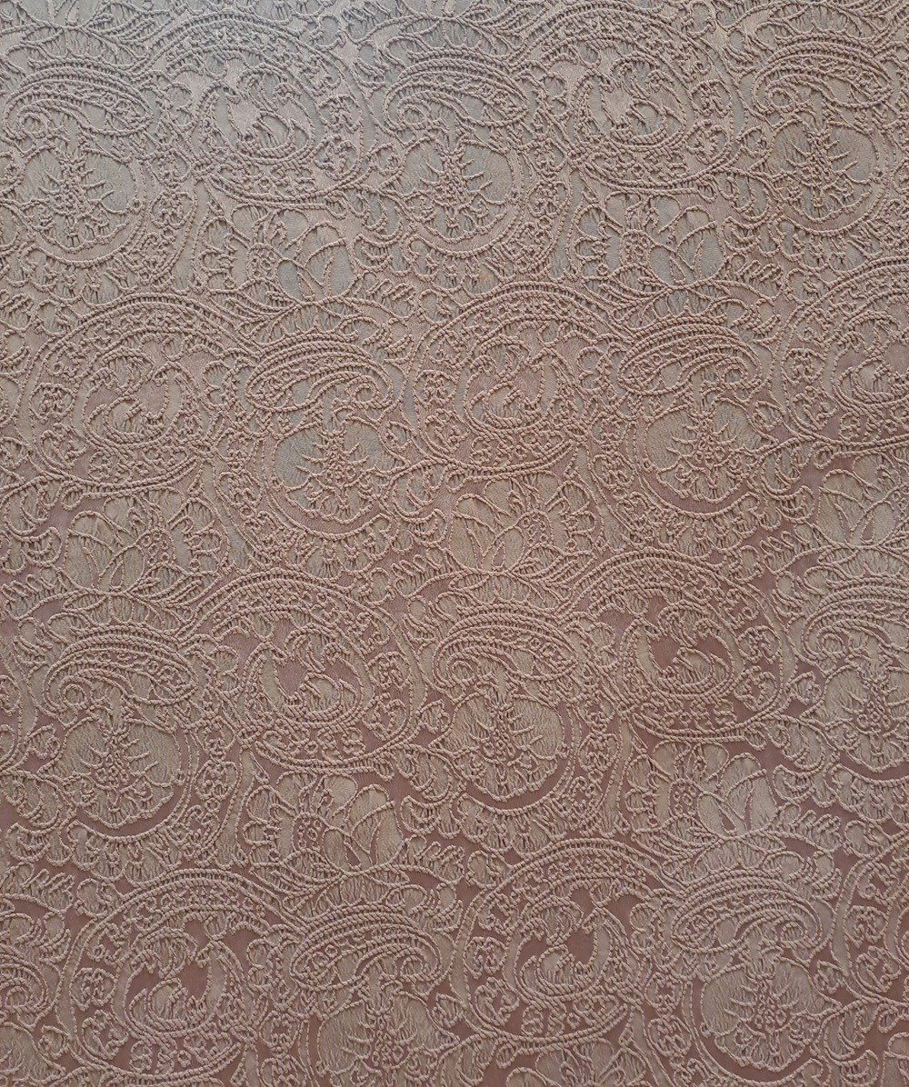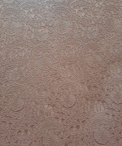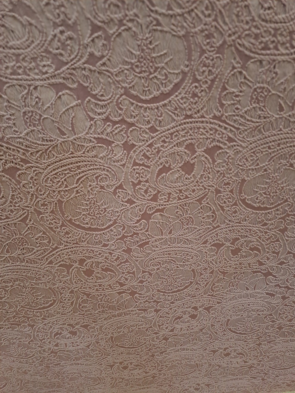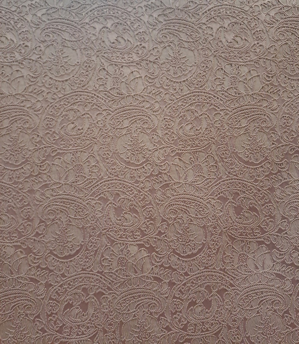 Este un brocart mov prăfuit cu model floral oriental ieșit ușor în relief.