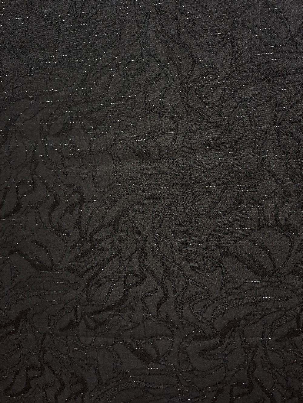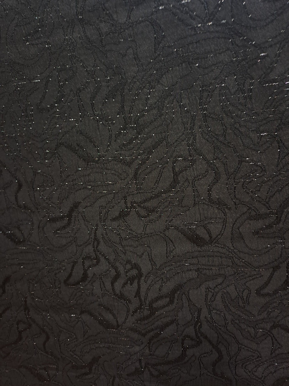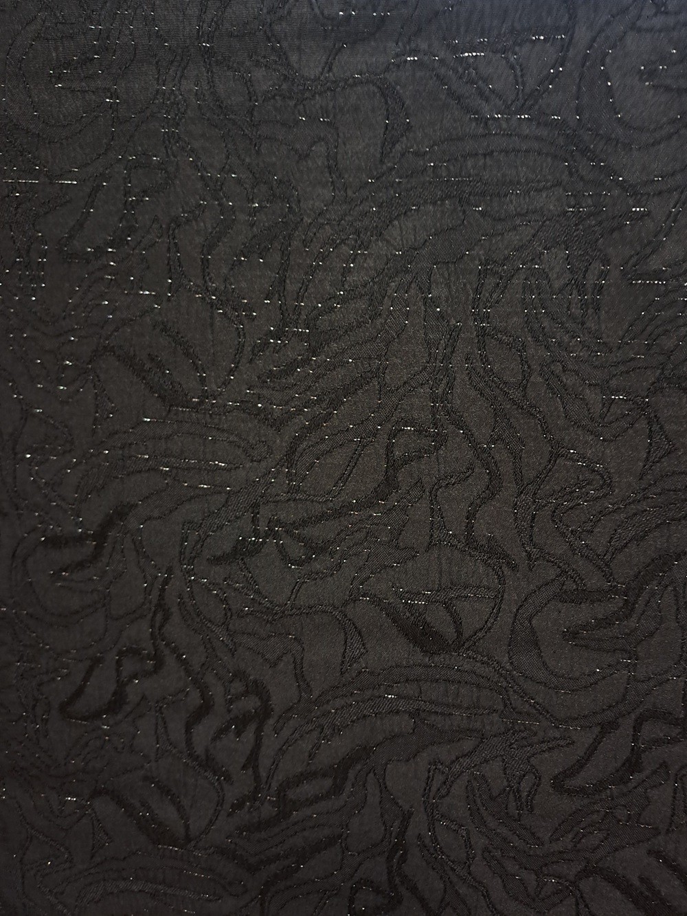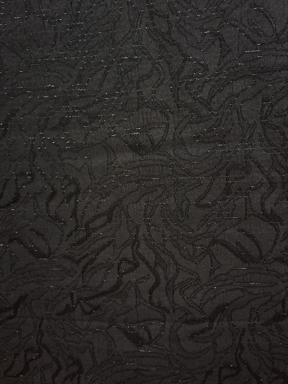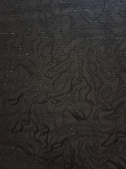 Este un brocart negru cu model abstract. Are fir lame argintiu discret sub formă de linii întrerupte, orizontale pe lungimea materialului.