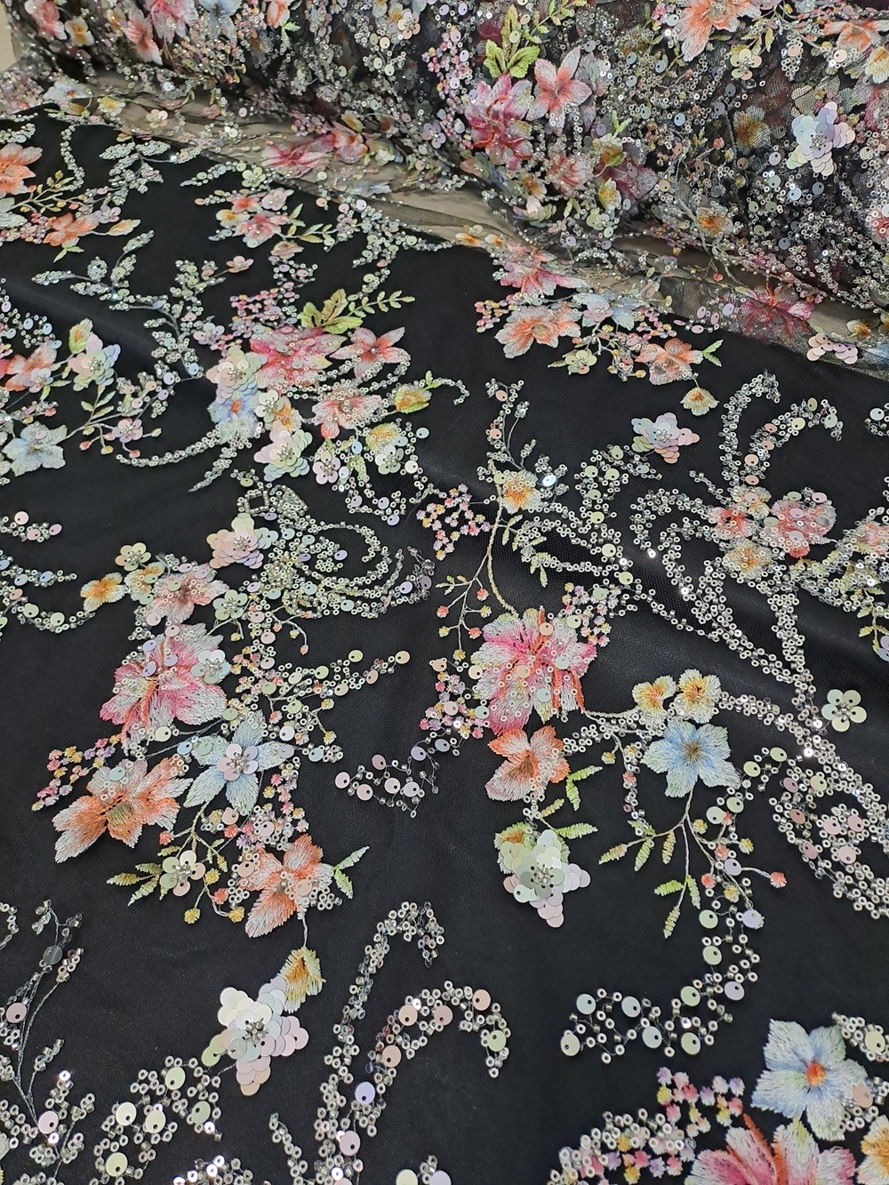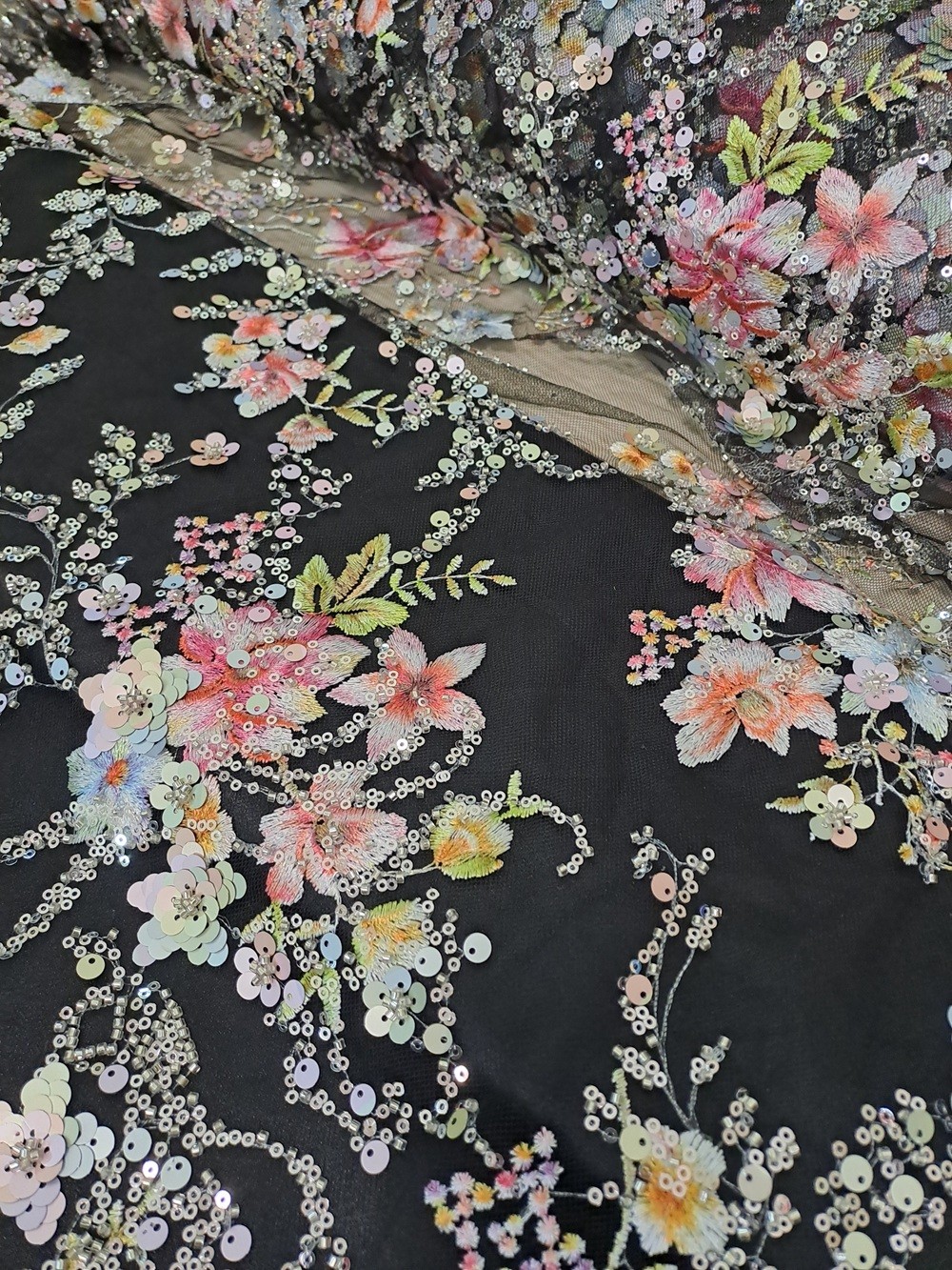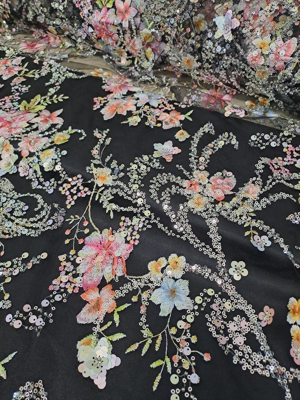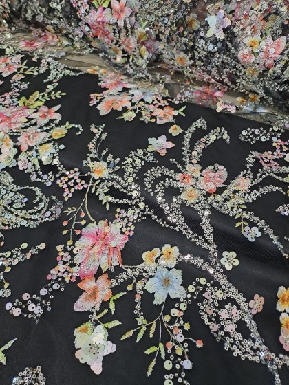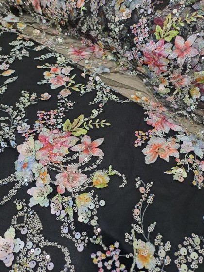 Este o broderie florală colorată pe suport de tull negru cu aplicații de paiete. Florile sunt în mare parte roz, bleu și portocaliu.