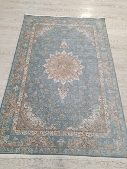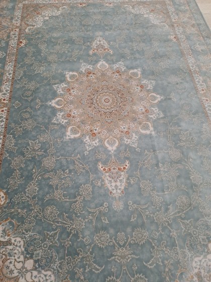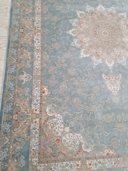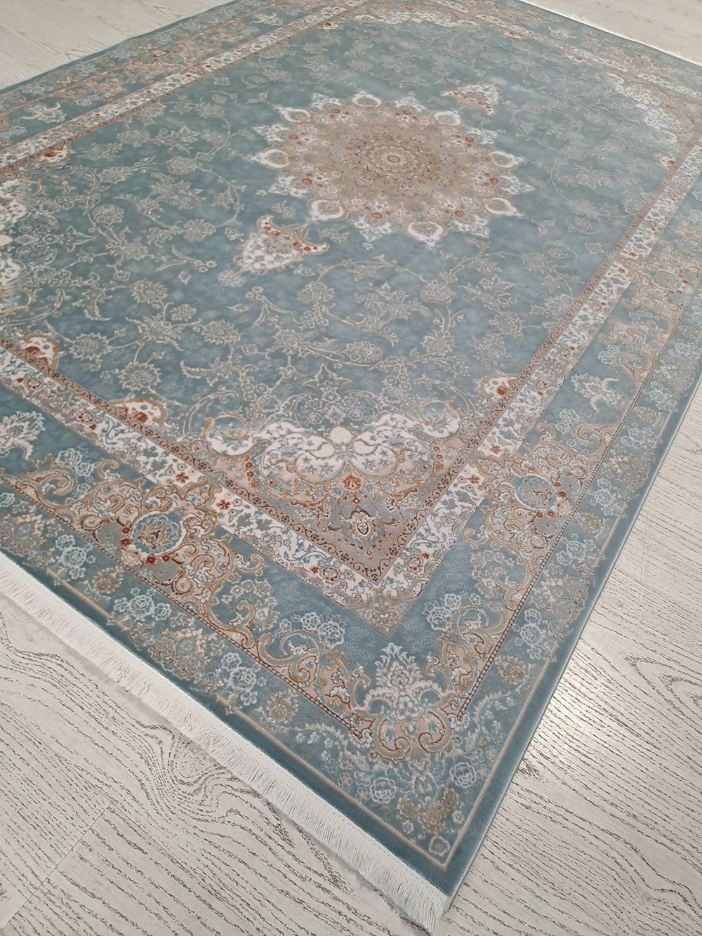 Este un covor albastru deschis cu model clasic ivoar și tonuri de bej.