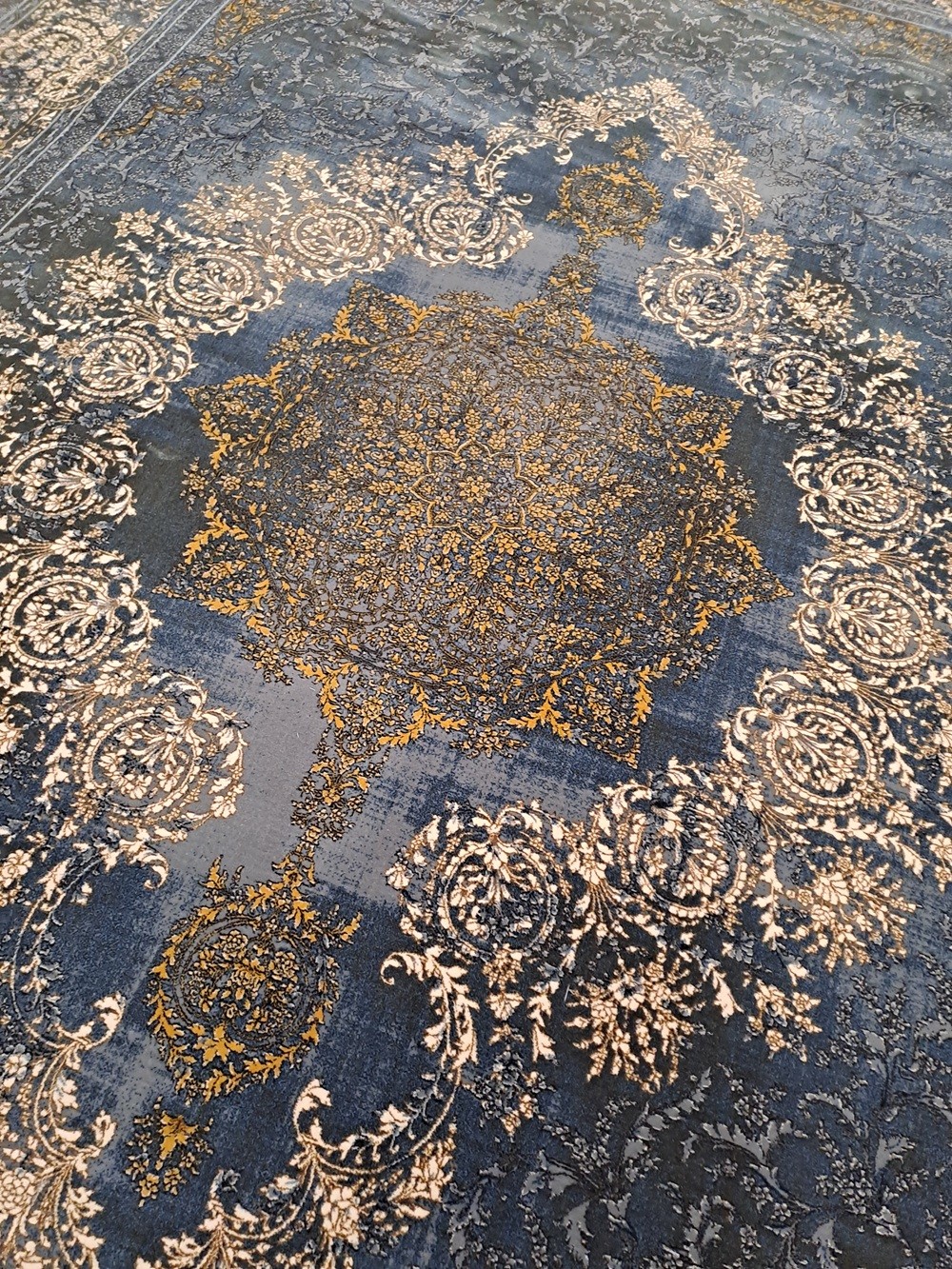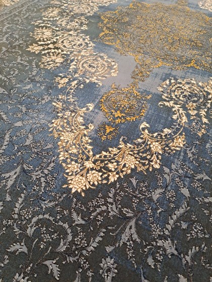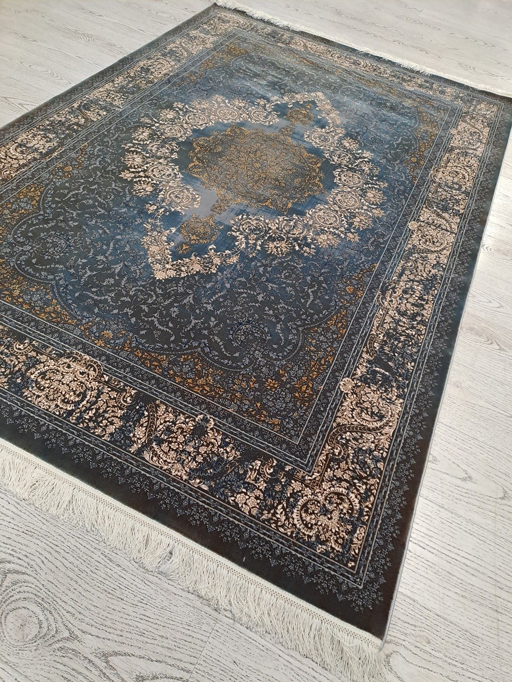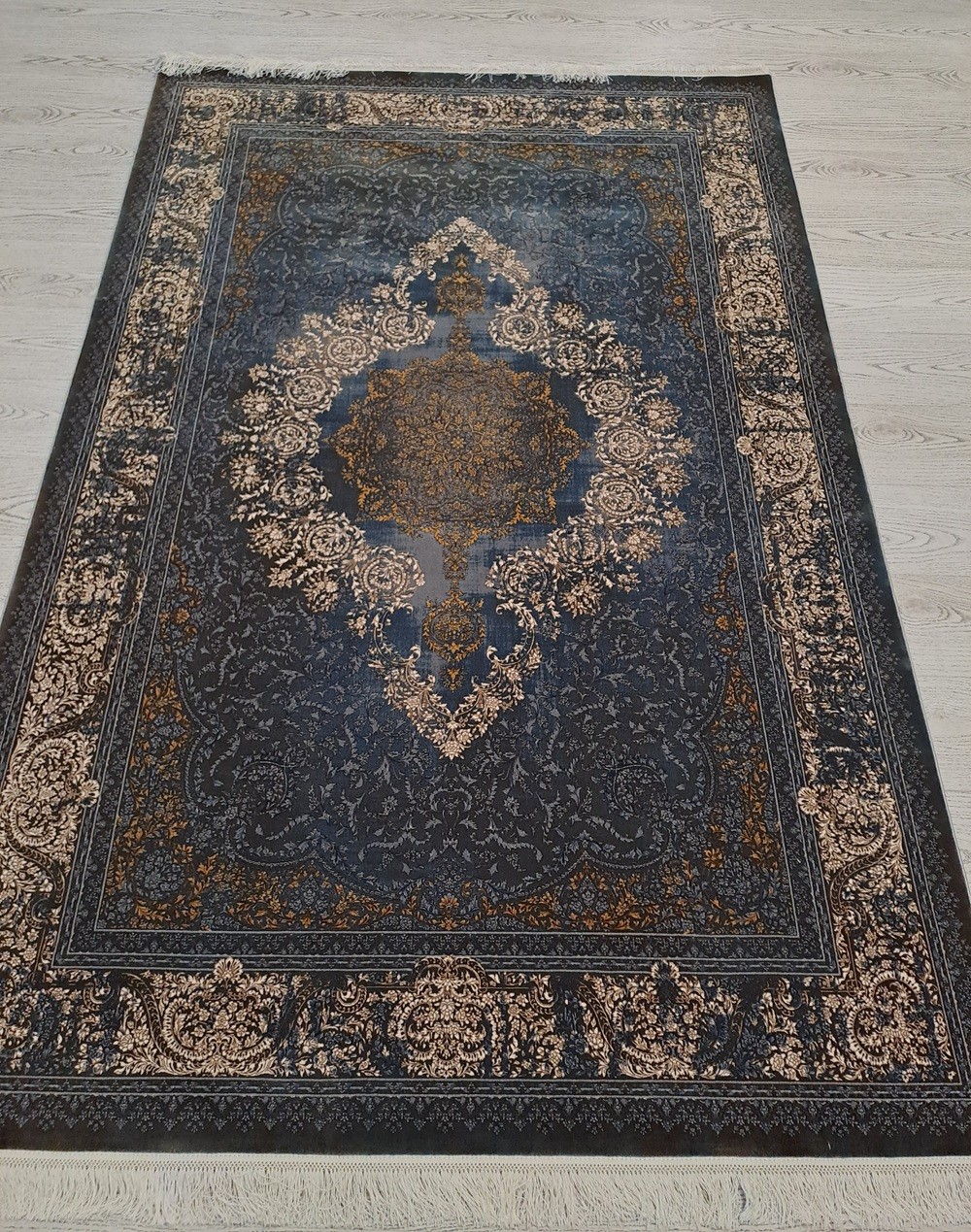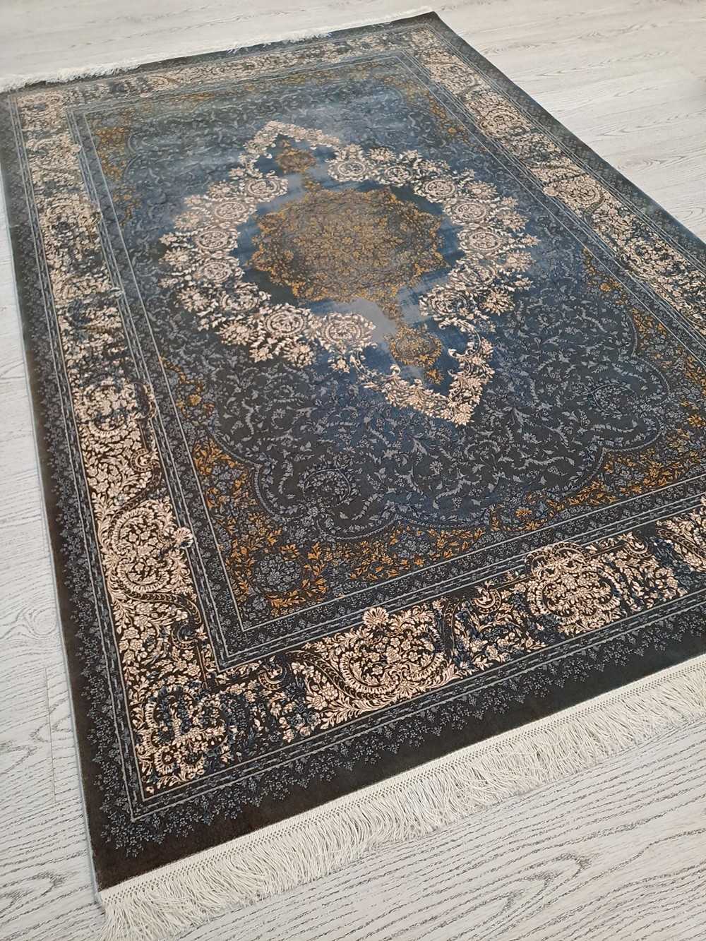 Este un covor albastru cu model clasic în tonuri de bej, ivoar, bej auriu, gri albăstrui.