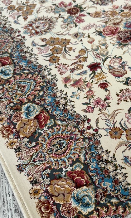 Este un covor pe fond bej cu model clasic alb cu bej deschis în 3D.