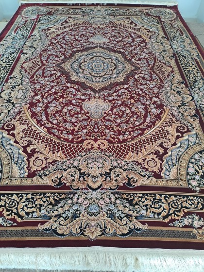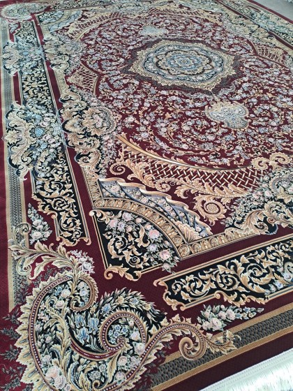 Este un covor pe fond bordo cu model clasic oriental bej auriucu flori albastre, roz, mov deschis. Modelul este unul dantelat.