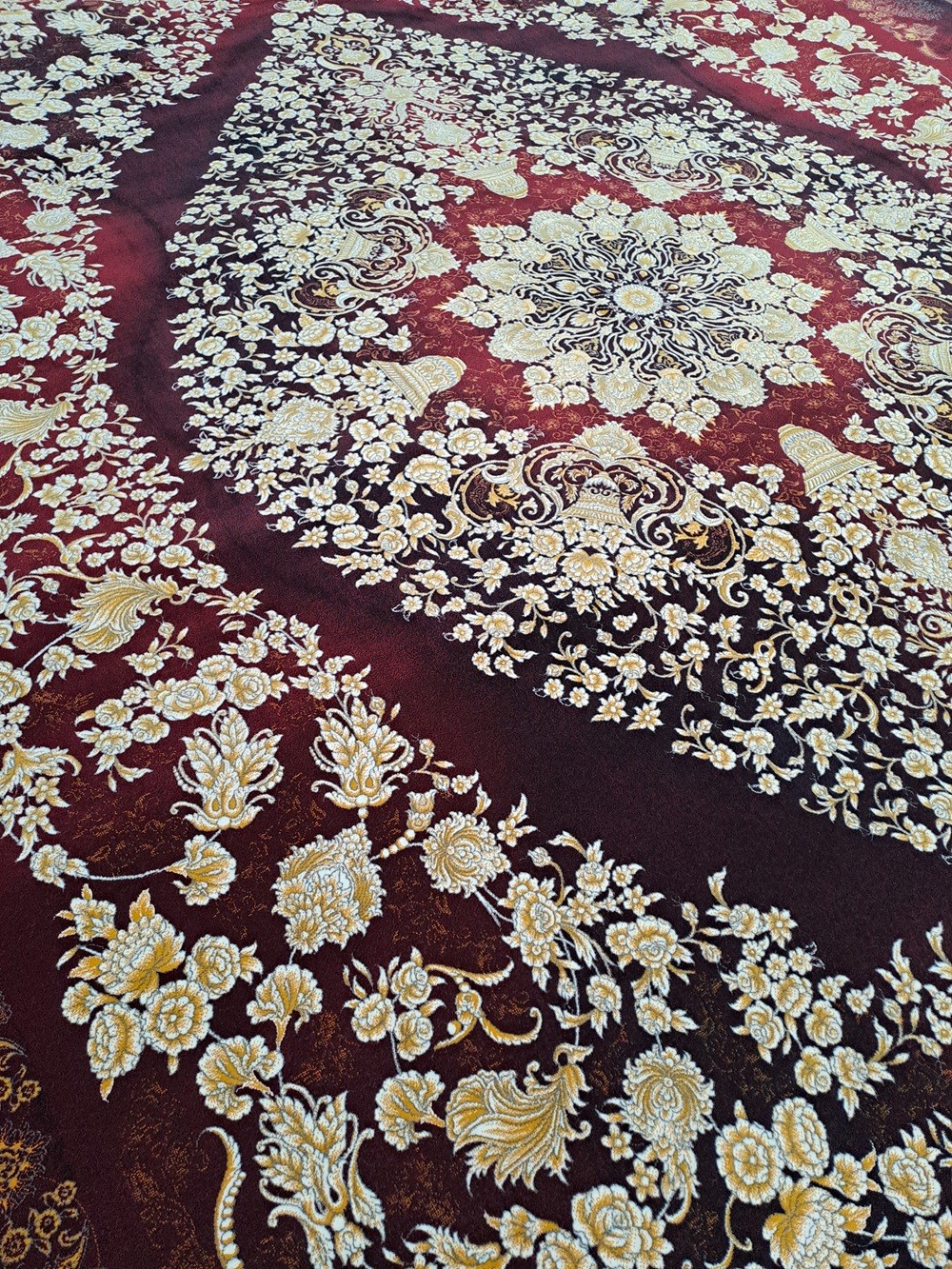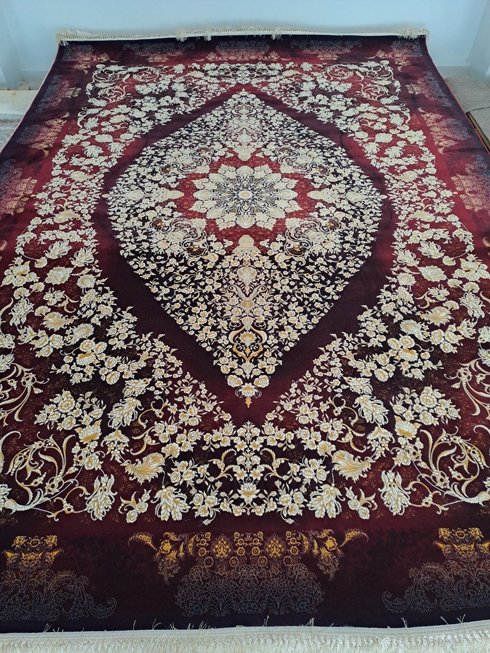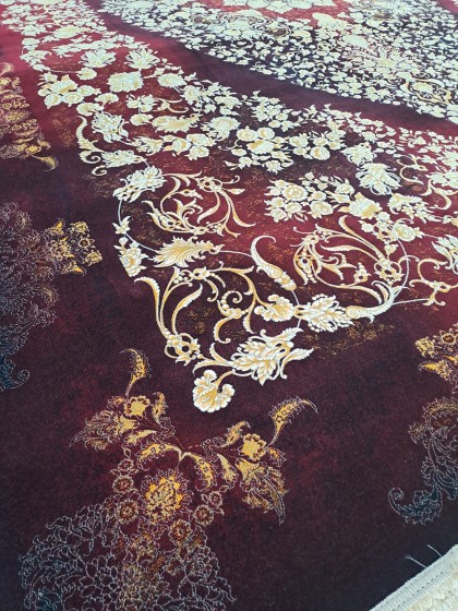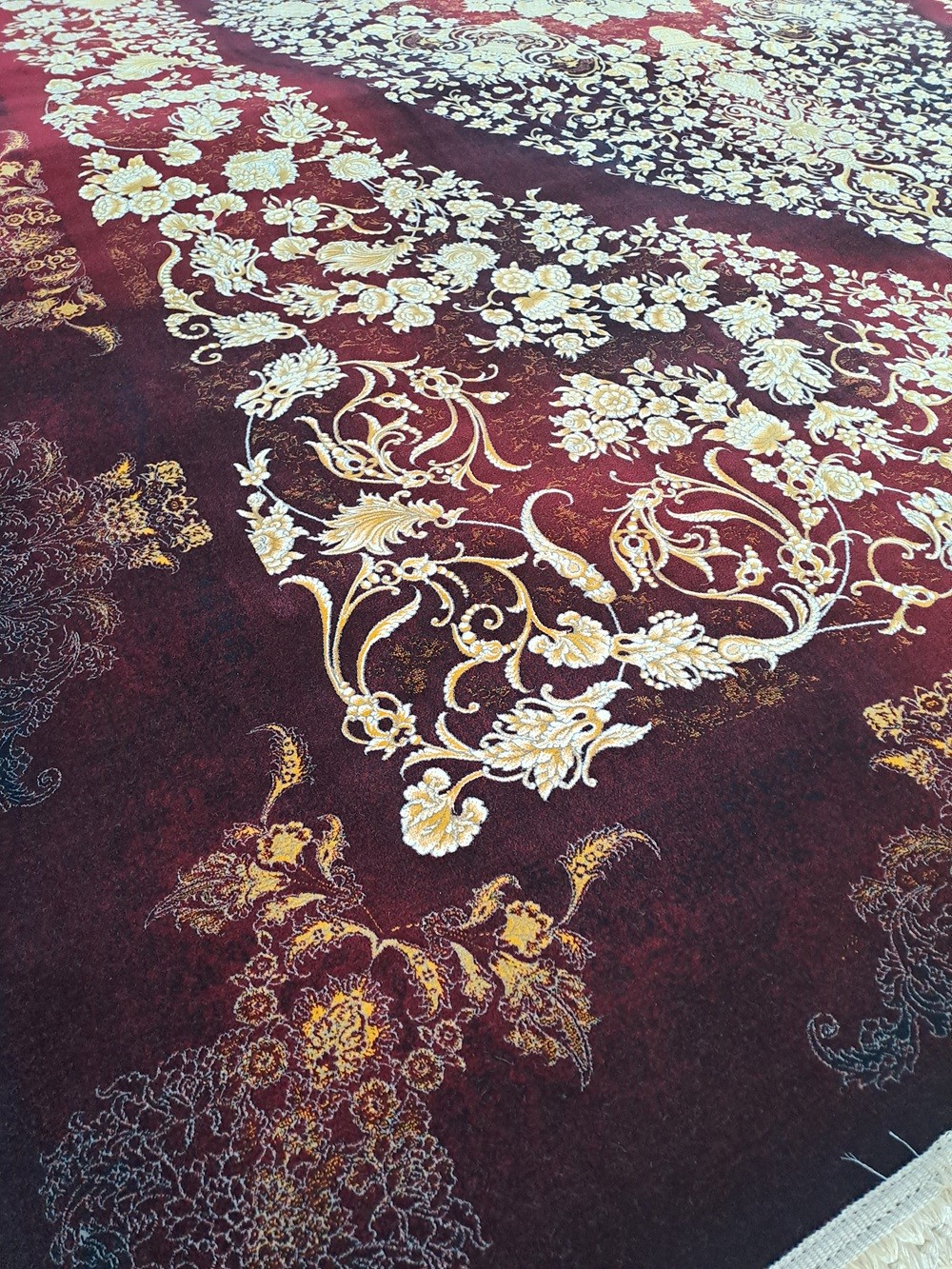 Este un covor bordo cu model floral oriental ivoar cu galben.