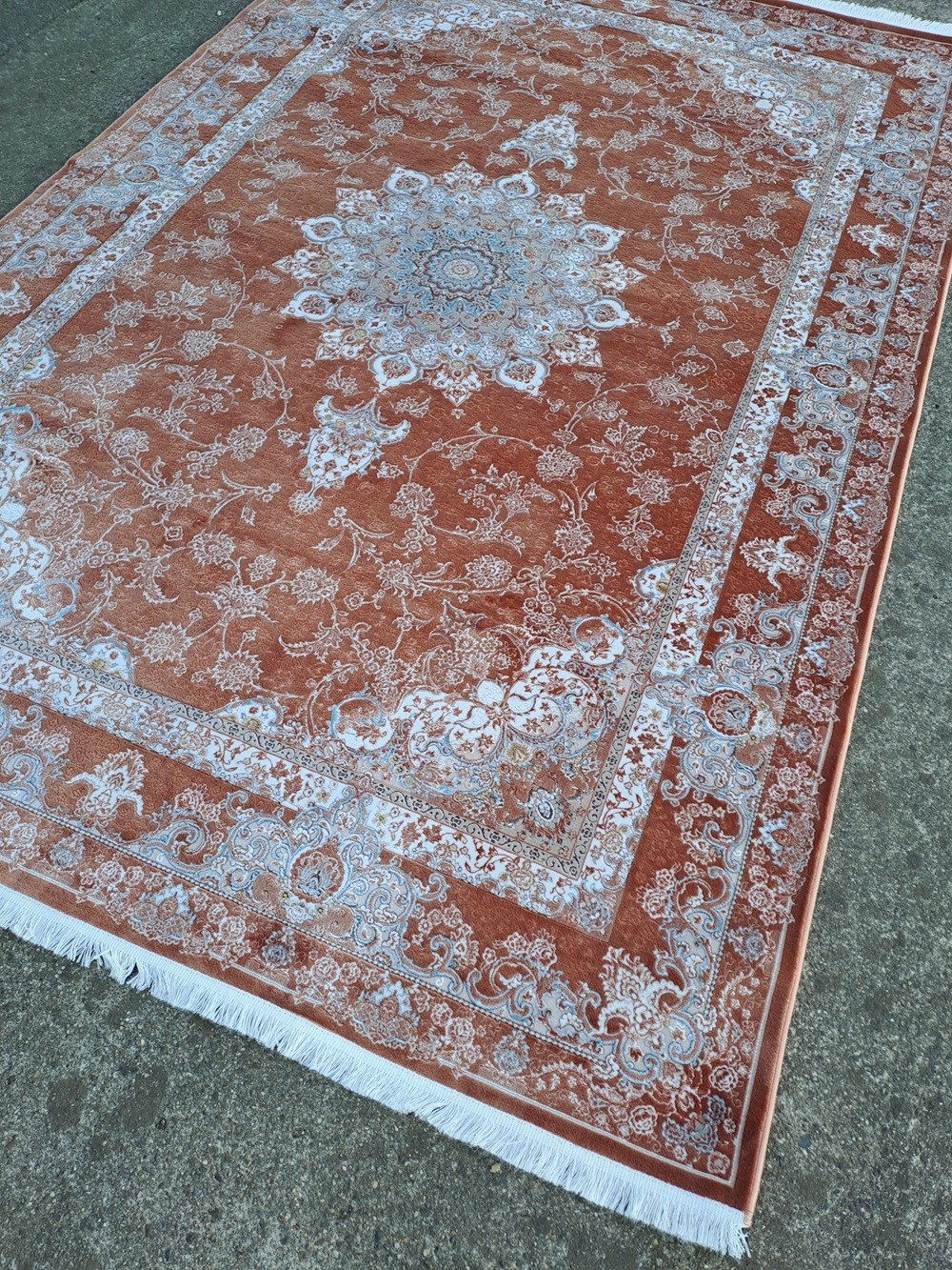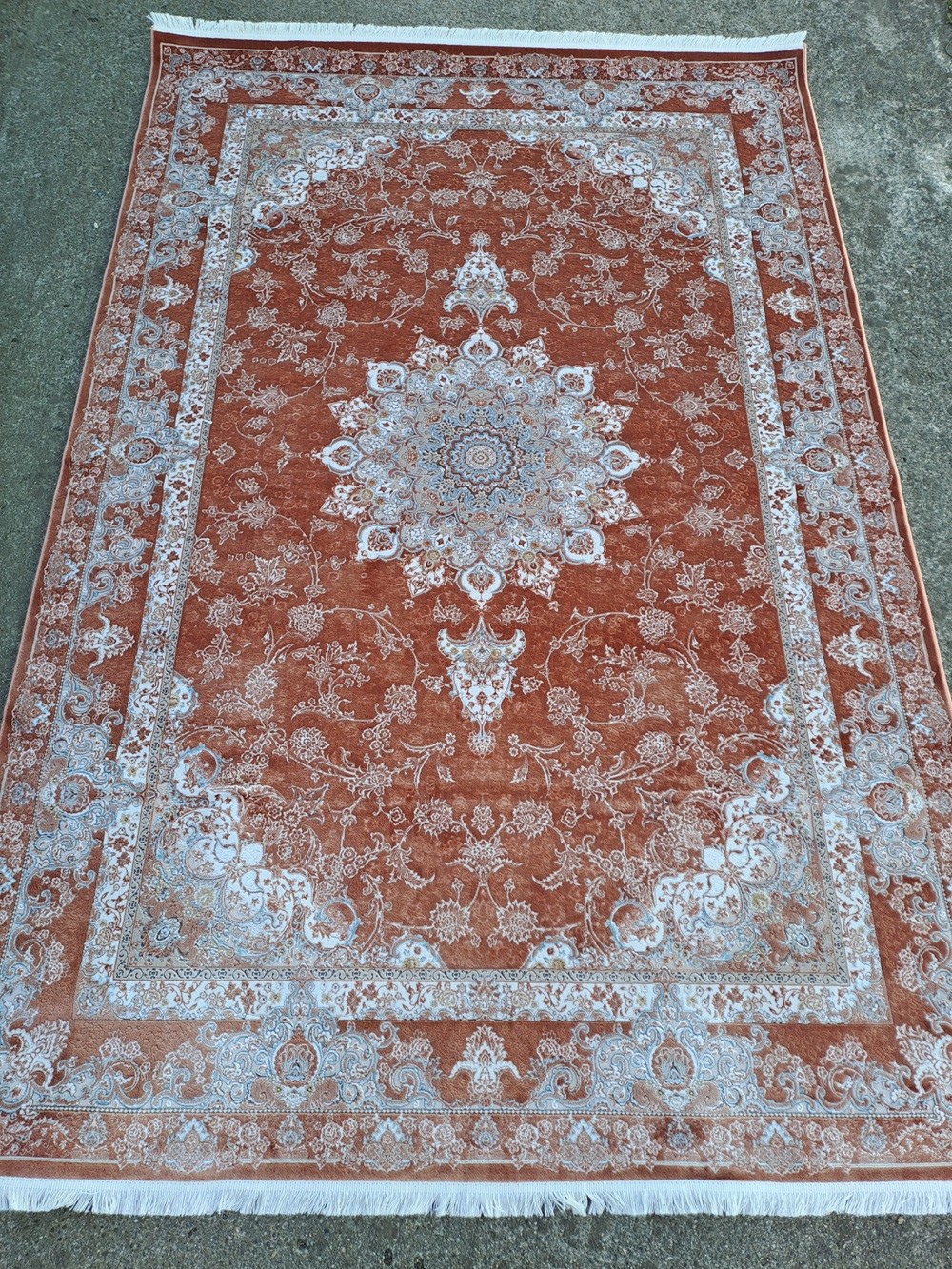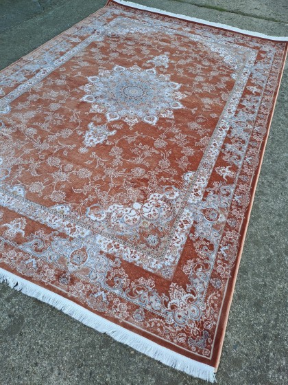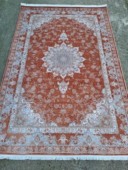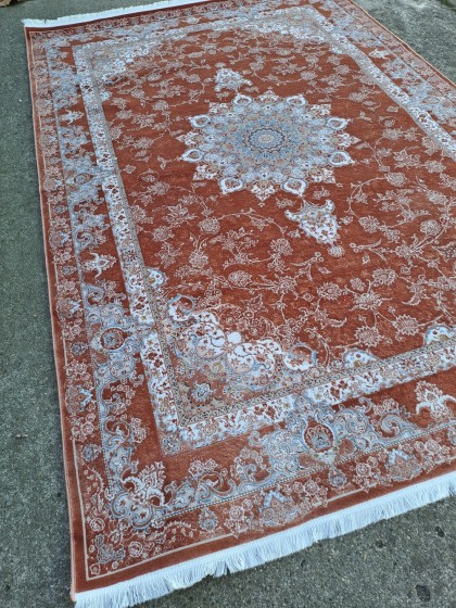 Este un covor pe fond cărămiziu cu model clasic ivoar. Are rozetă clasică pe mijloc.