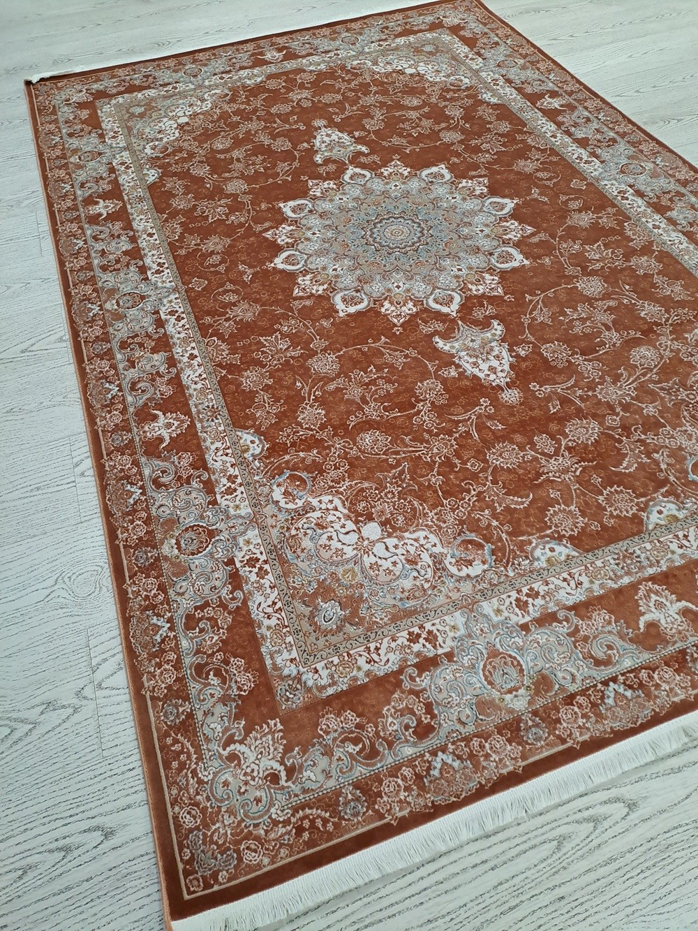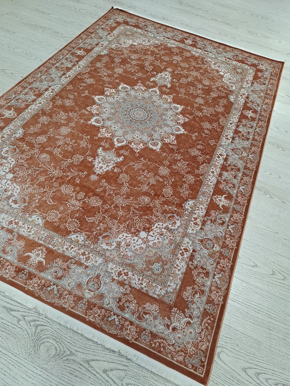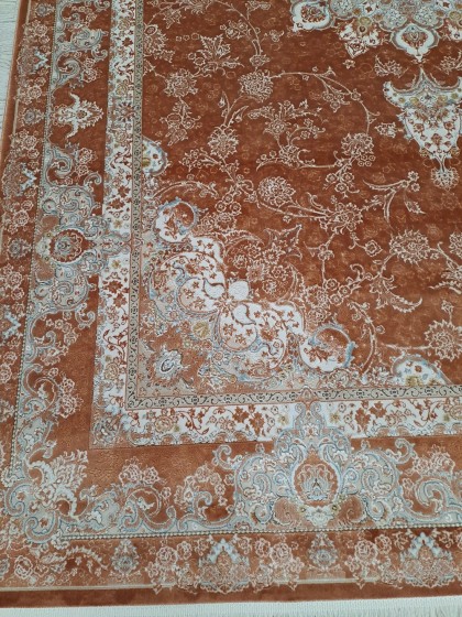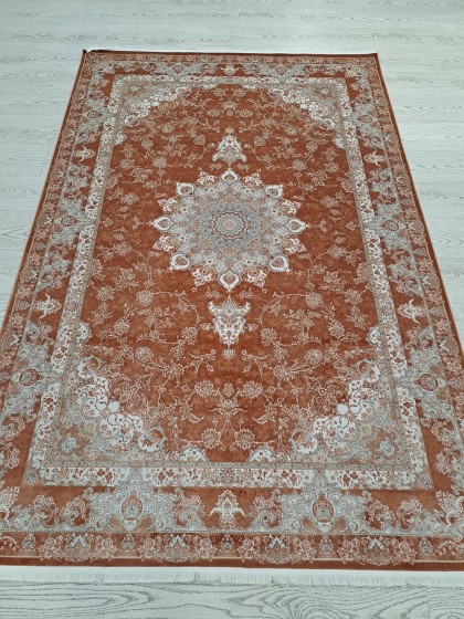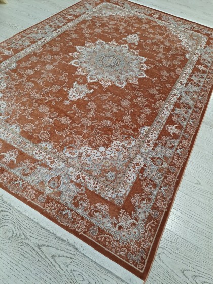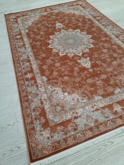 Este un covor pe fond cărămiziu cu model clasic ivoar. Are rozetă clasică pe mijloc.