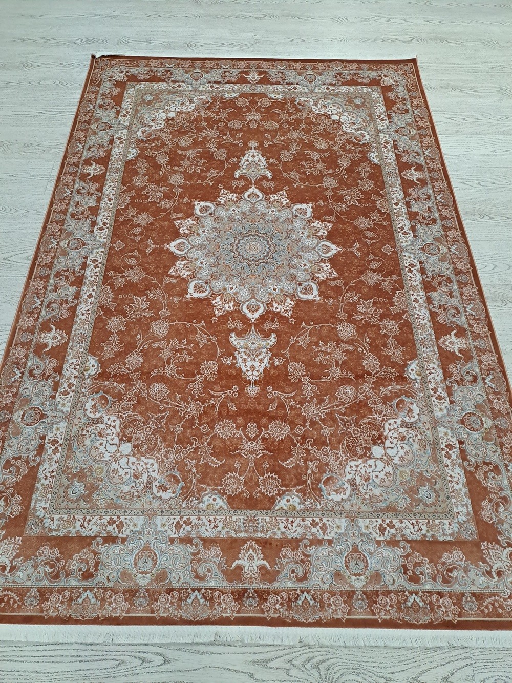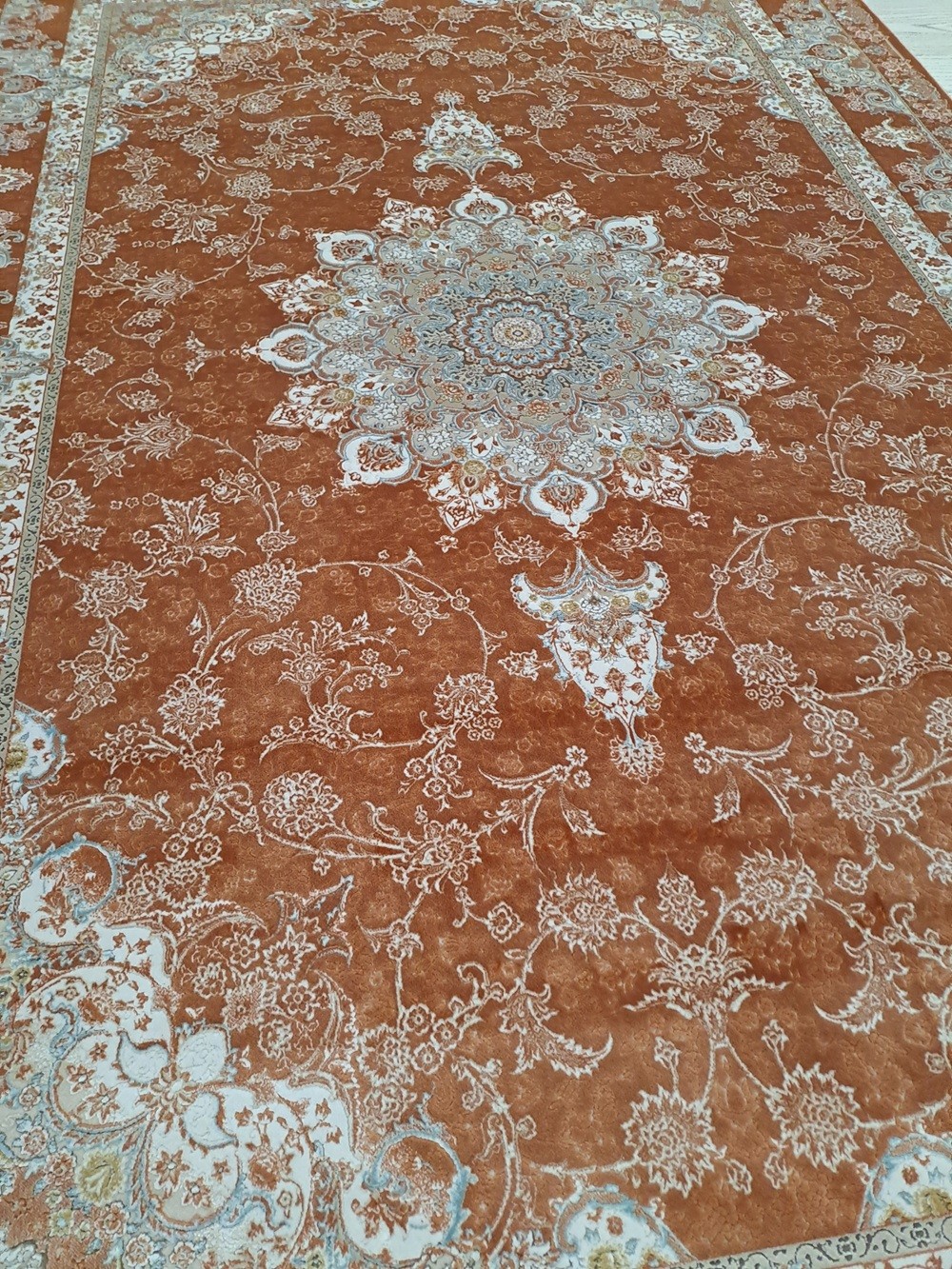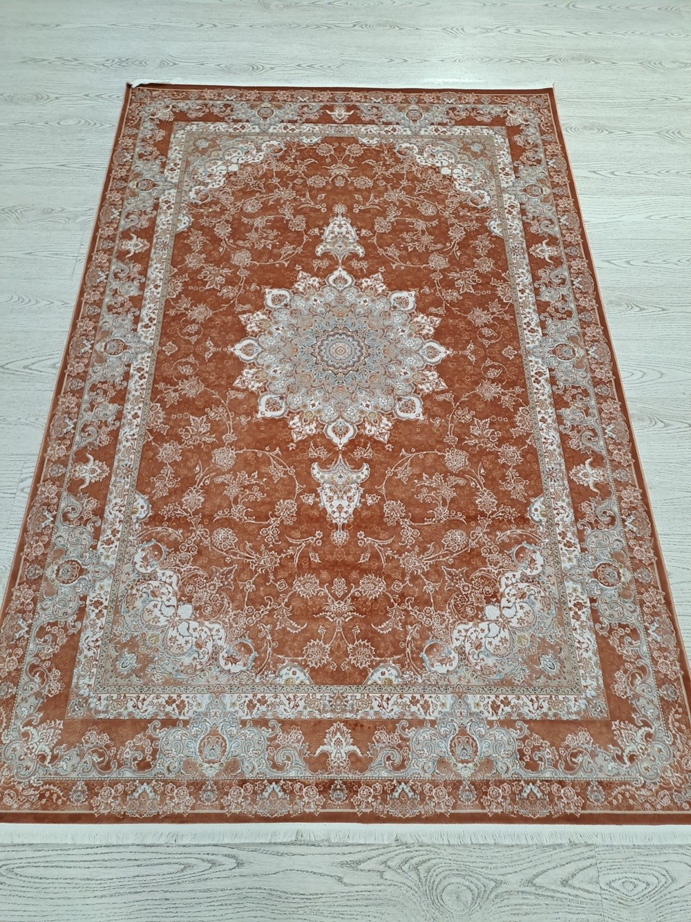 Este un covor pe fond cărămiziu cu model clasic ivoar. Are rozetă clasică pe mijloc.