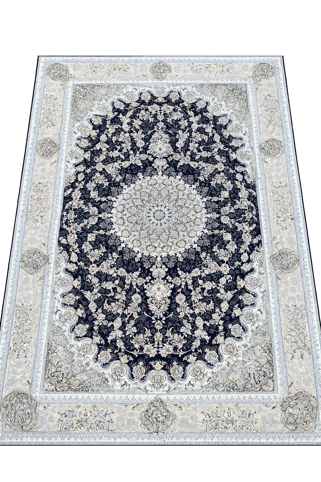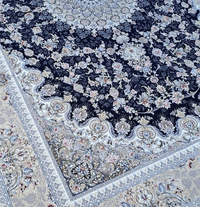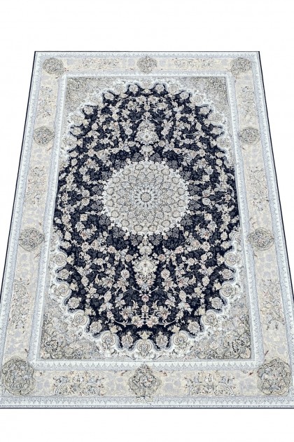 Este un covor bleumarin cu model floral oriental. pe mijloc are rozetă cu model oriental.