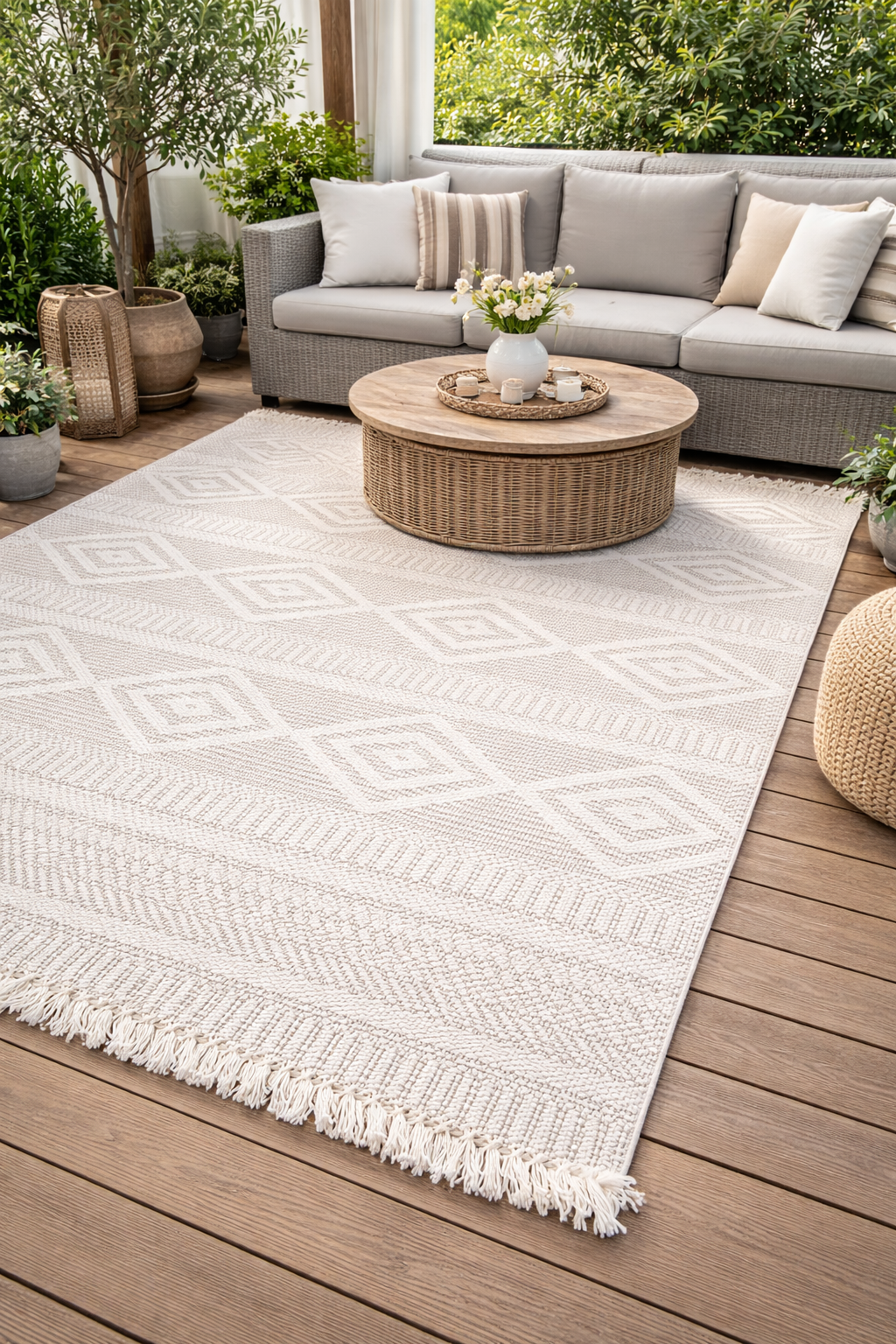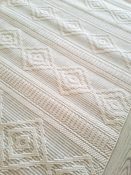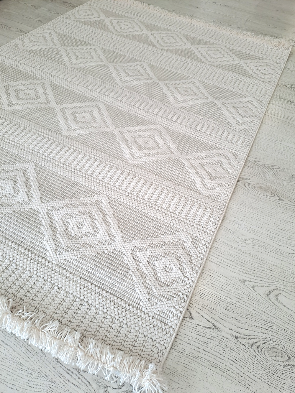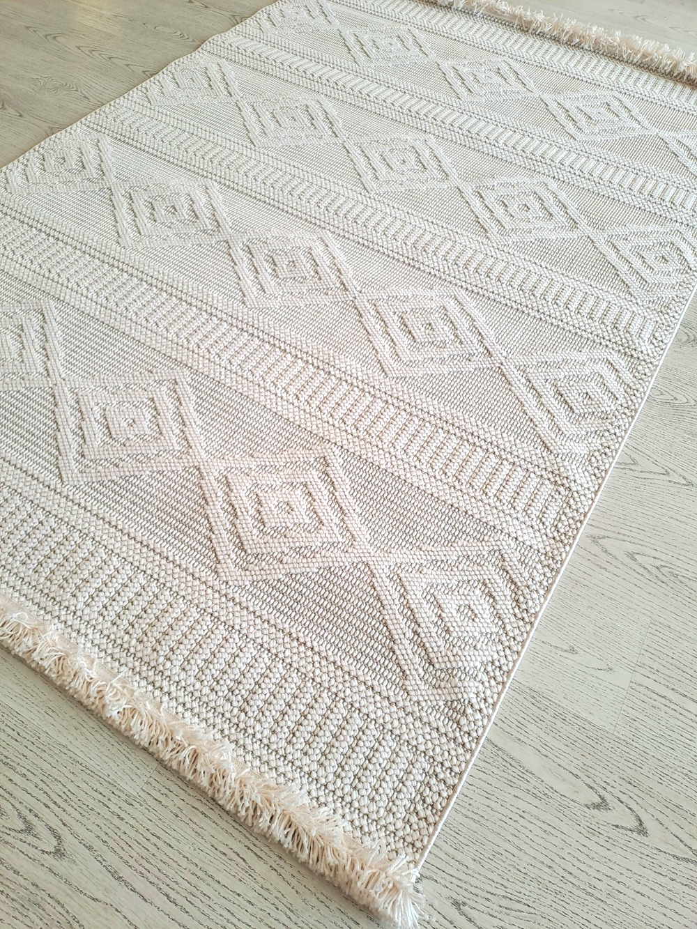 Este un covor crem cu model geometric (romburi), cu franjuri la capete potrivit pentru stil rustic sau chiar terase.