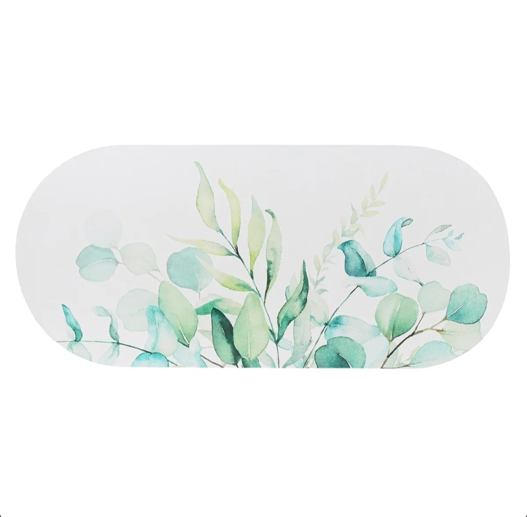 Covor de baie oval alb imprimat cu frunze verzi 45/100cm