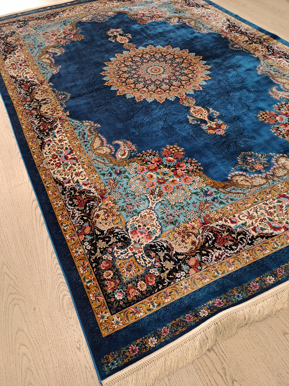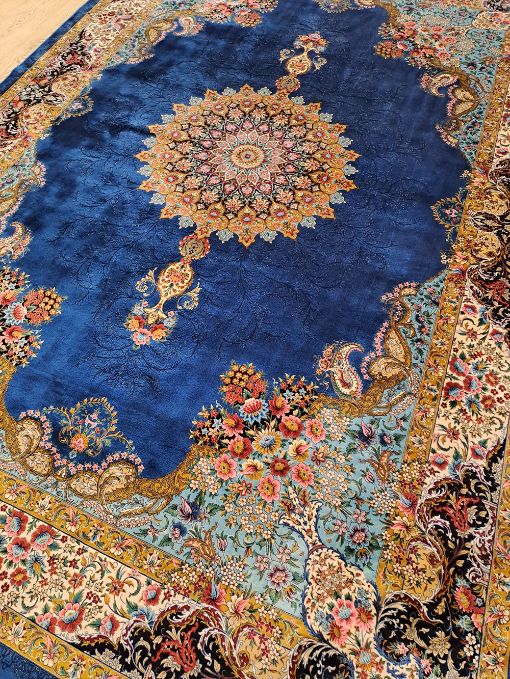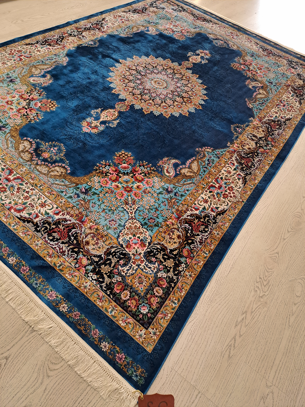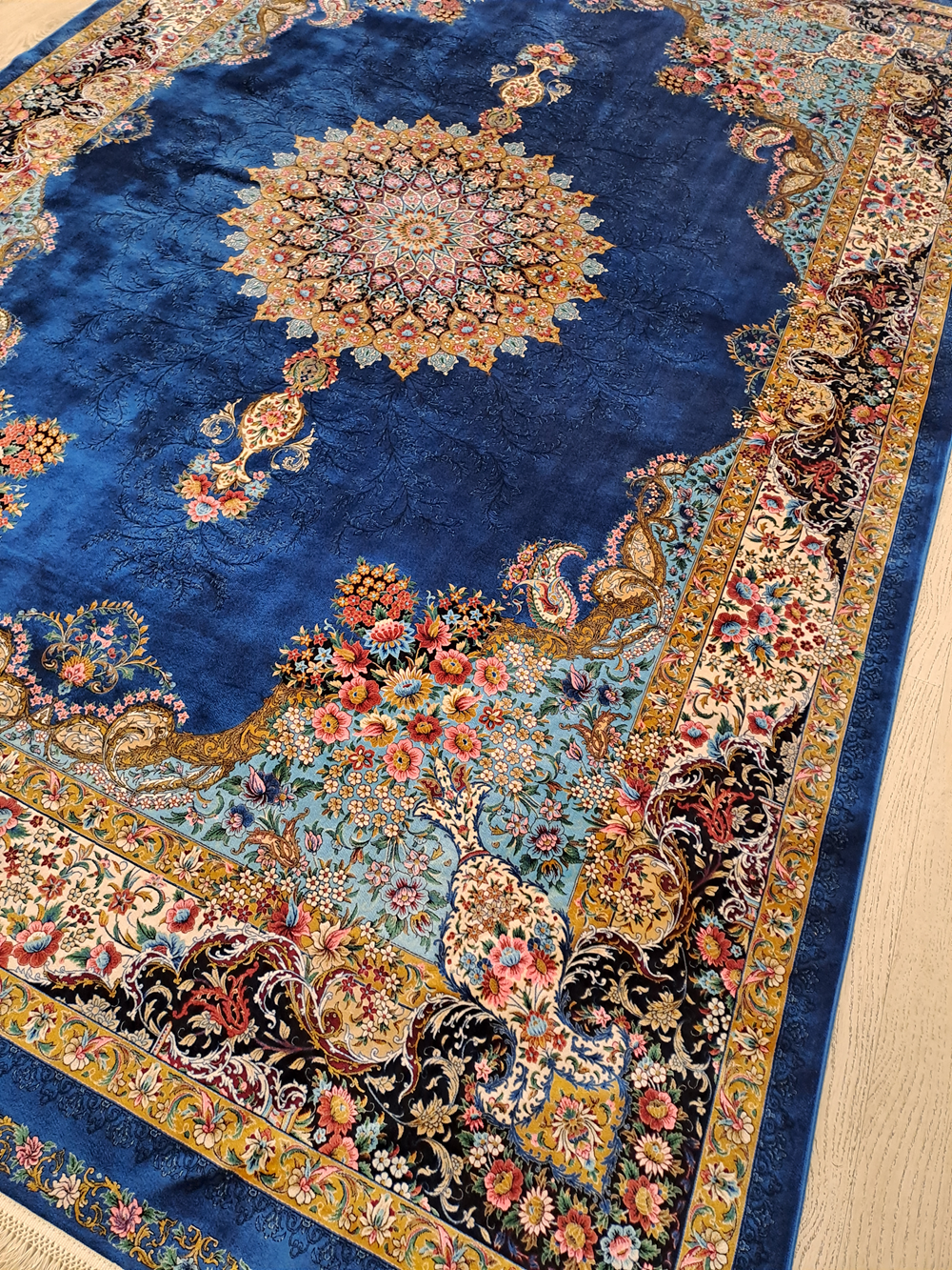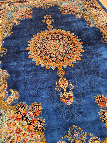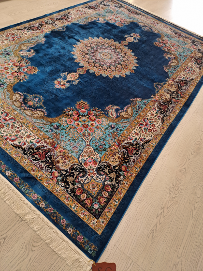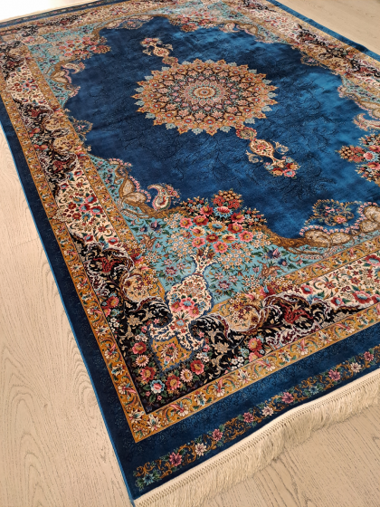 Este un covor din mătase albastru închis cu model oriental colorat.
