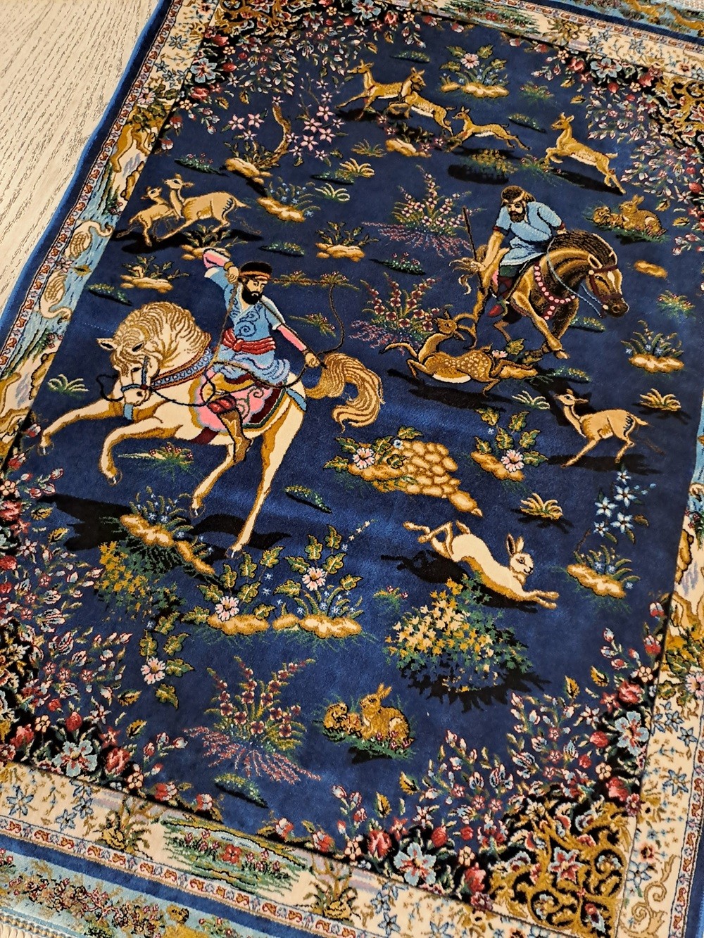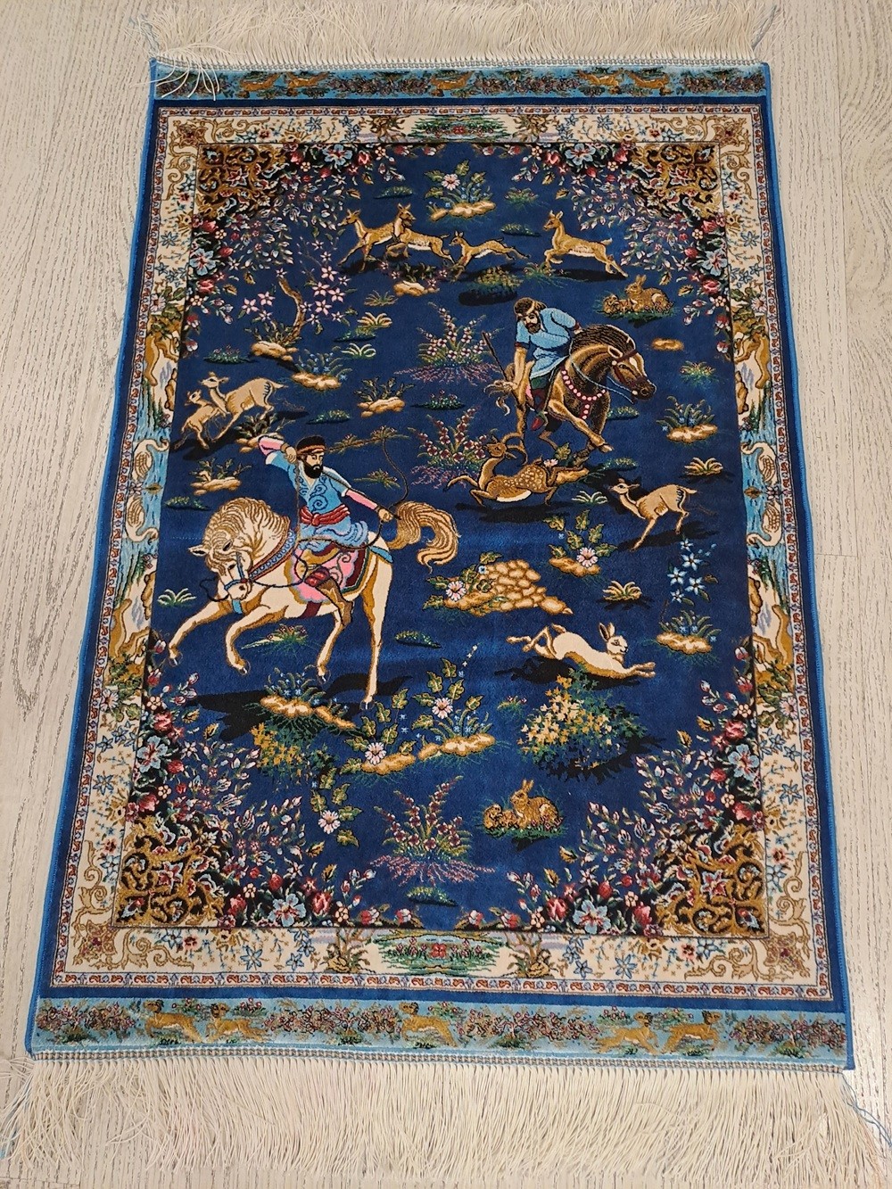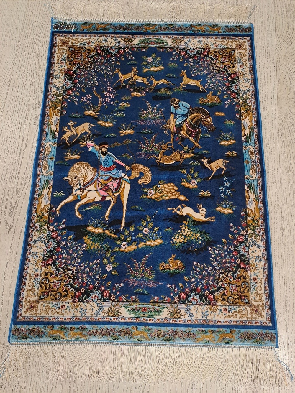 Este un covor de mici dimensiuni din mătase albastru închis cu scene de vânătoare.