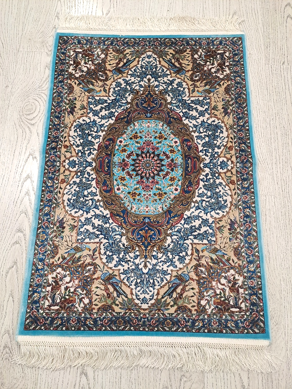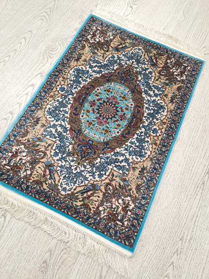 Este un covor de mici dimensiuni din mătase pe fond ivoar cu chenare turcoaz și model oriental colorat.