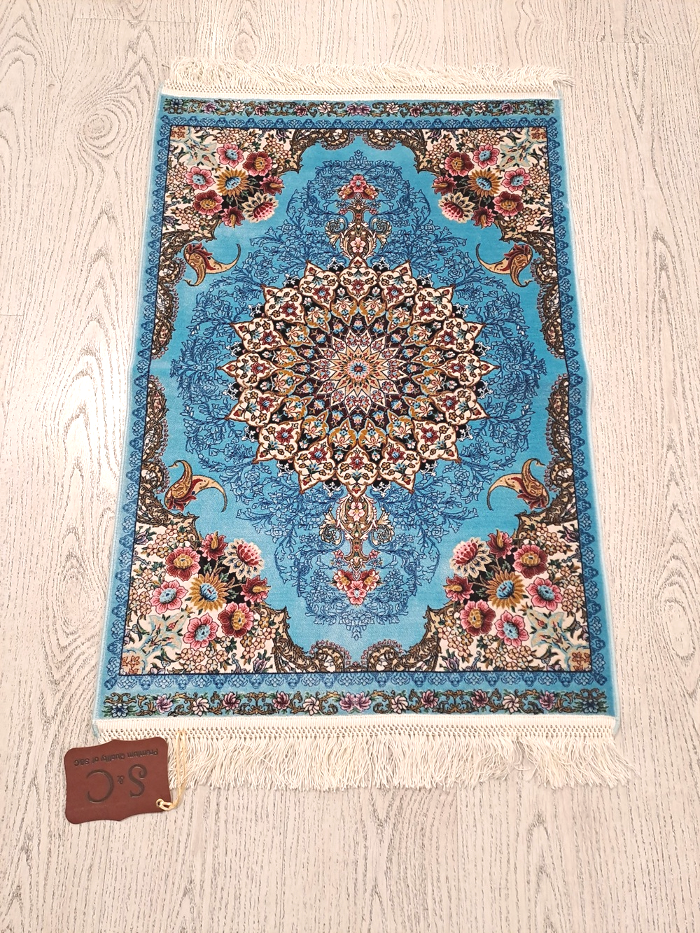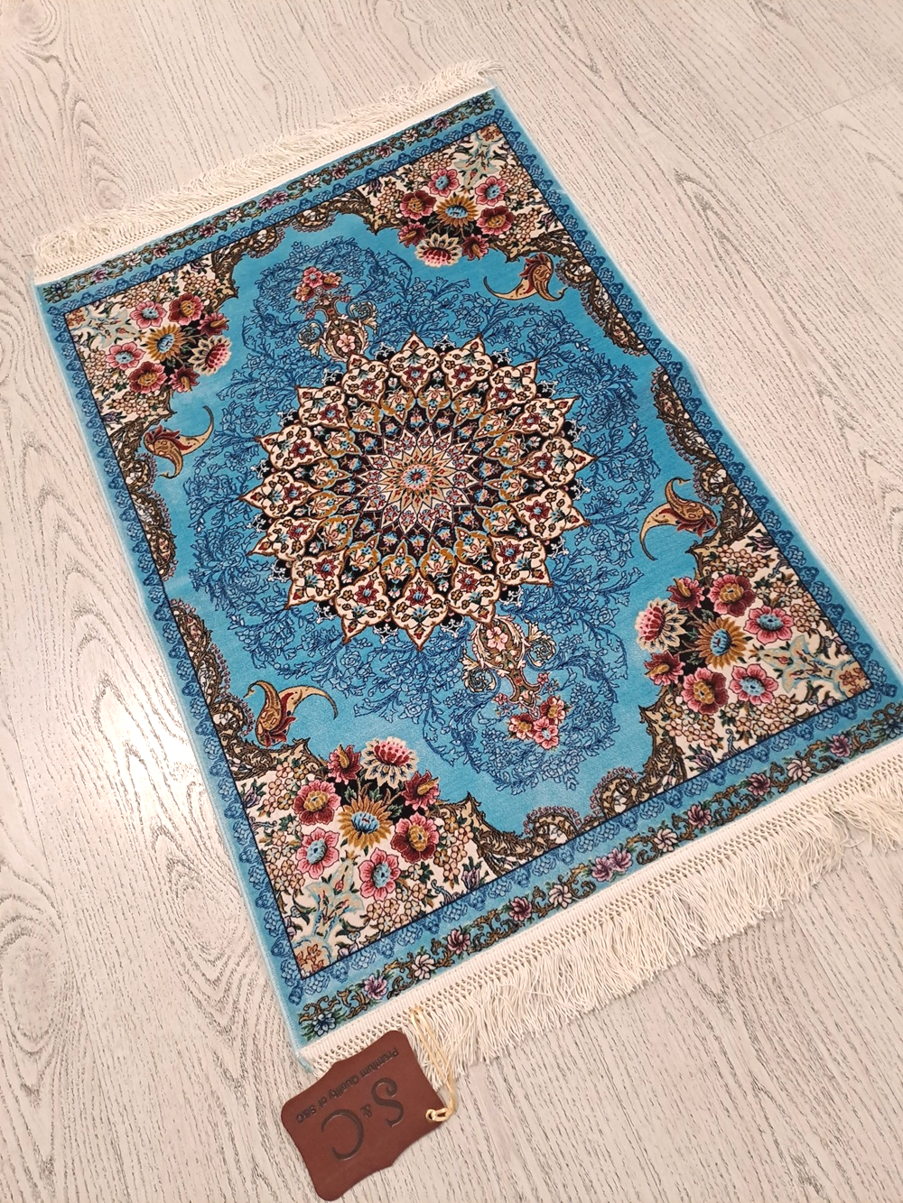Este un covor din mătase de mici dimensiuni pe fond albastru turcoaz cu model oriental colorat.