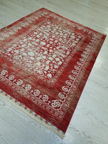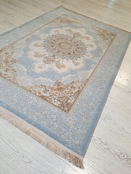 Covor din mătase pe fond albastru turcoaz cu scene de vânătoare din Persia antică și elemente din natură. Este o adevărată operă de artă, combinând măiestria artizanală cu simbolismul istoric și estetic.