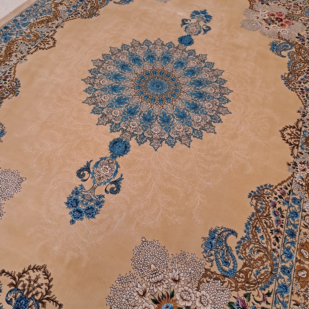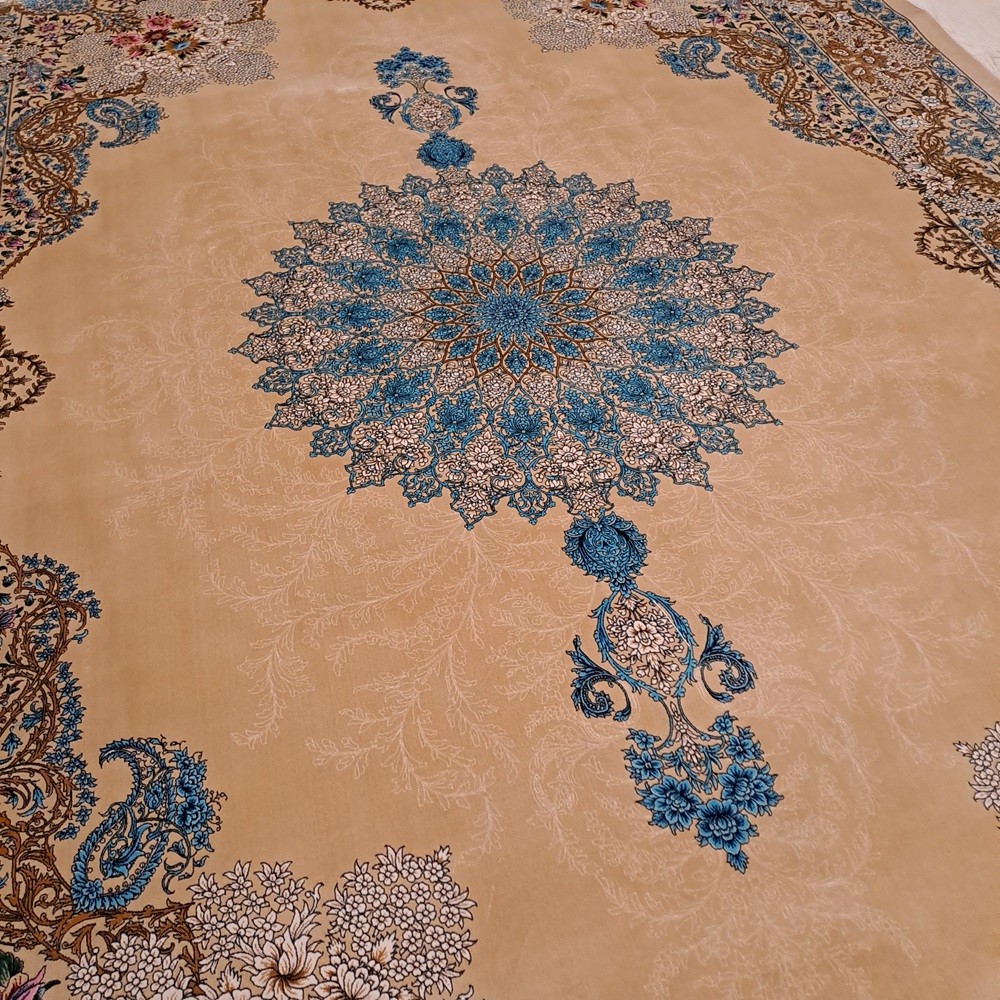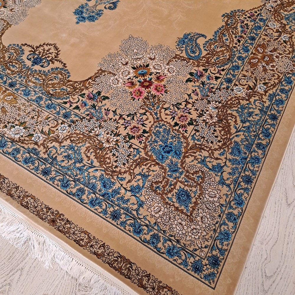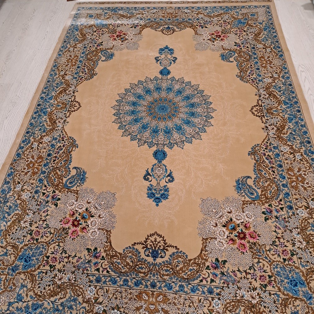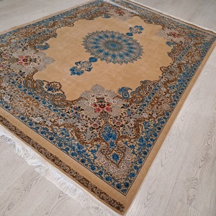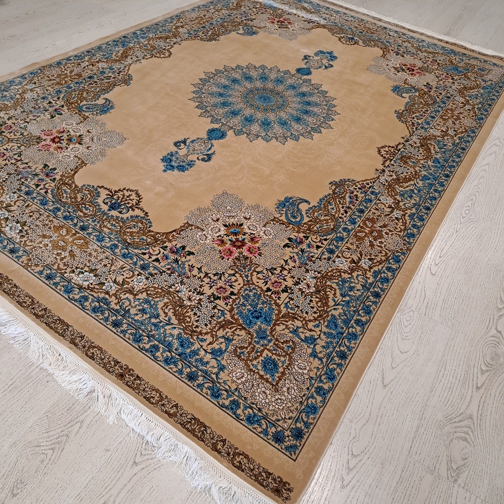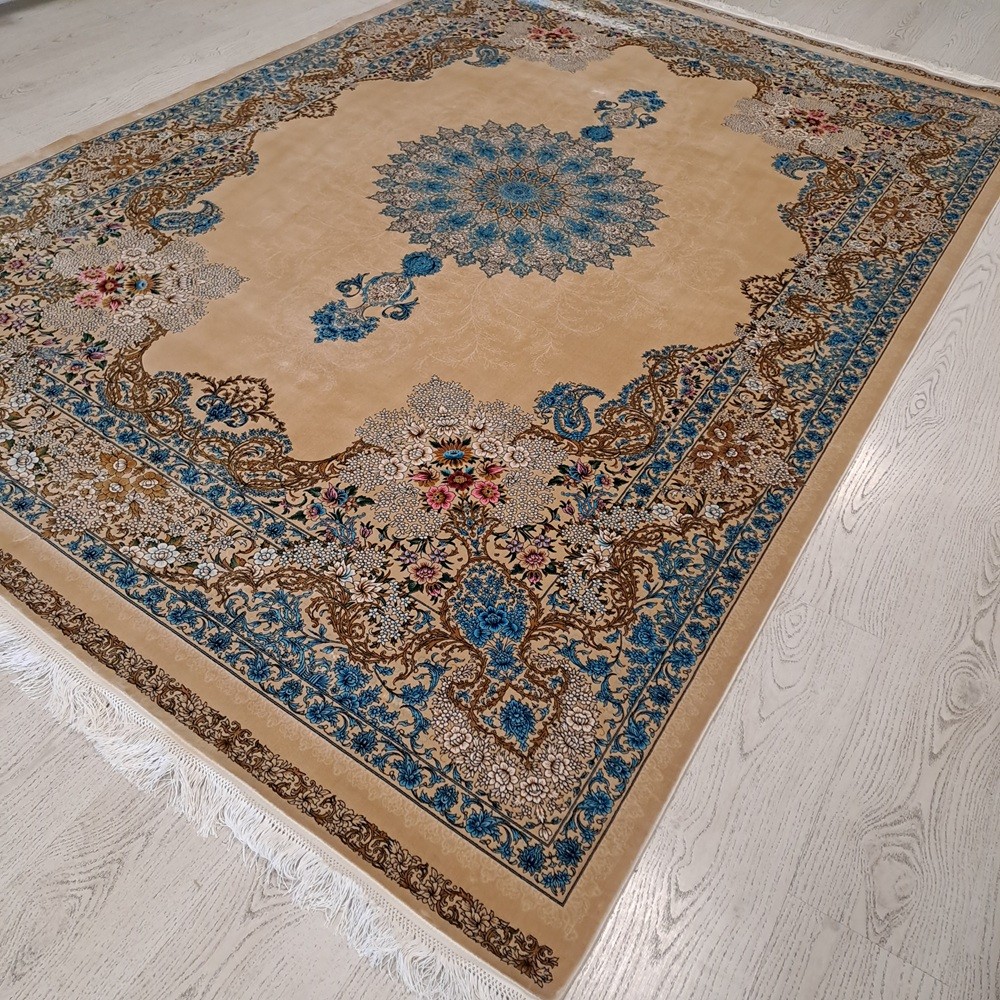 Este un covor pe fond bej cu model clasic oriental predominat albastru.
