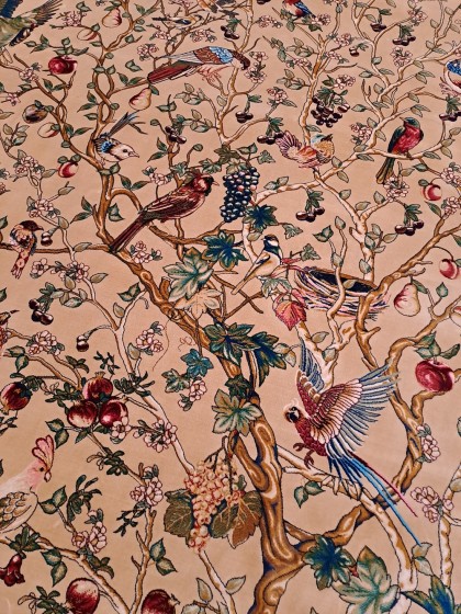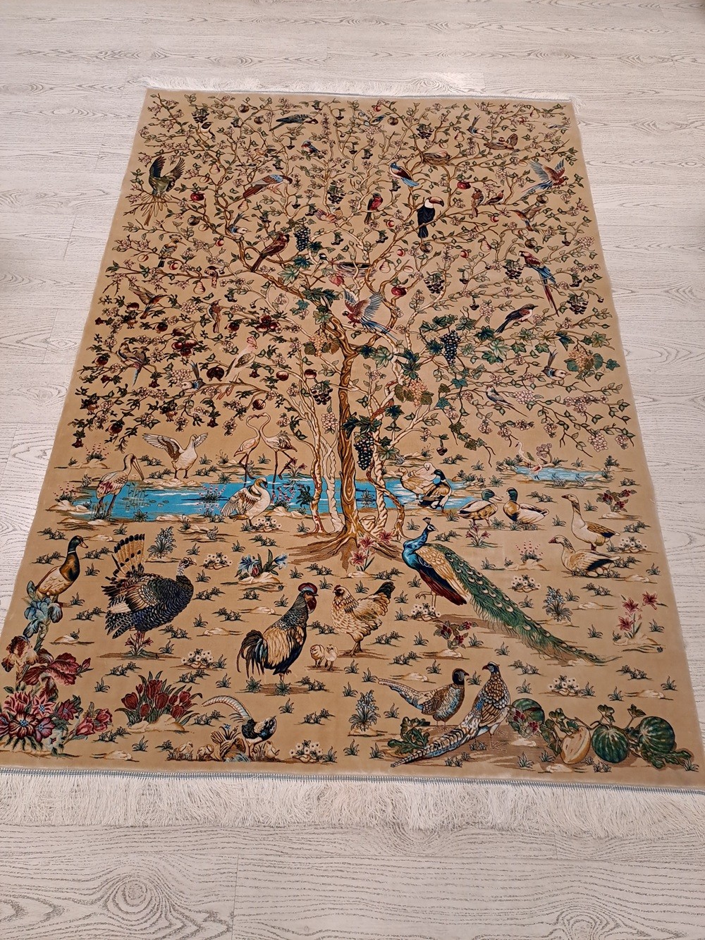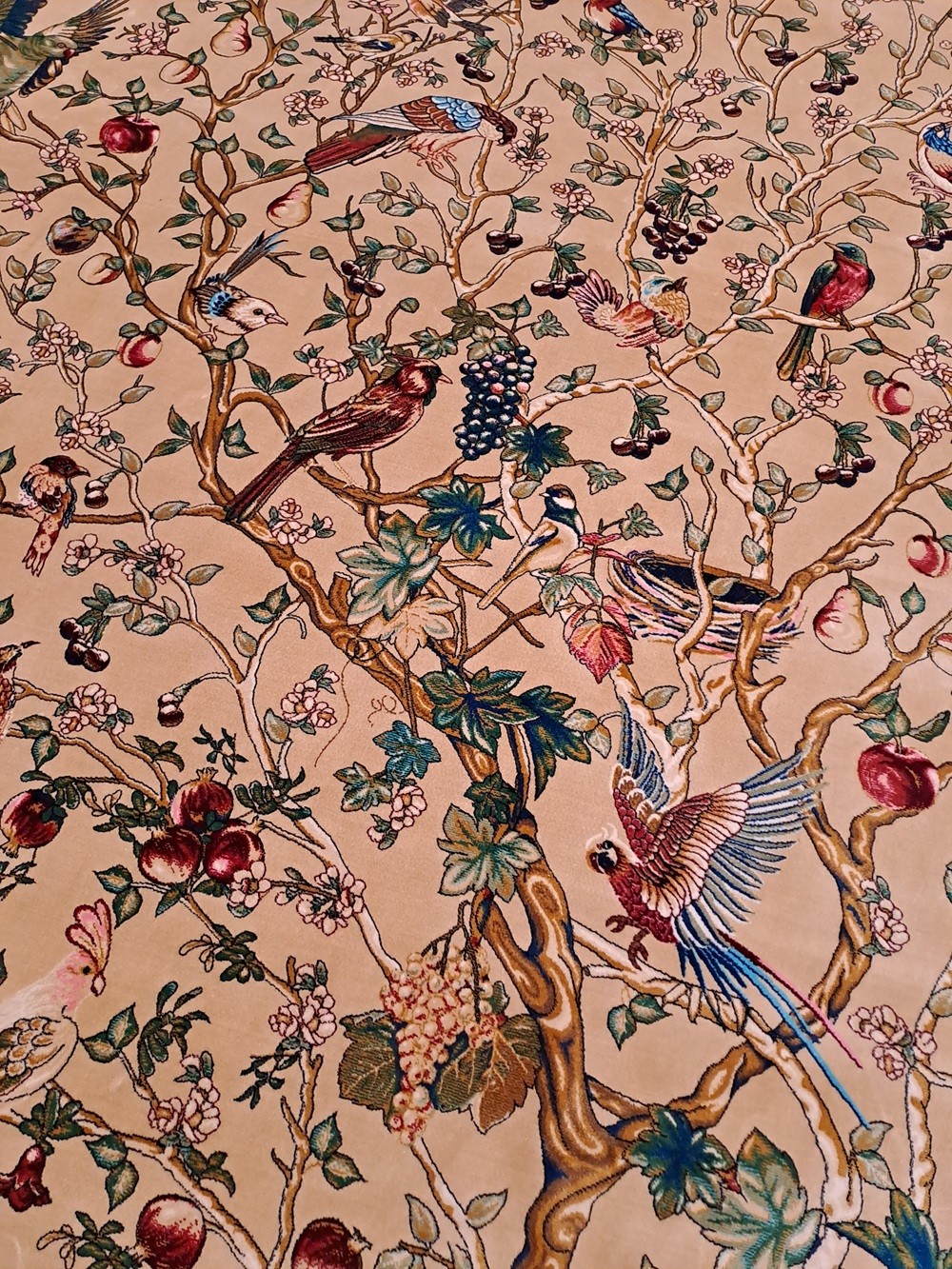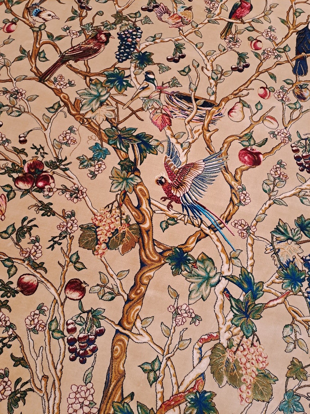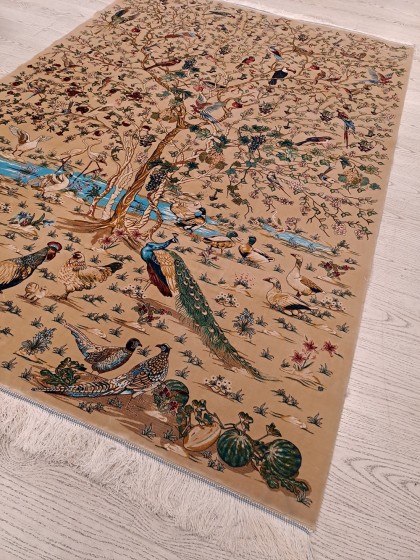 Este un covor din mătase pe fond bej cu păsări colorate.