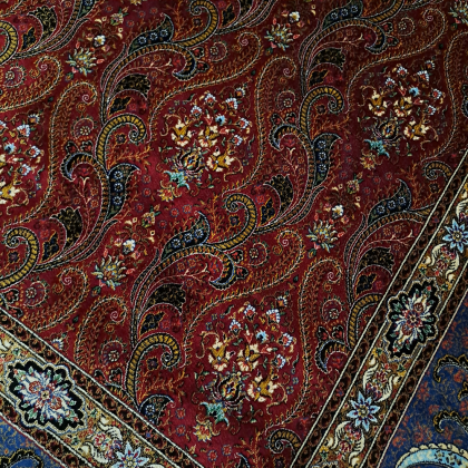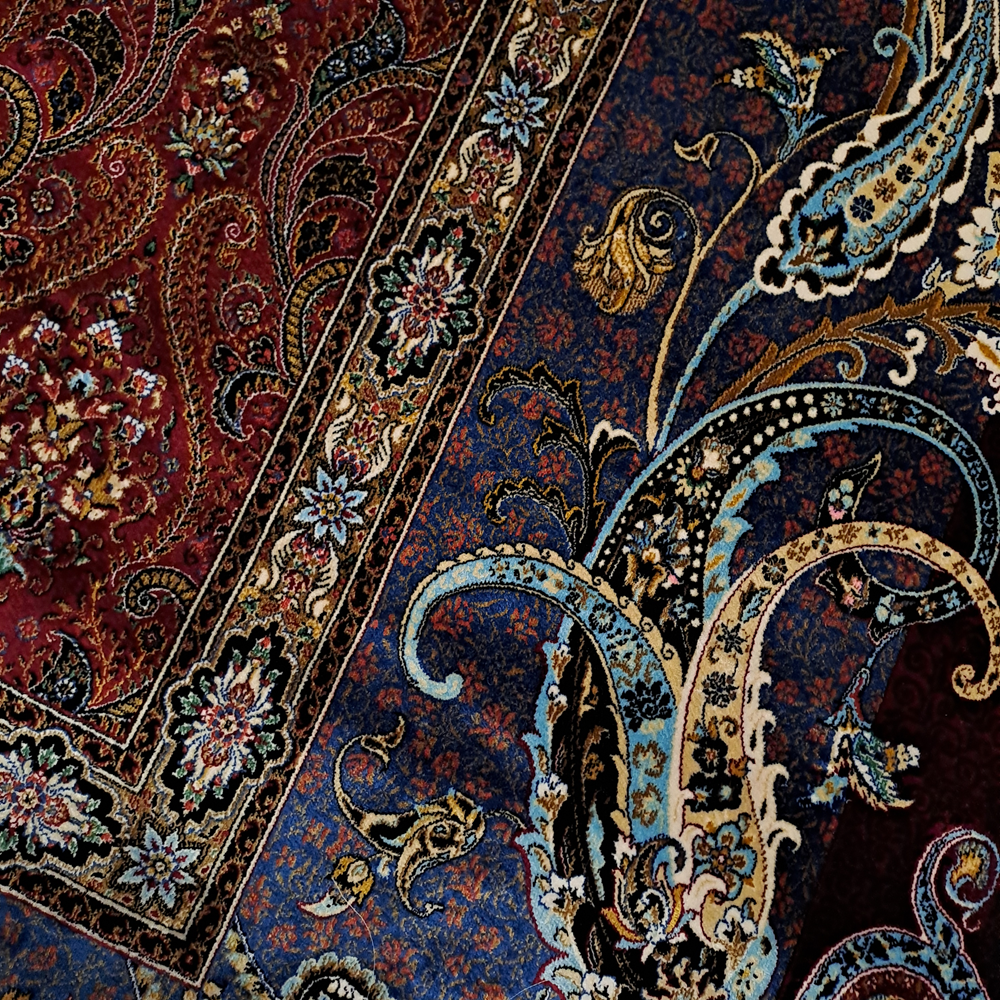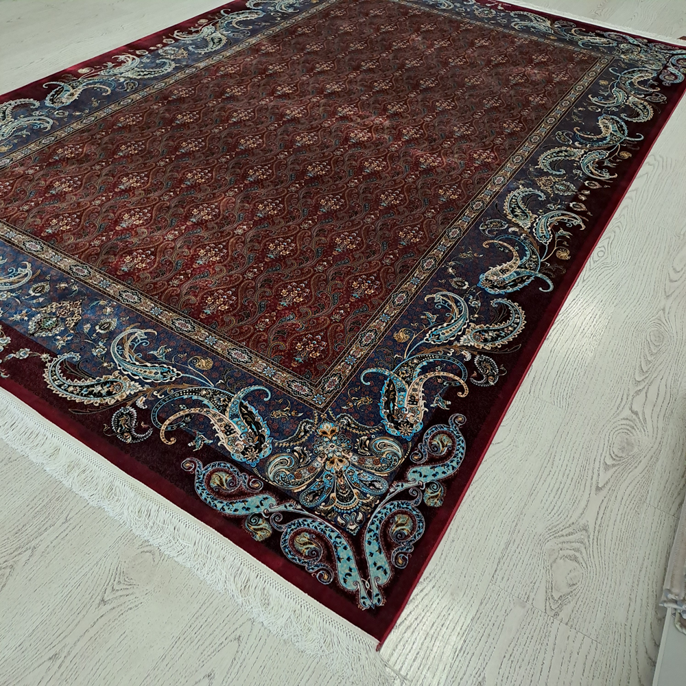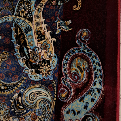 Este un covor bordo cu model floral oriental.
