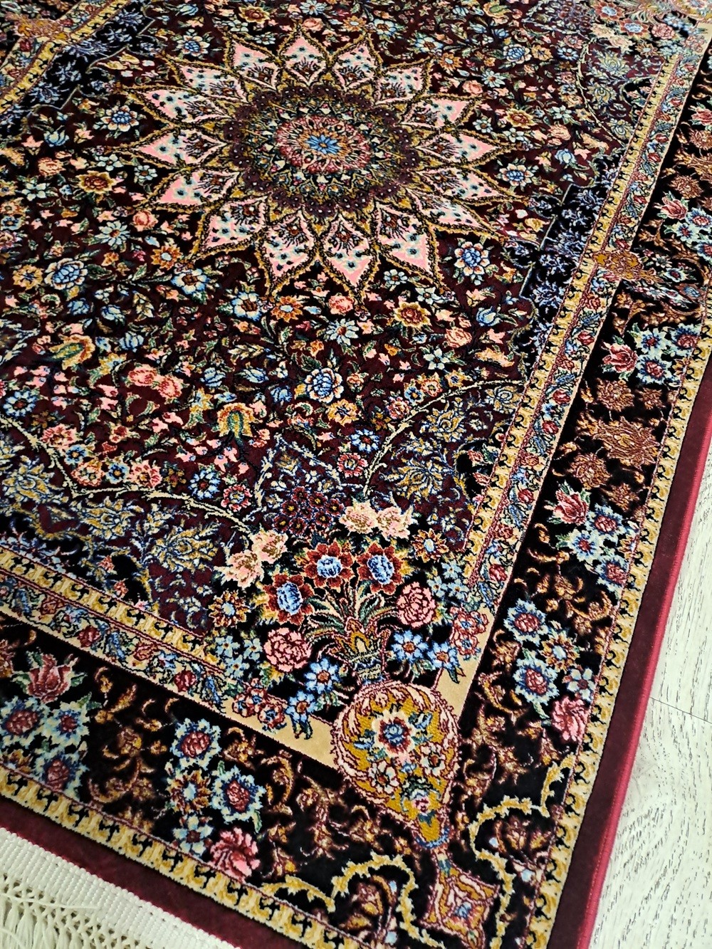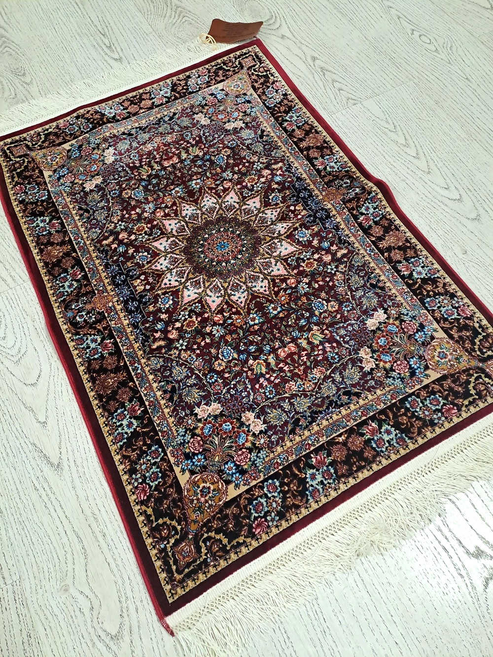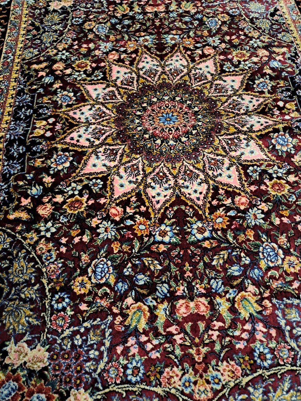 Este o carpetă din mătase bordo cu model oriental colorat.