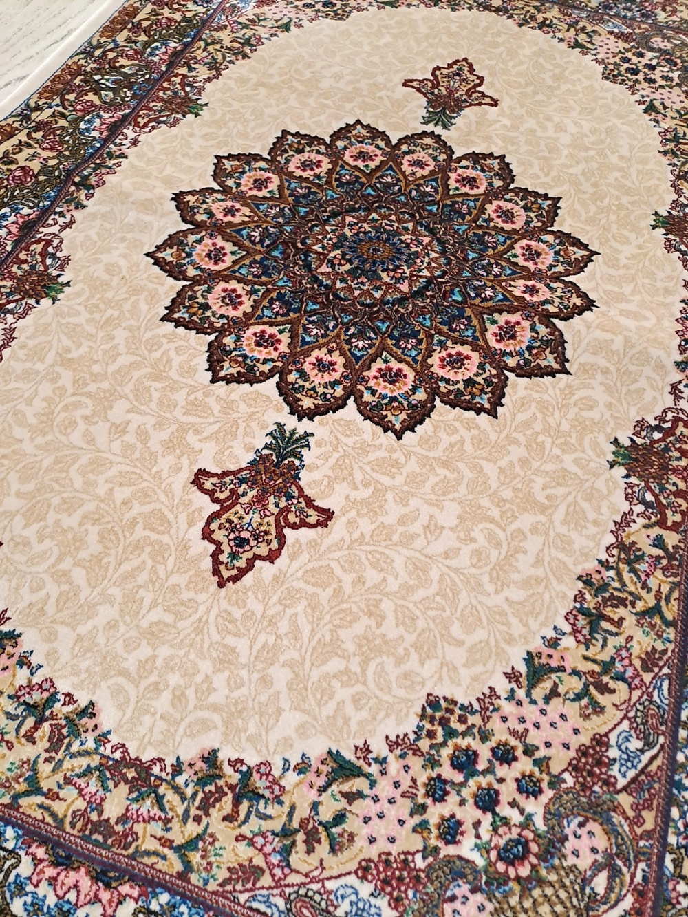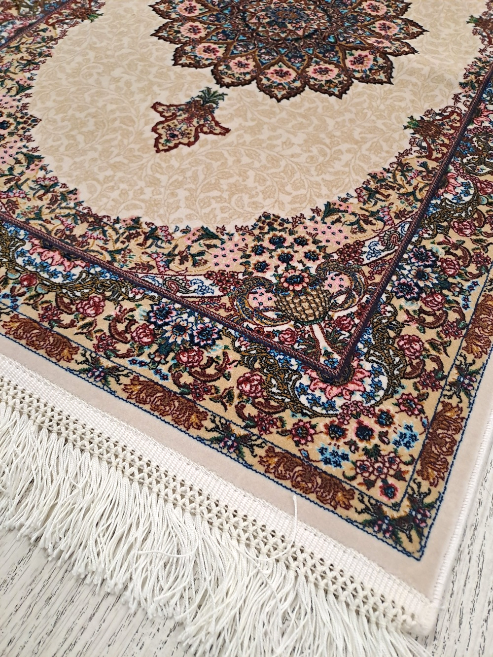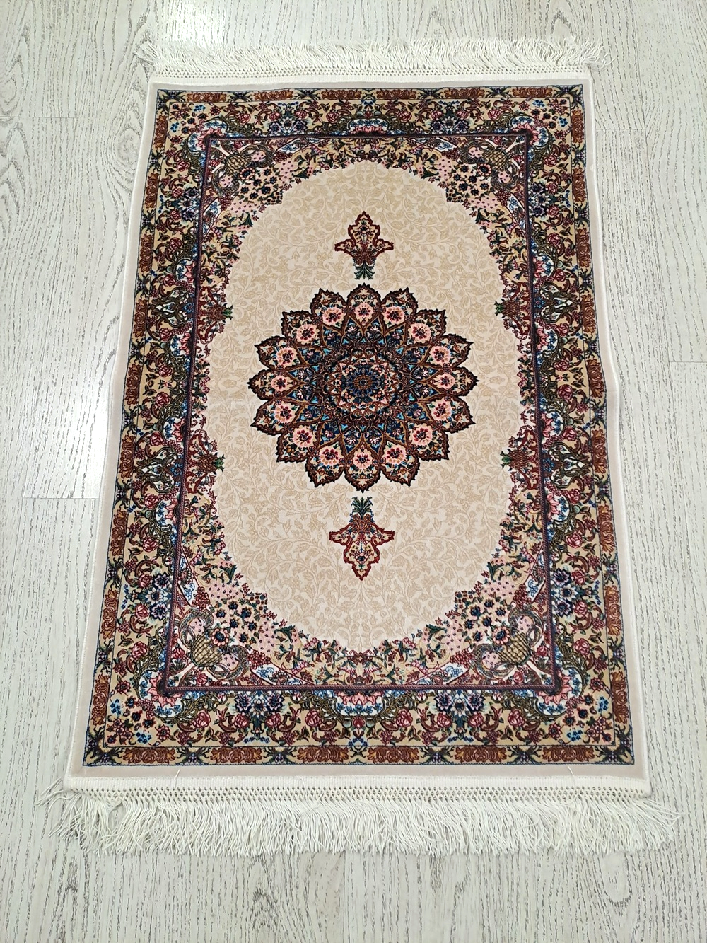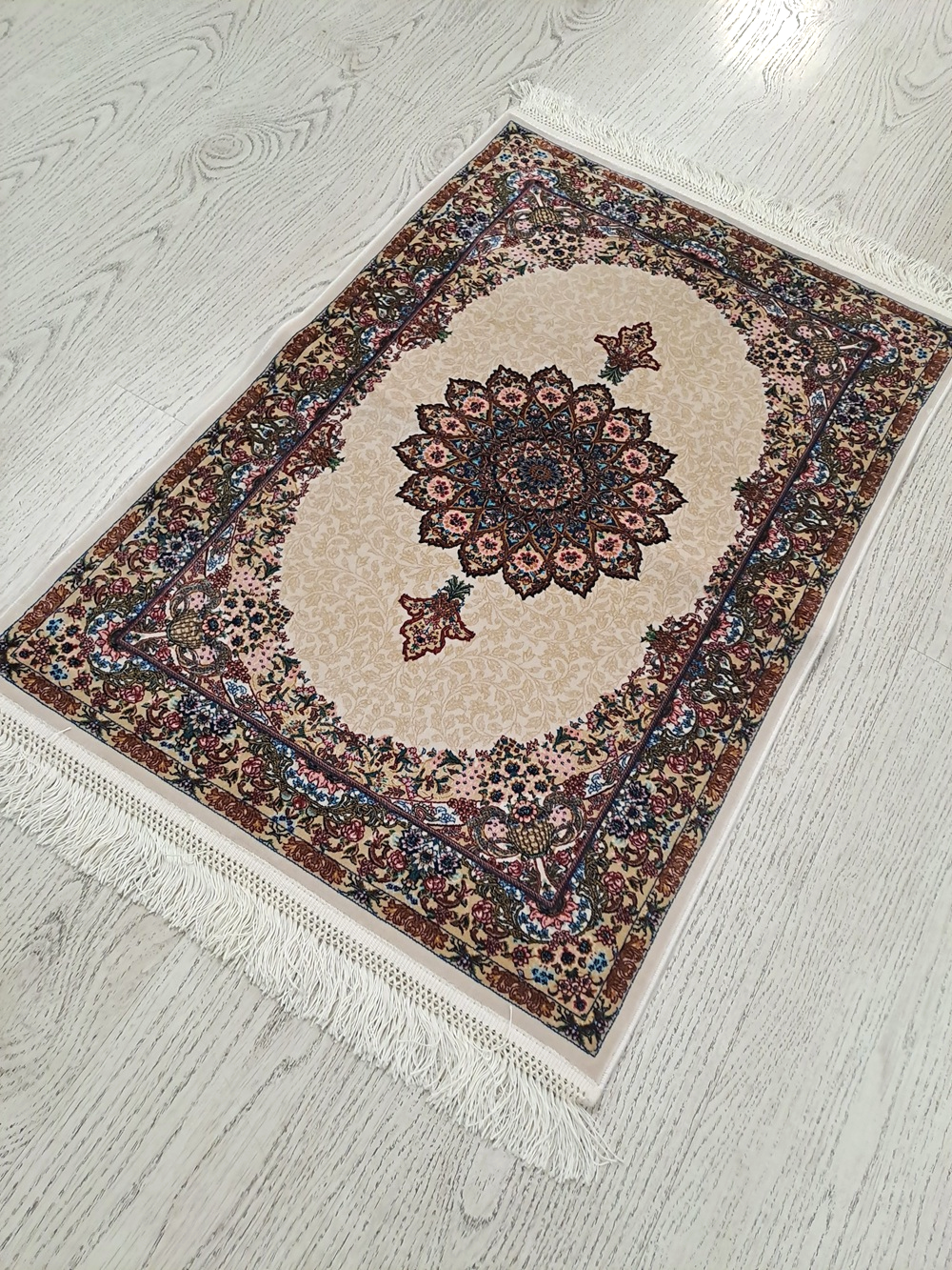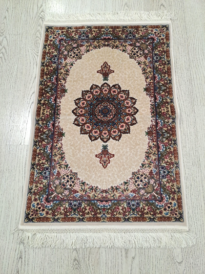 Este un covor din mătase de dimensiuni mici pe fond crem cu model oriental colorat. Pe mijloc are rozetă, iar modelul este unul vegetal.