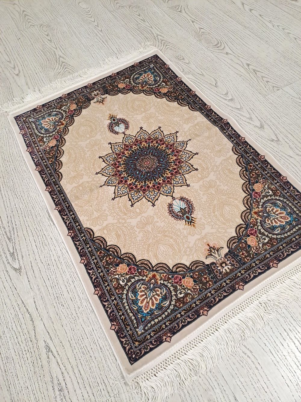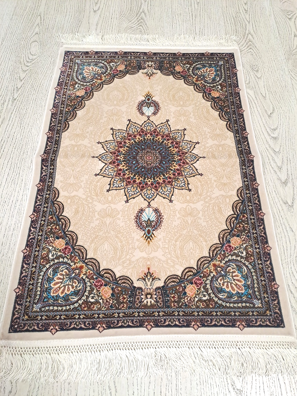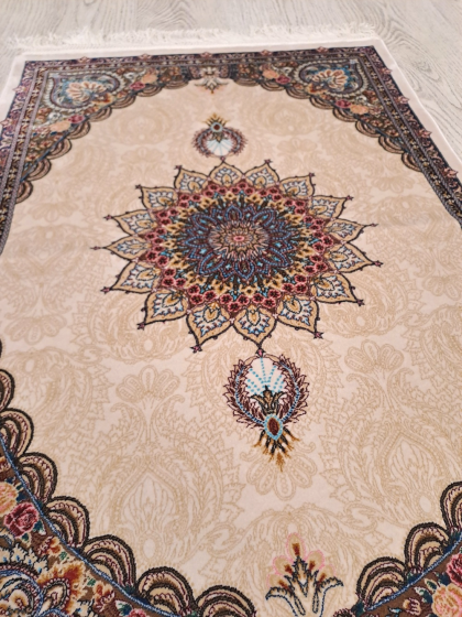 Este un covor din mătase de dimensiuni mici pe fond crem cu model oriental colorat. Pe mijloc are rozetă iar modelul este unul vegetal.