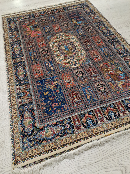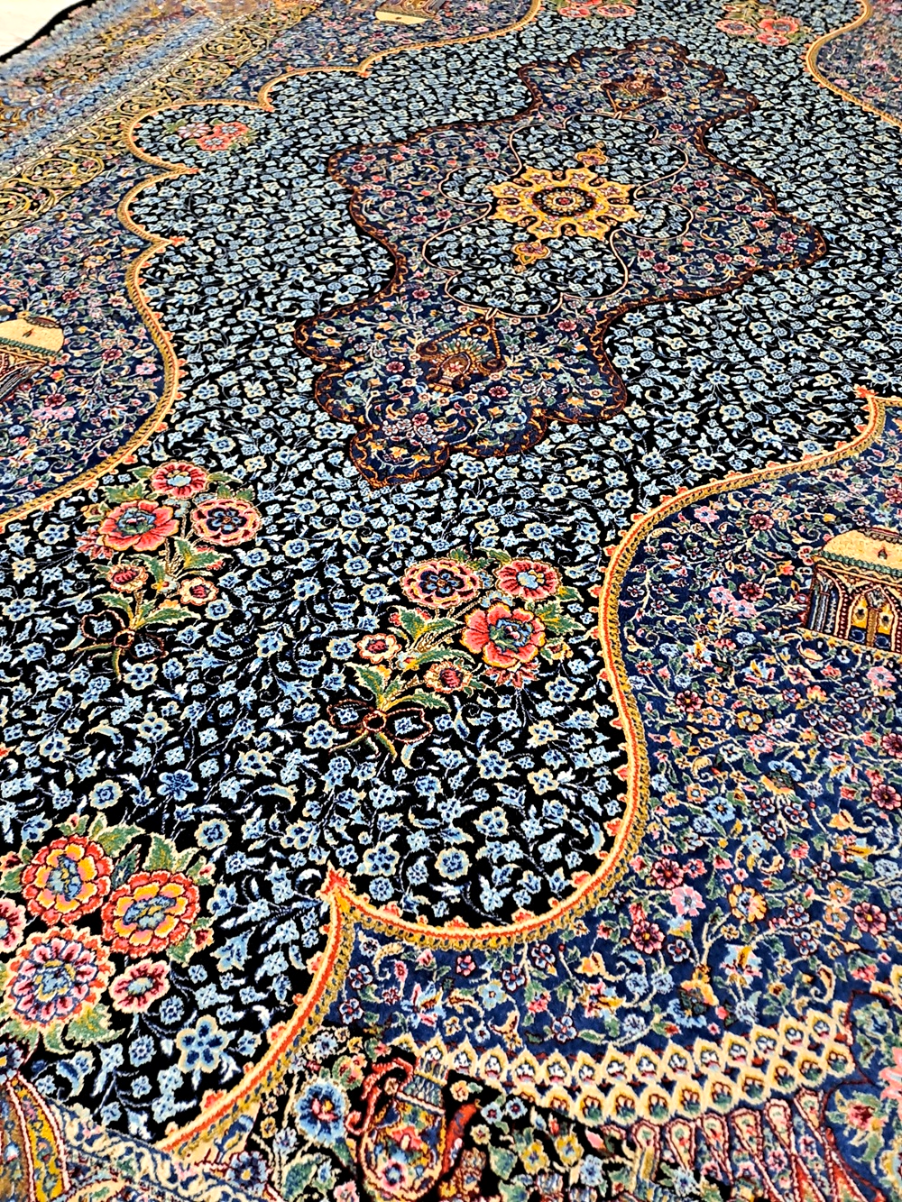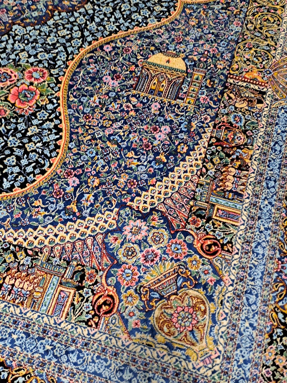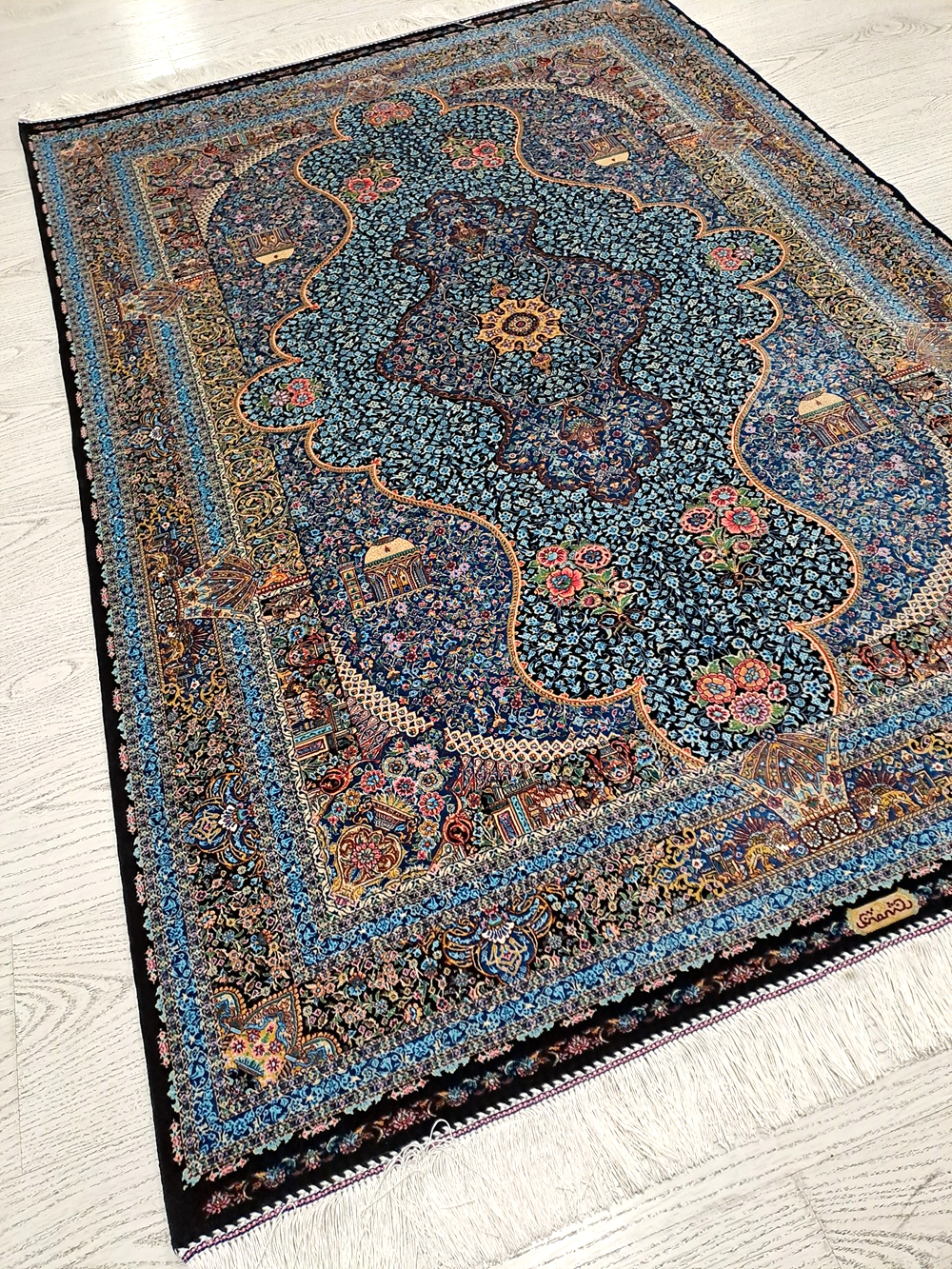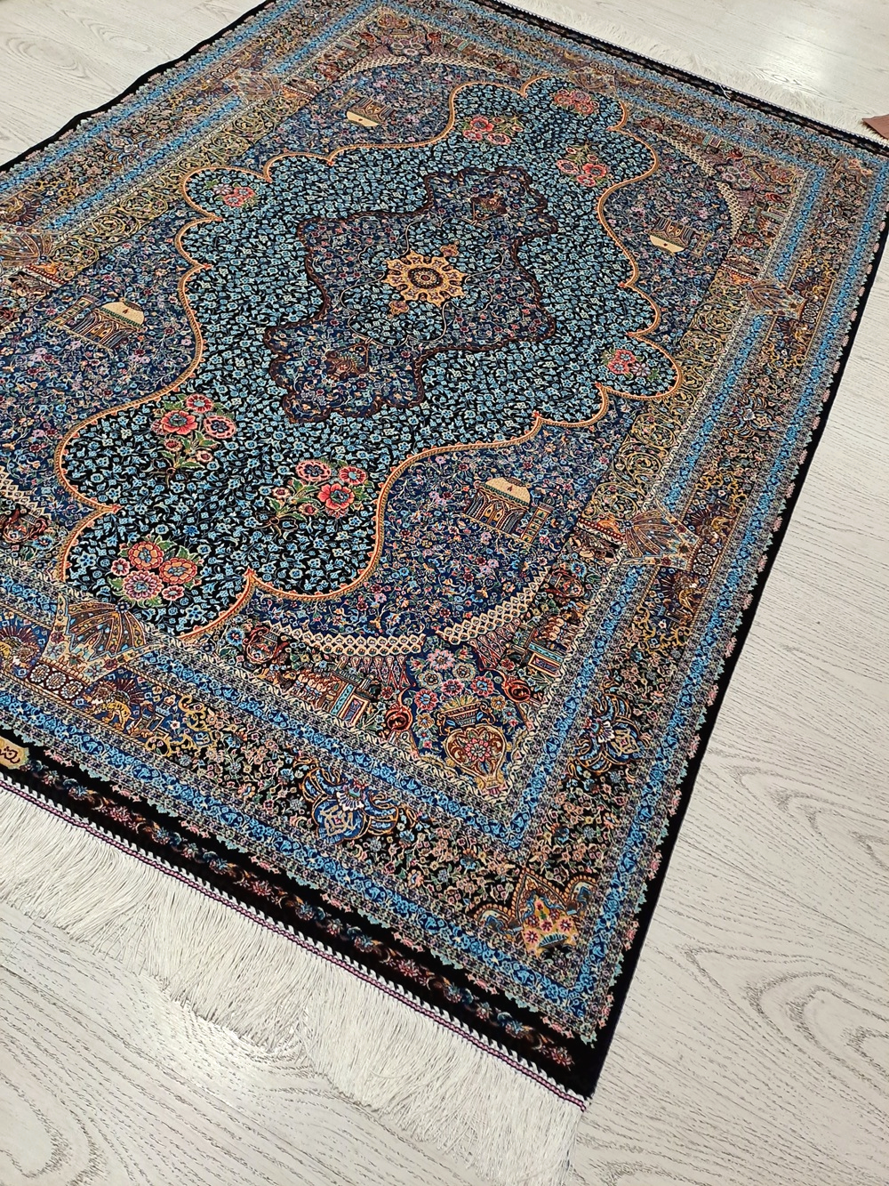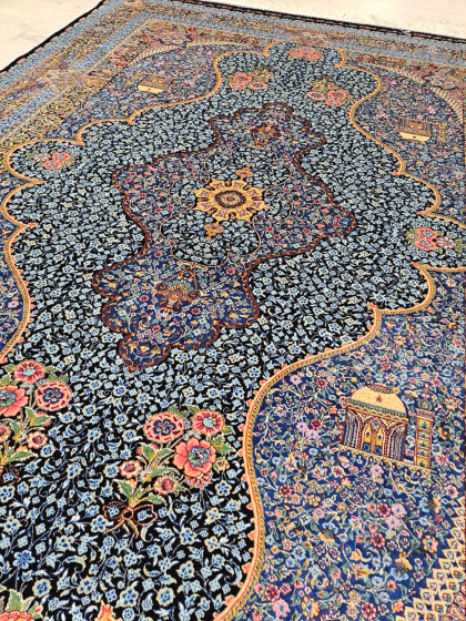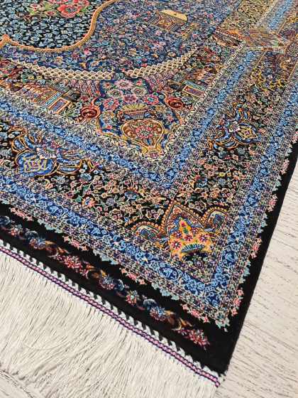 Este un covor din mătase pe fond negru cu model floral oriental predominant albastru turcoaz.