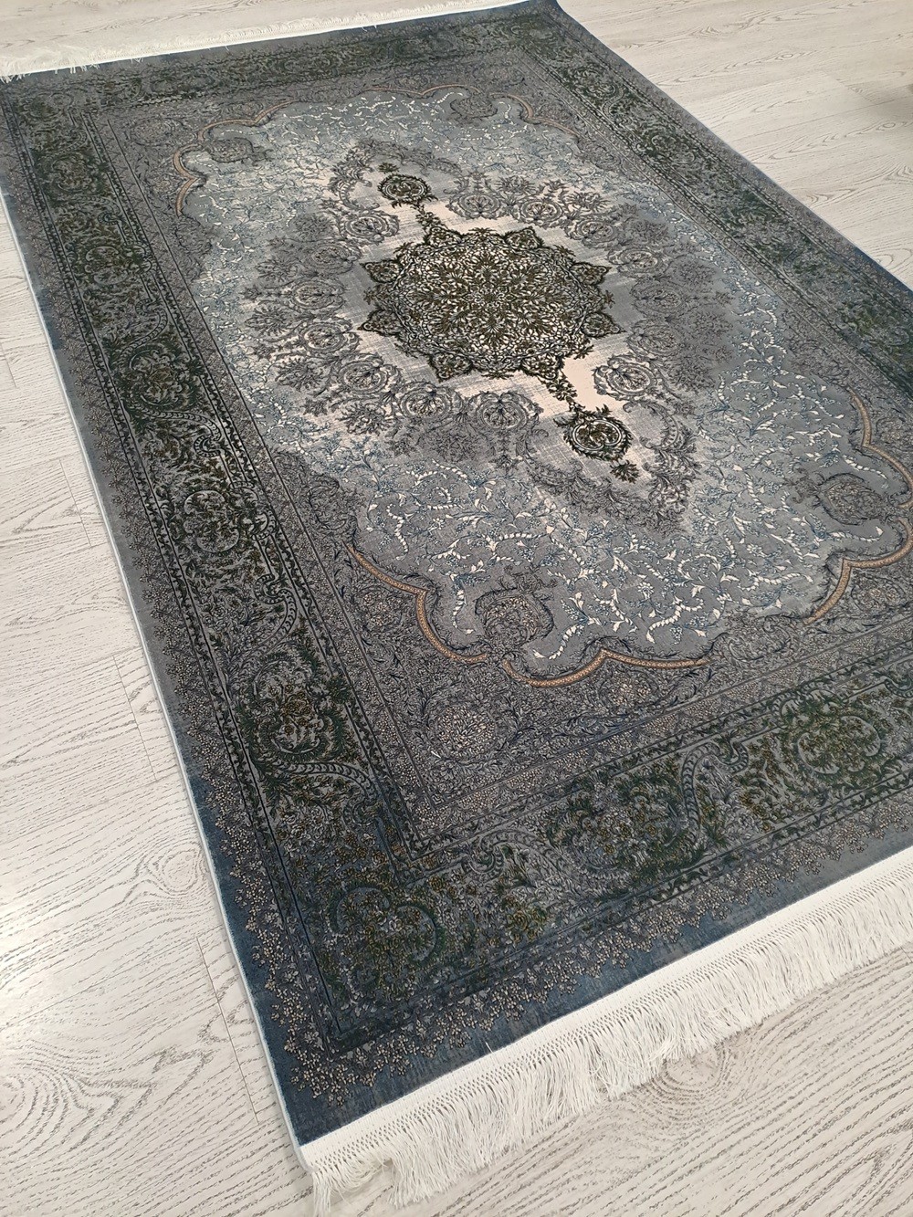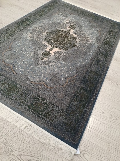 Este un covor în tonuri de gri cu model clasic dantelat verde cu gri.