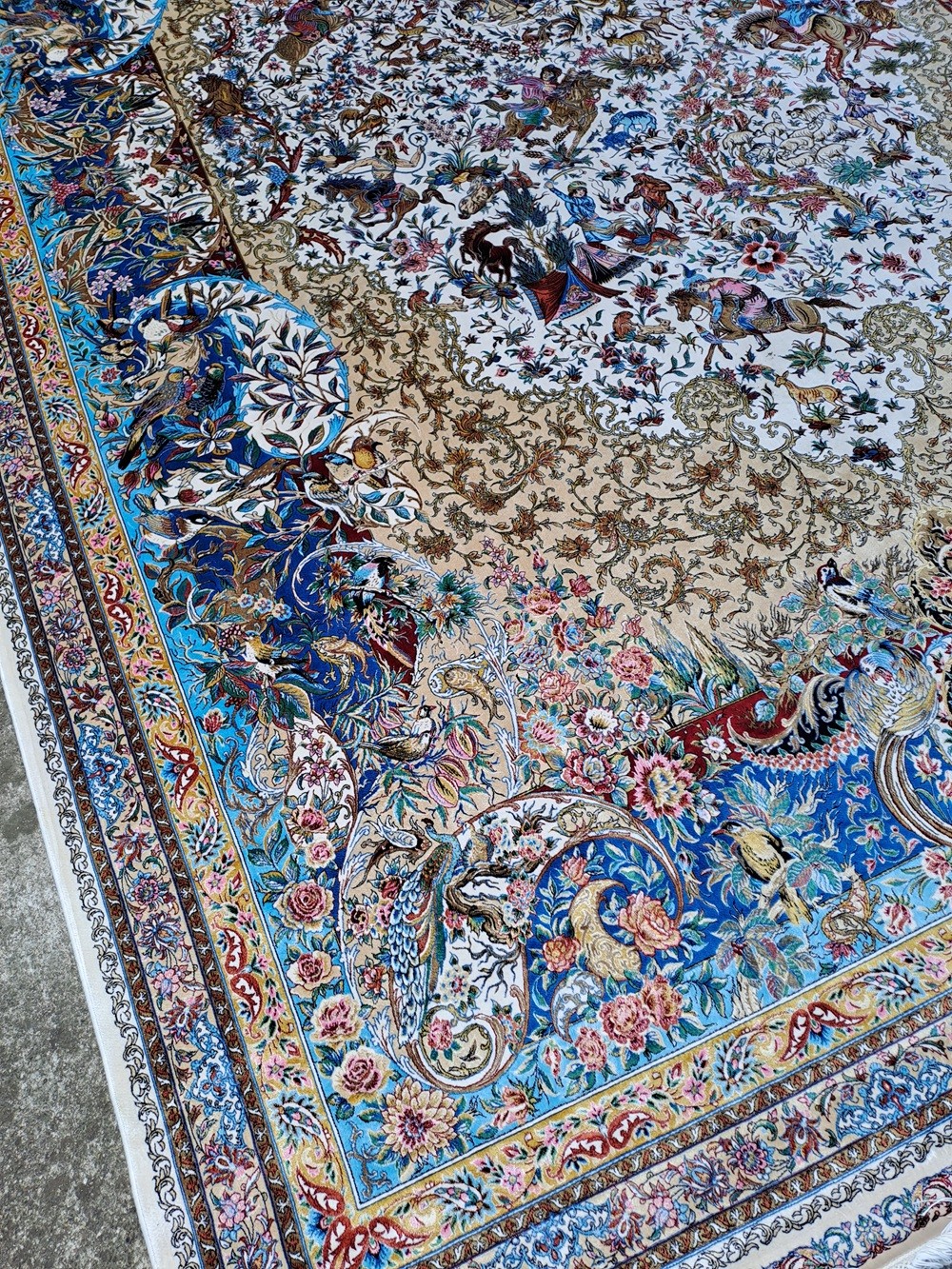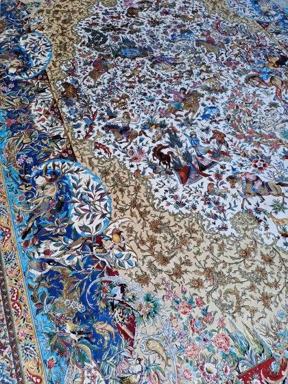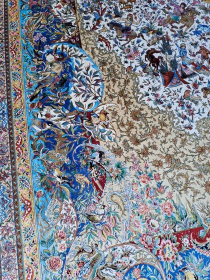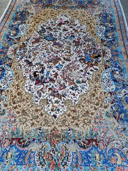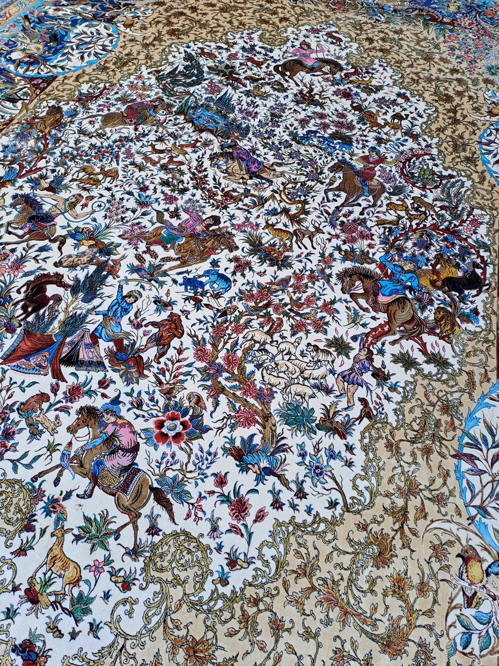 Covor din mătase pe fond albastru turcoaz cu scene de vânătoare din Persia antică și elemente din natură.  Este o adevărată operă de artă, combinând măiestria artizanală cu simbolismul istoric și estetic.