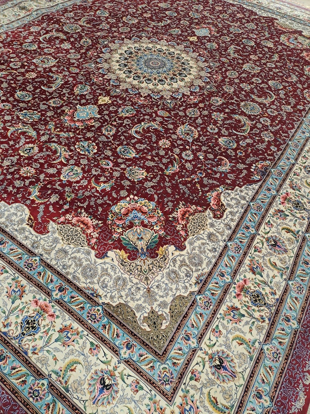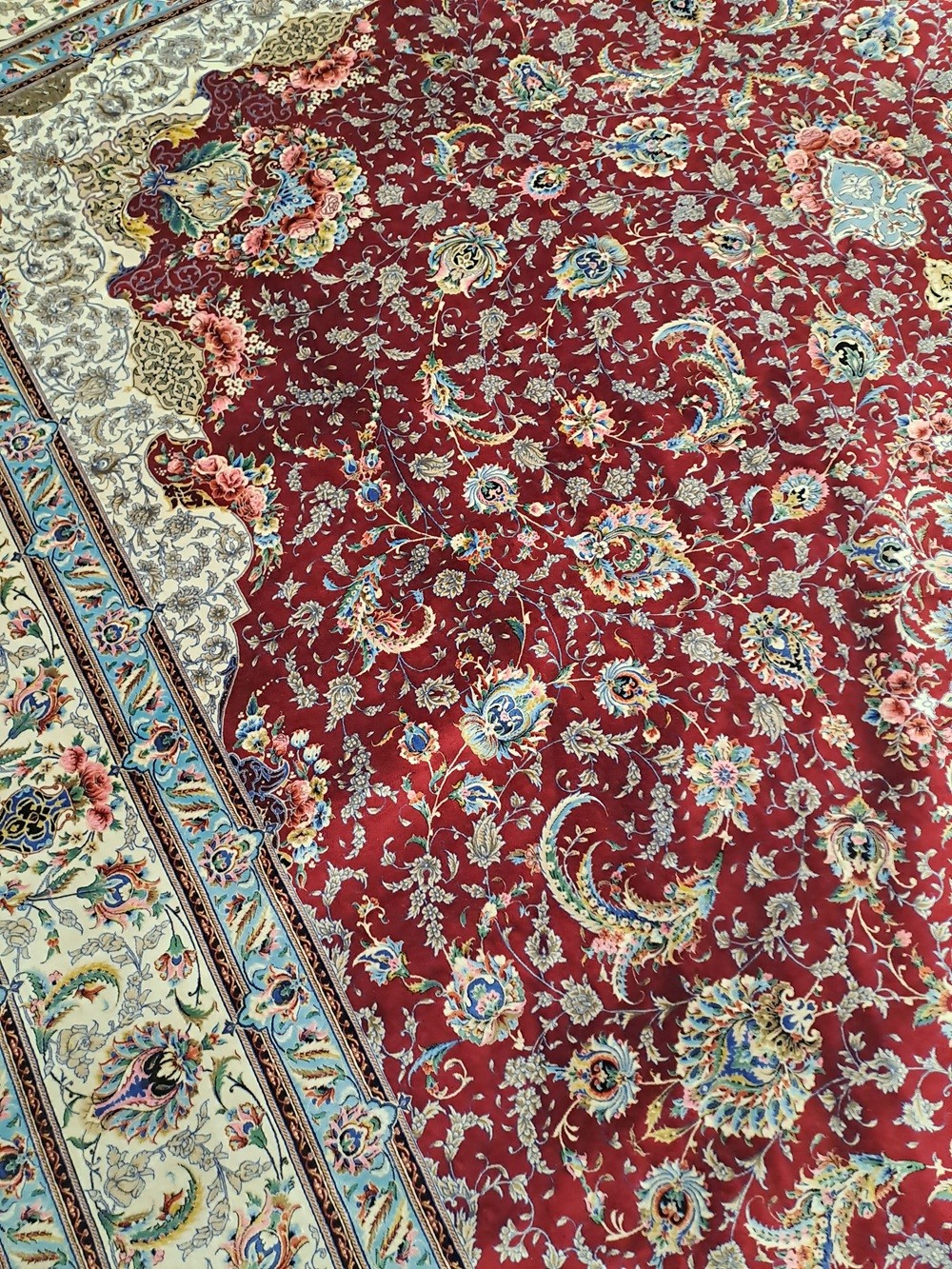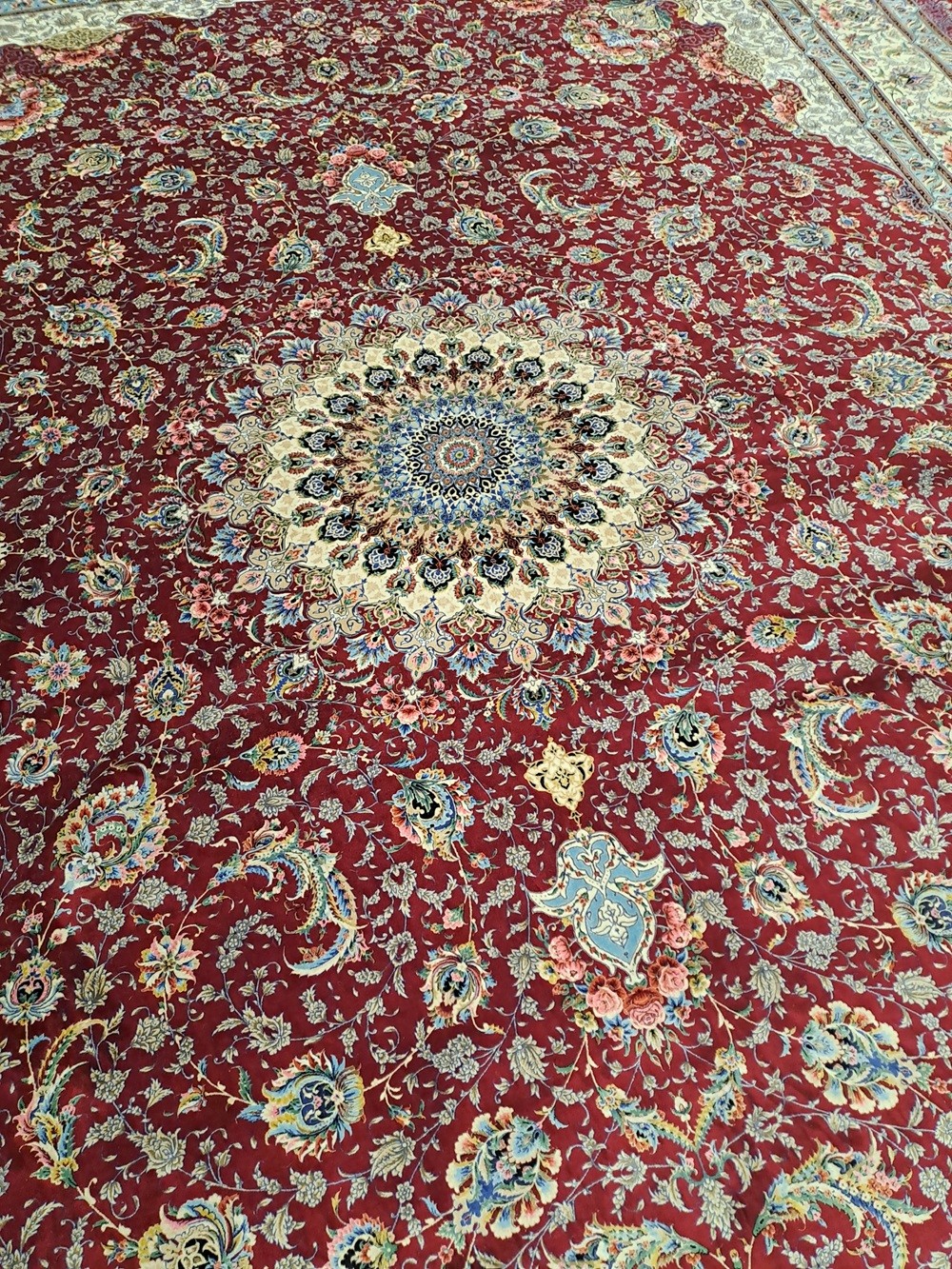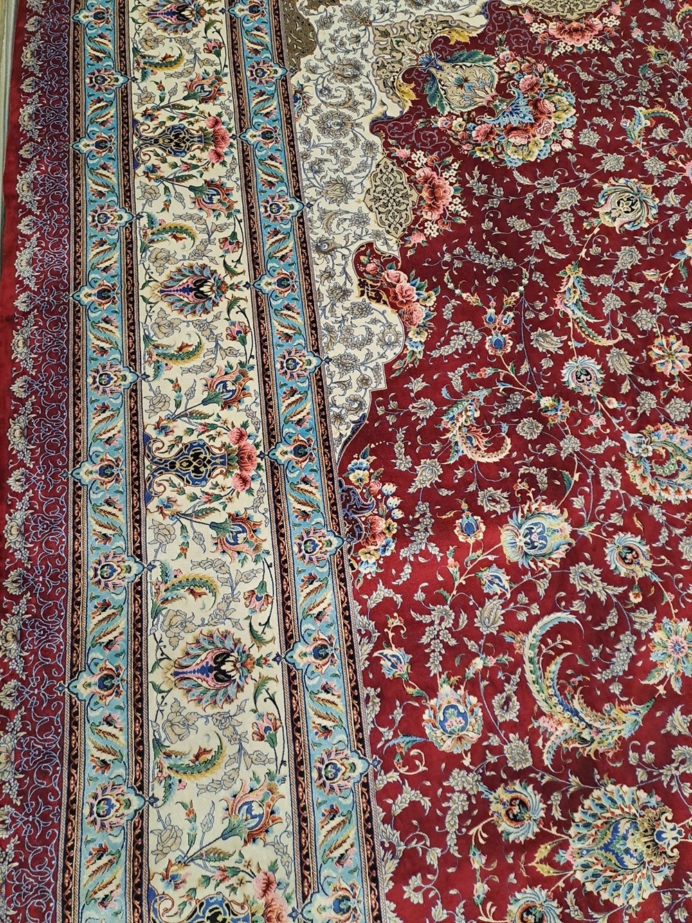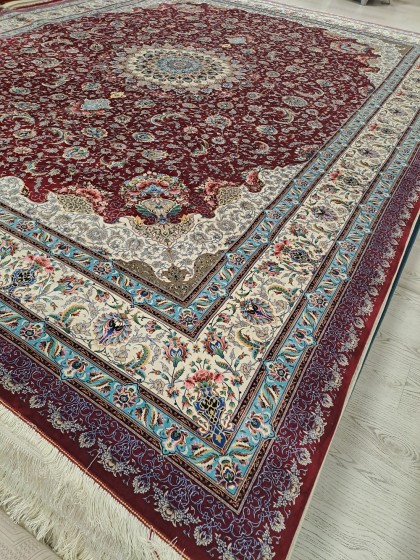 Este un covor persan din mătase pe fond roșu-bordo cu model oriental. Pe mijloc are rozetă.
