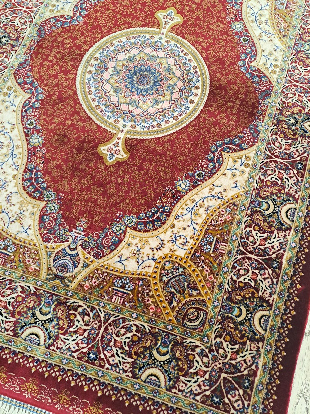 Este un covor de mici dimensiuni din mătase pe fond roșu-vișiniu cu model oriental.