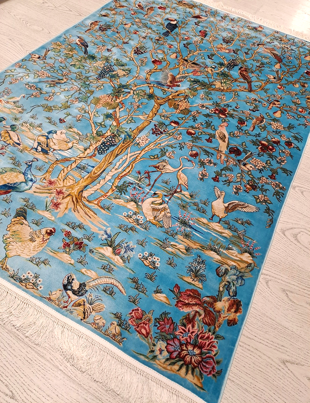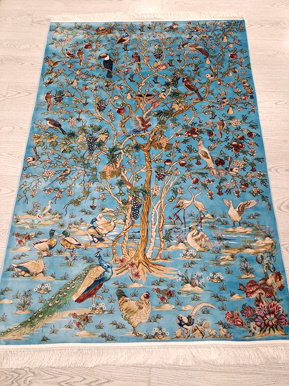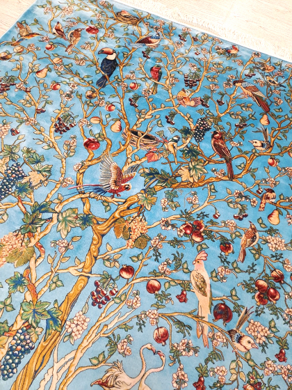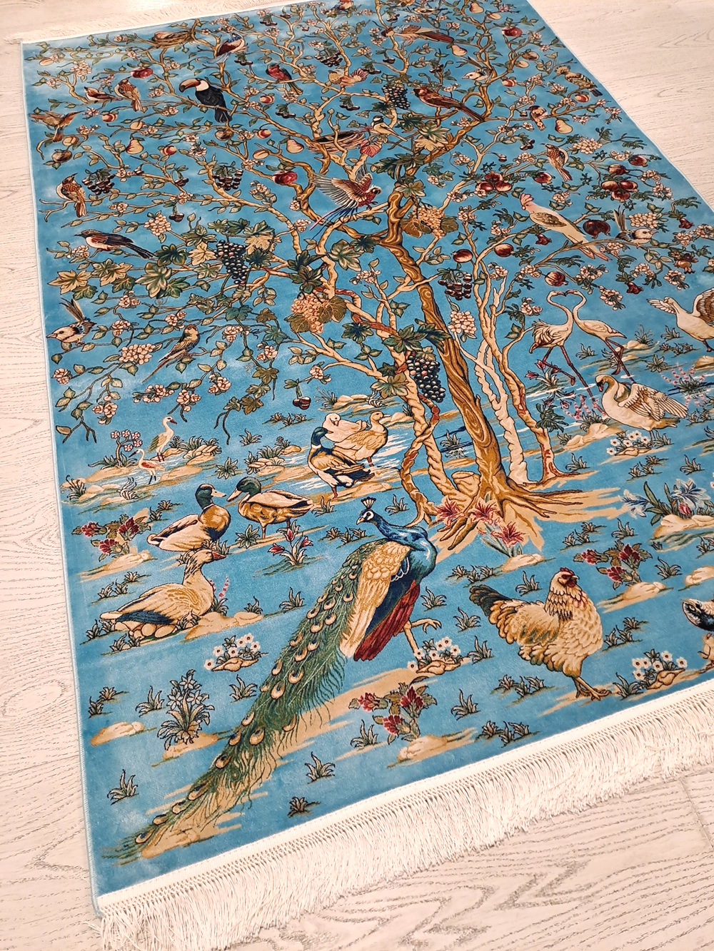 Este un covor din mătase pe fond turcoaz cu păsări colorate.