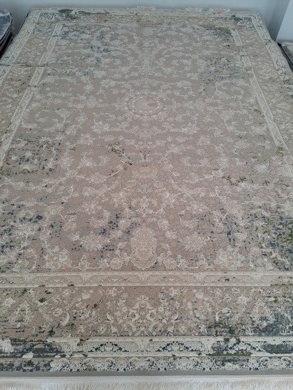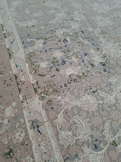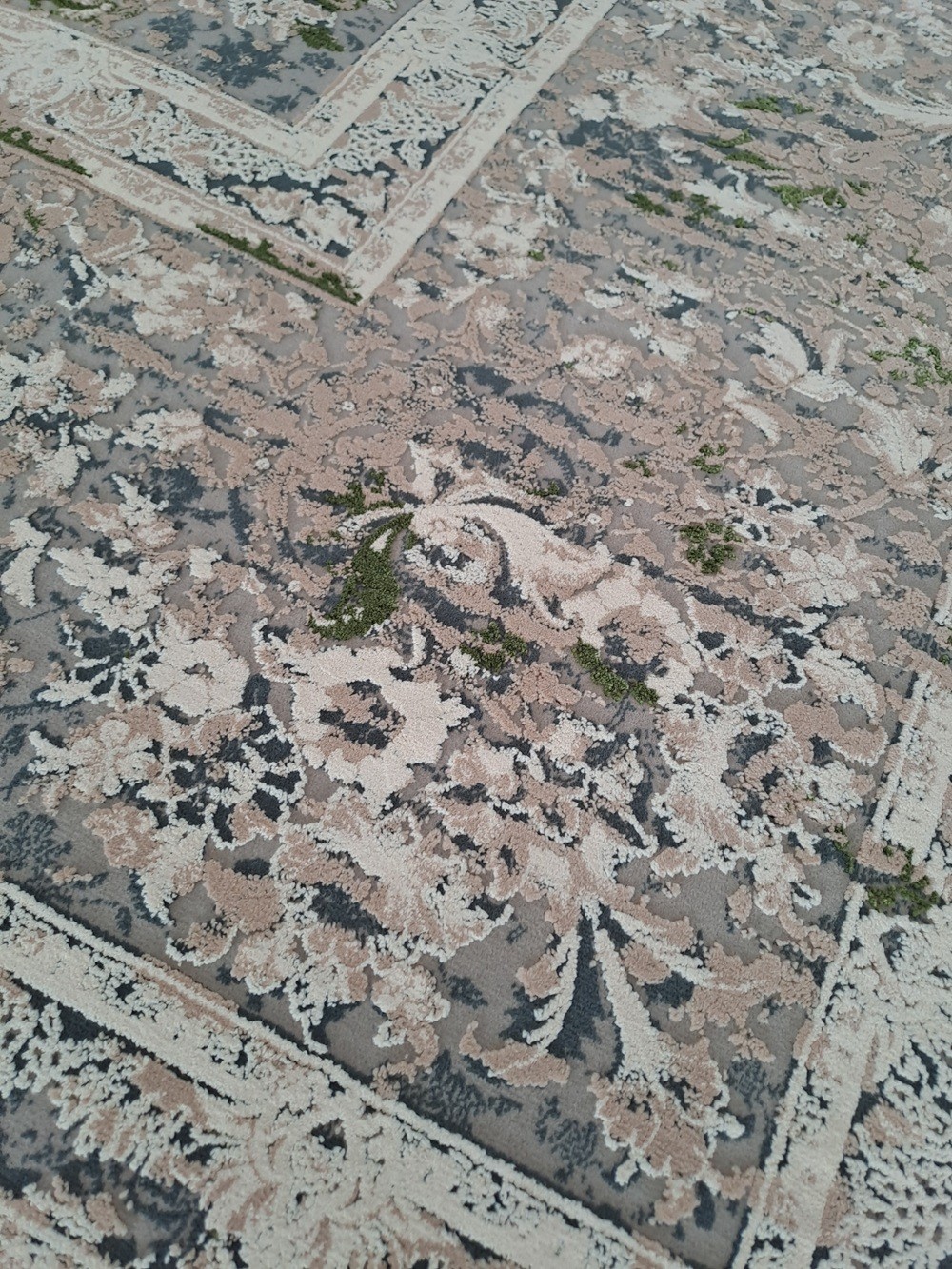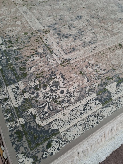 Este un covor grej (între gri și bej) cu model clasic oriental ivoar, bej și verde.