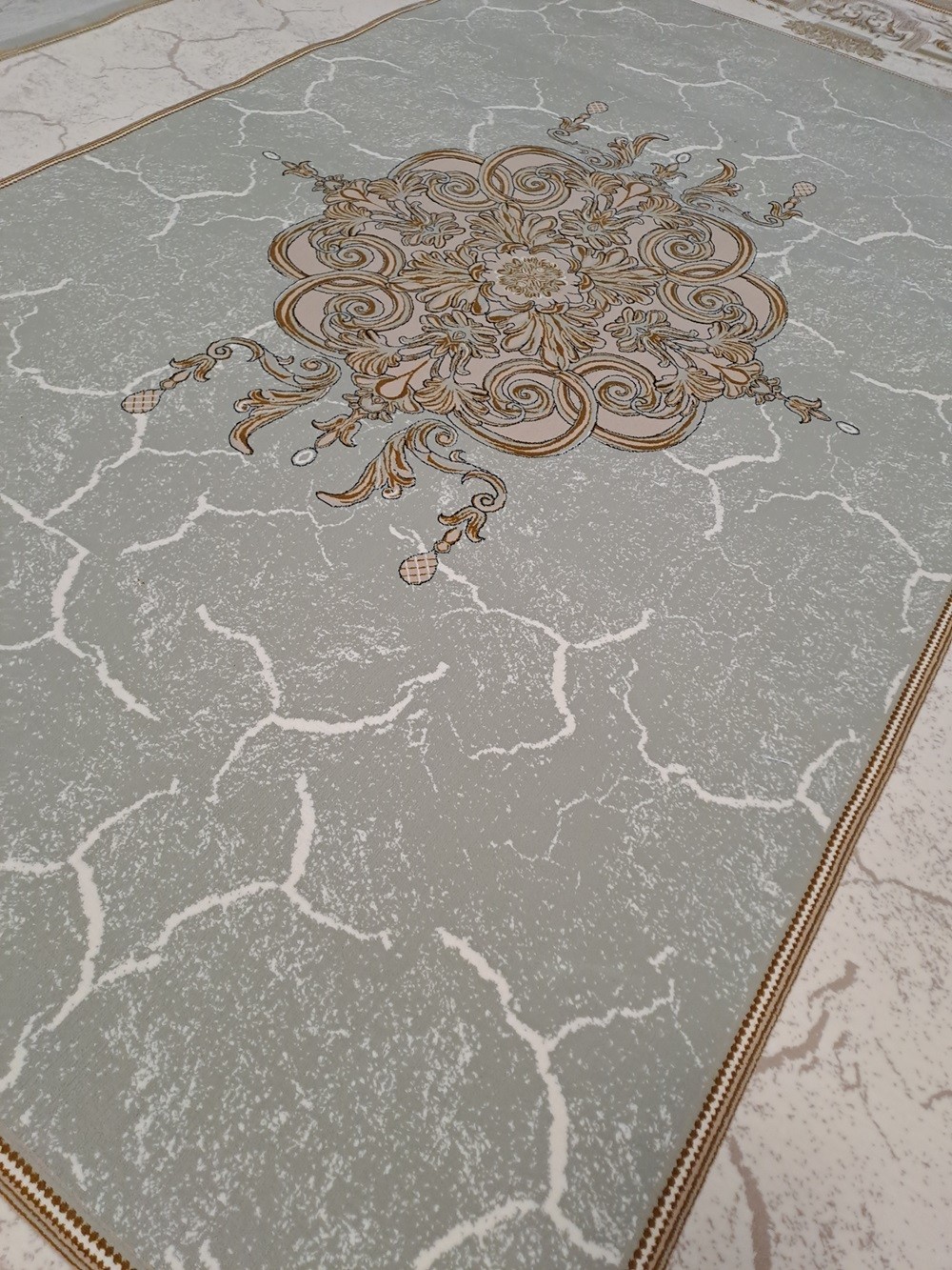 Covor gri cu model clasic bej încadrat în chenar ivoar. Modelul clasic din chenar este bej auriu.
