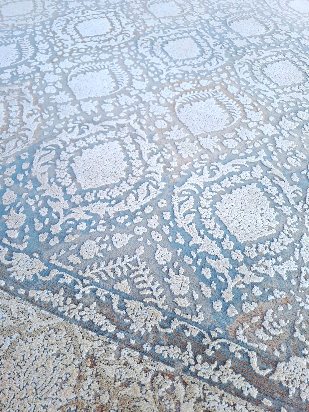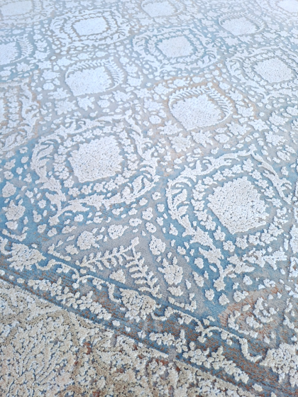 Este un covor pe fond gri cu model clasic ușor în relief ivoar conturat cu bleu și cărămiziu pe alocuri.