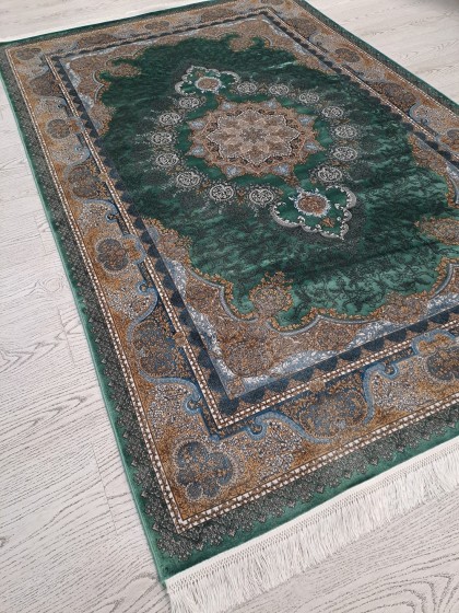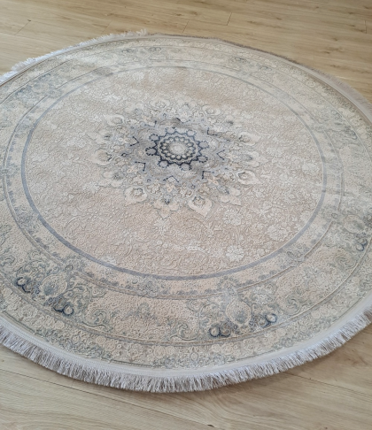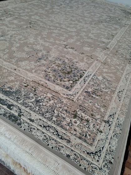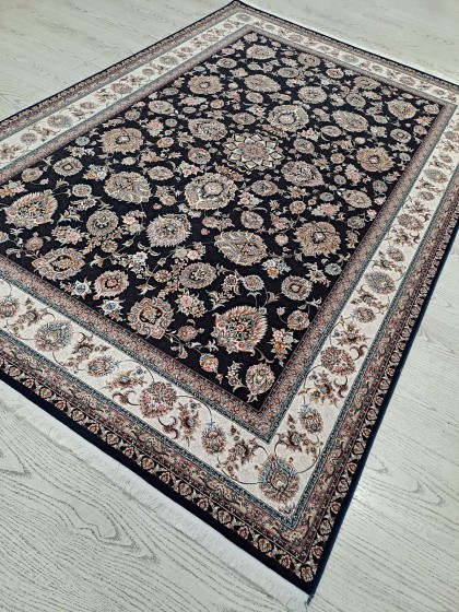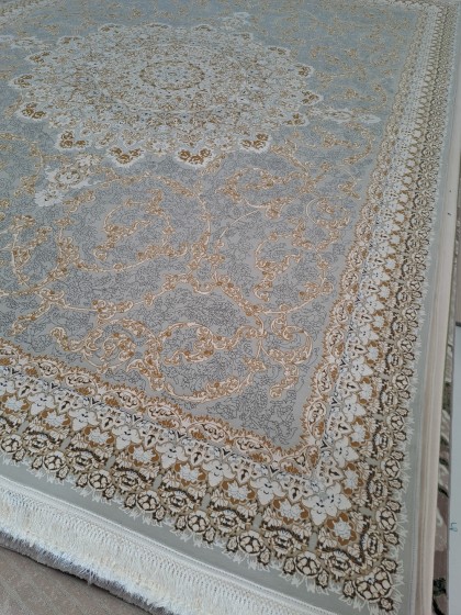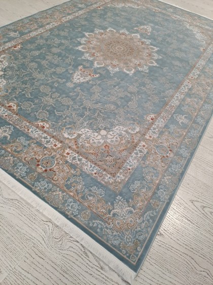 Este un covor în stil baroc pe fond ivoar cu modelul în culori albastru turcoaz, bordo, bej.