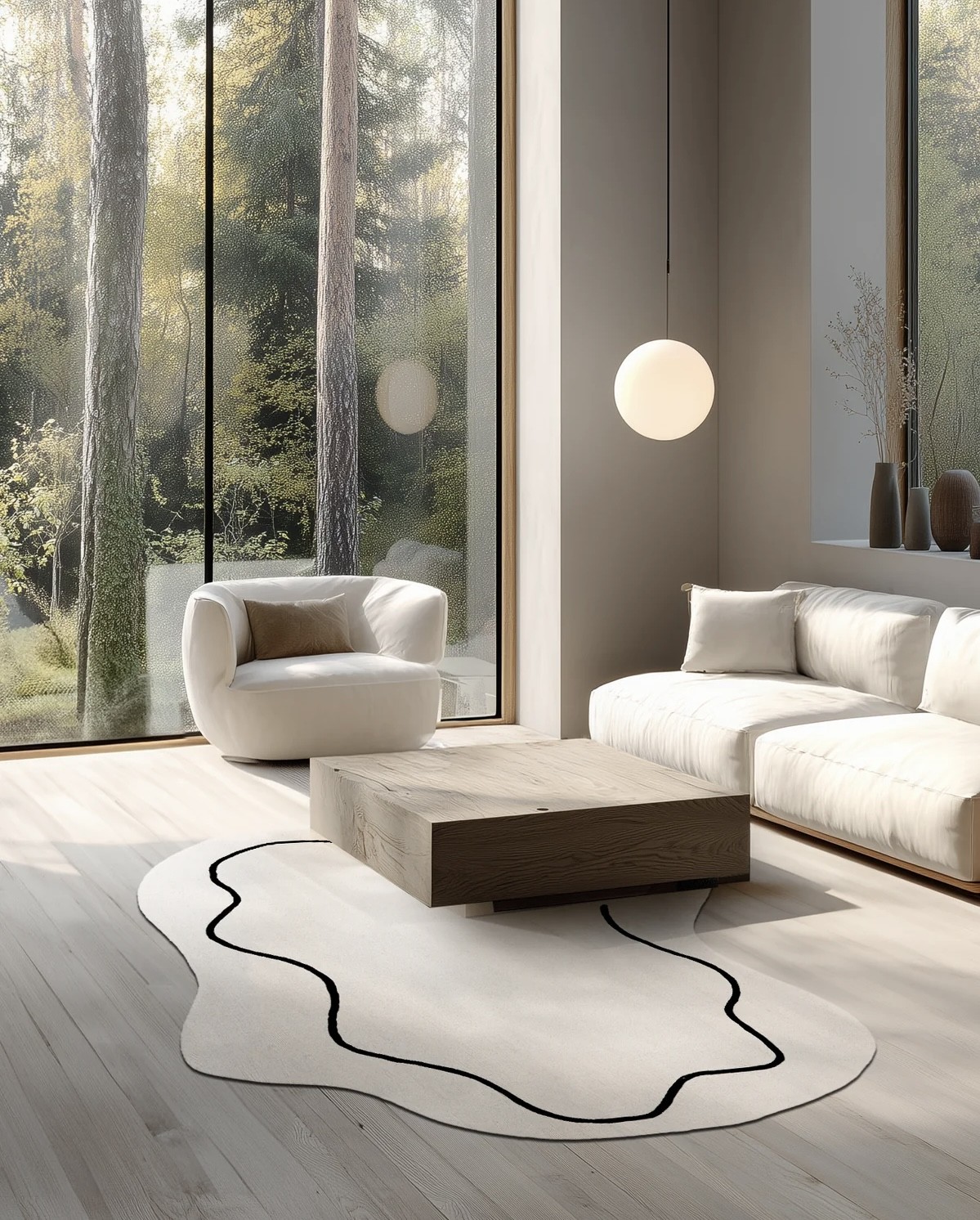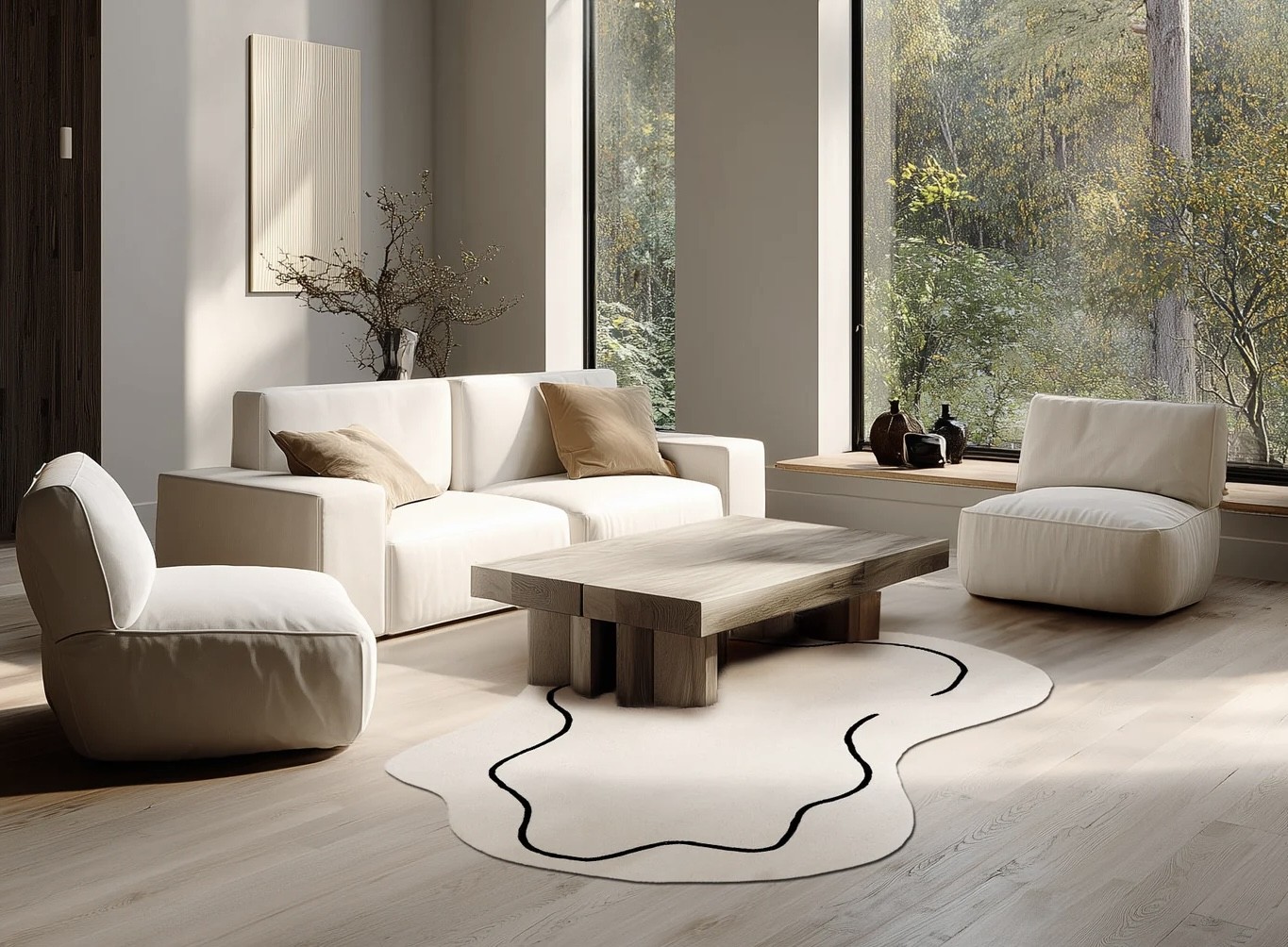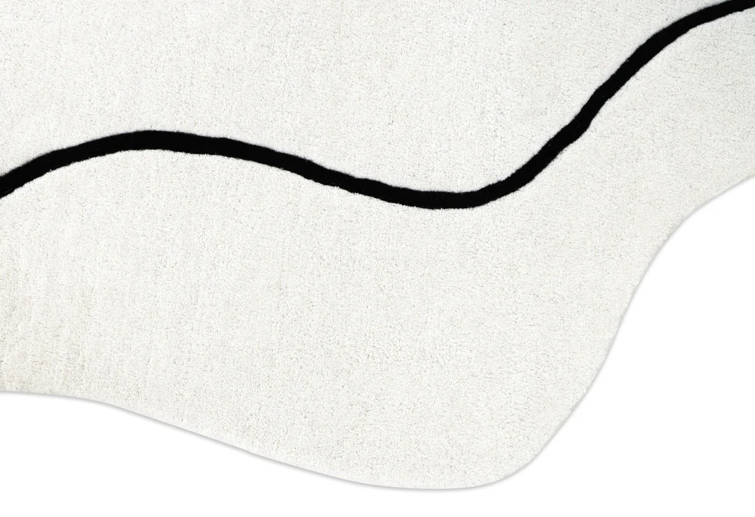 Este un covor modern ivoar cu model asimetric ivoar cu chenar negru.