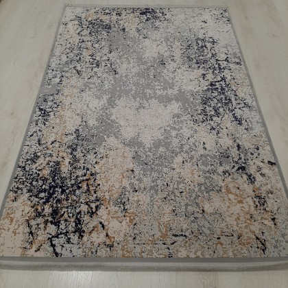 Este un covor modern, deosebit de fin la atingere, cu model abstract in tonuri de bleumarin, ivoar, bej, gri si portocaliu.