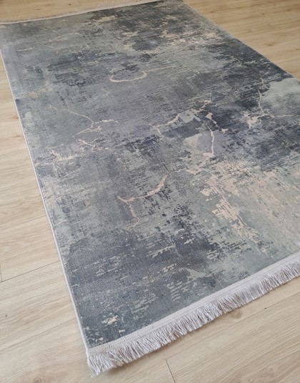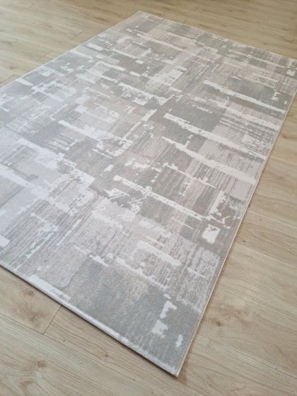 Este un covor în stil modern cu model geometric în 3D, iar gama de culori este una în degrade: gri-alb-negru.