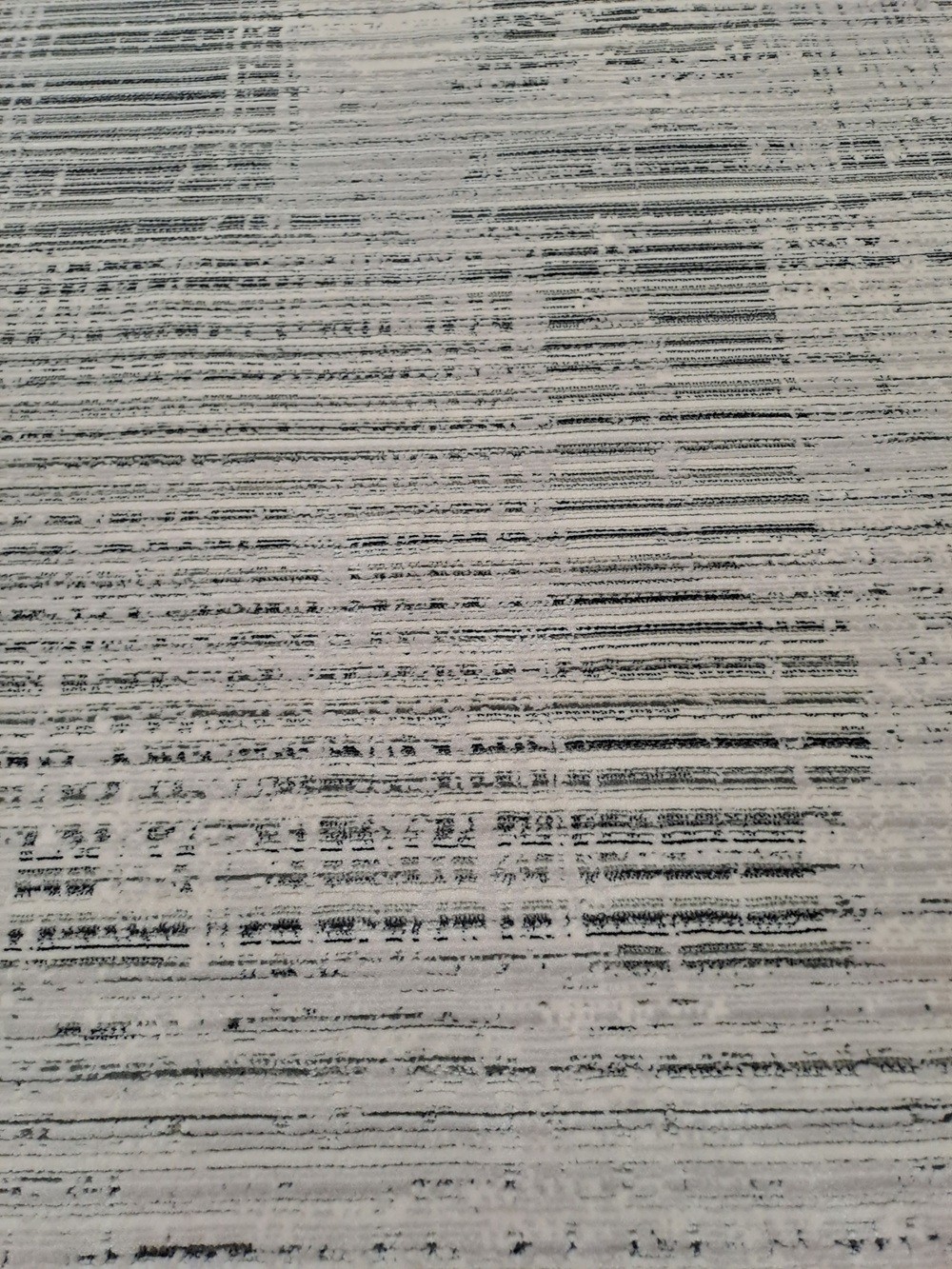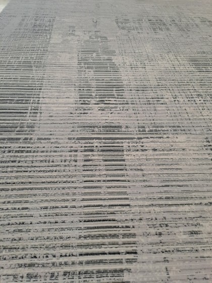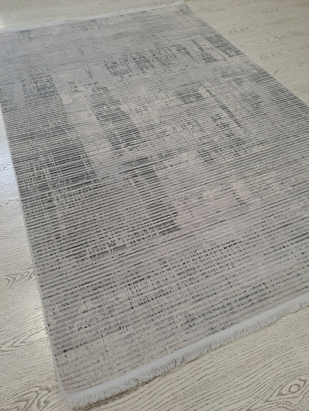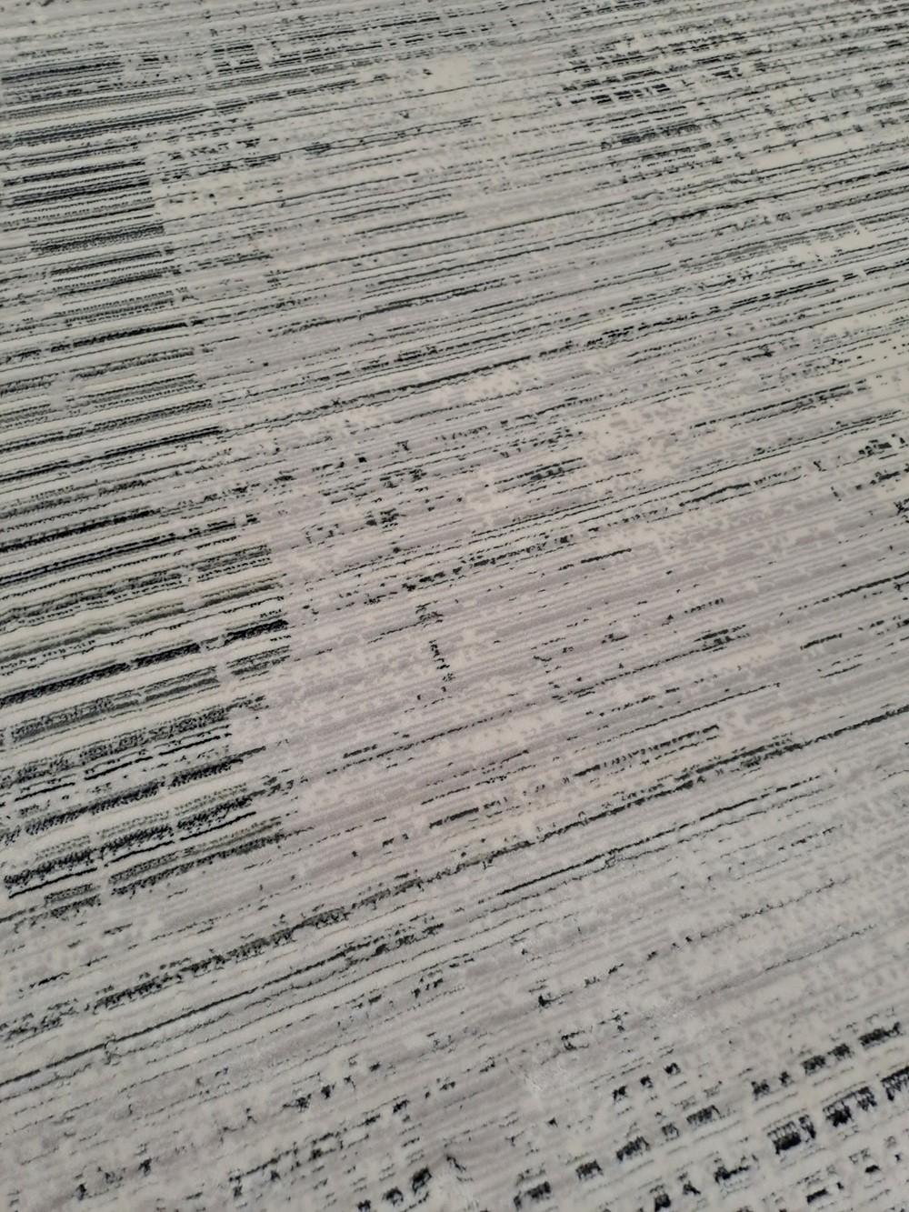Este un covor modern ivoar texturat cu linii gri în degrade.