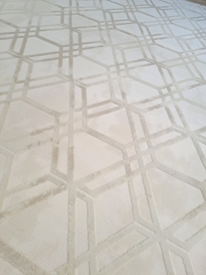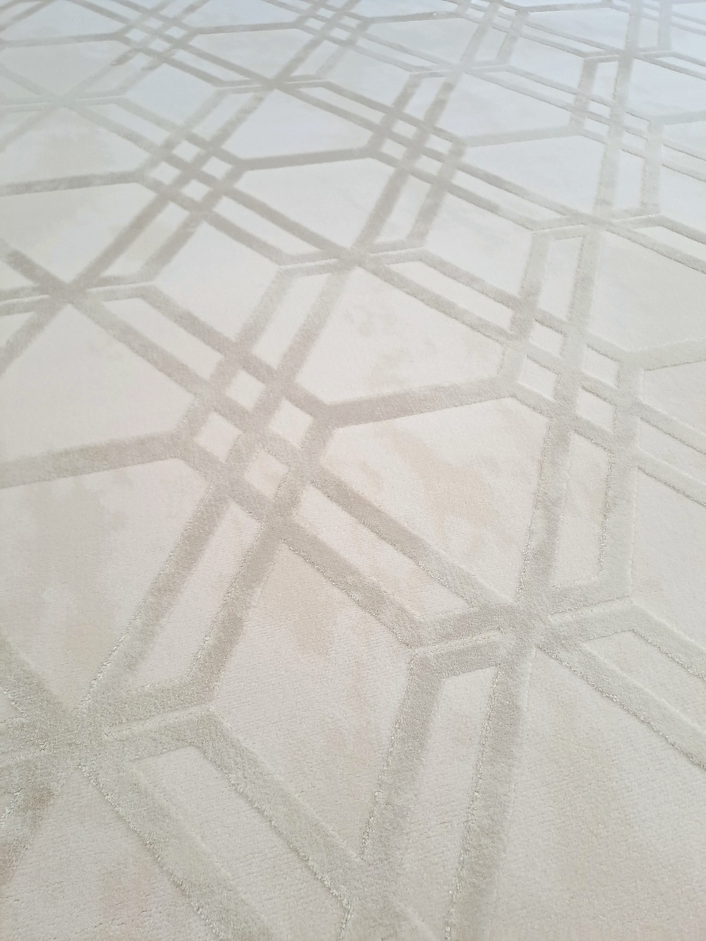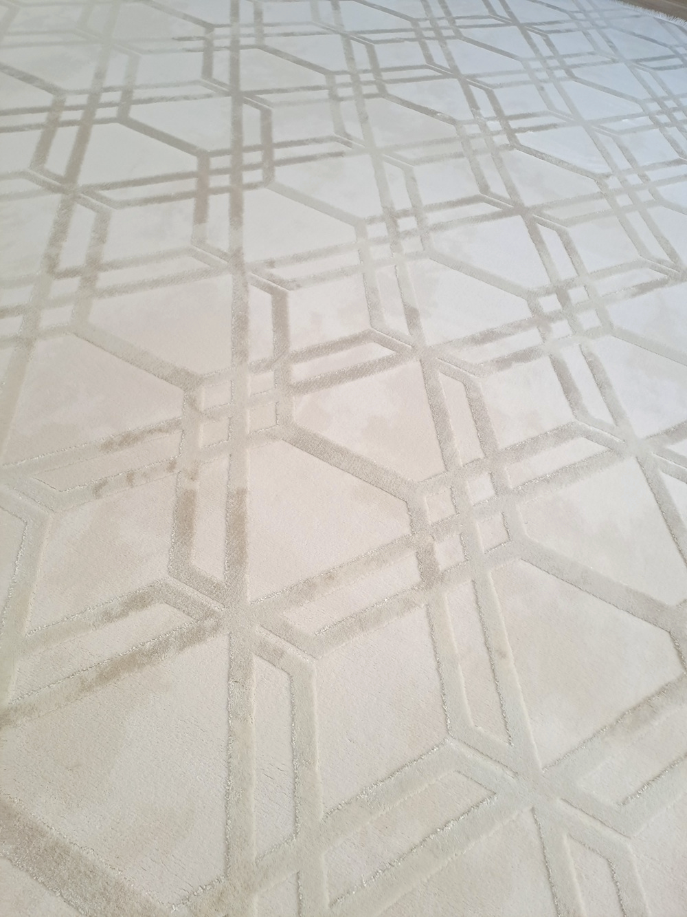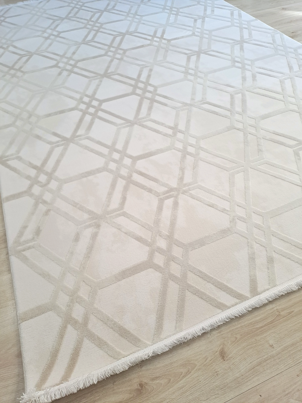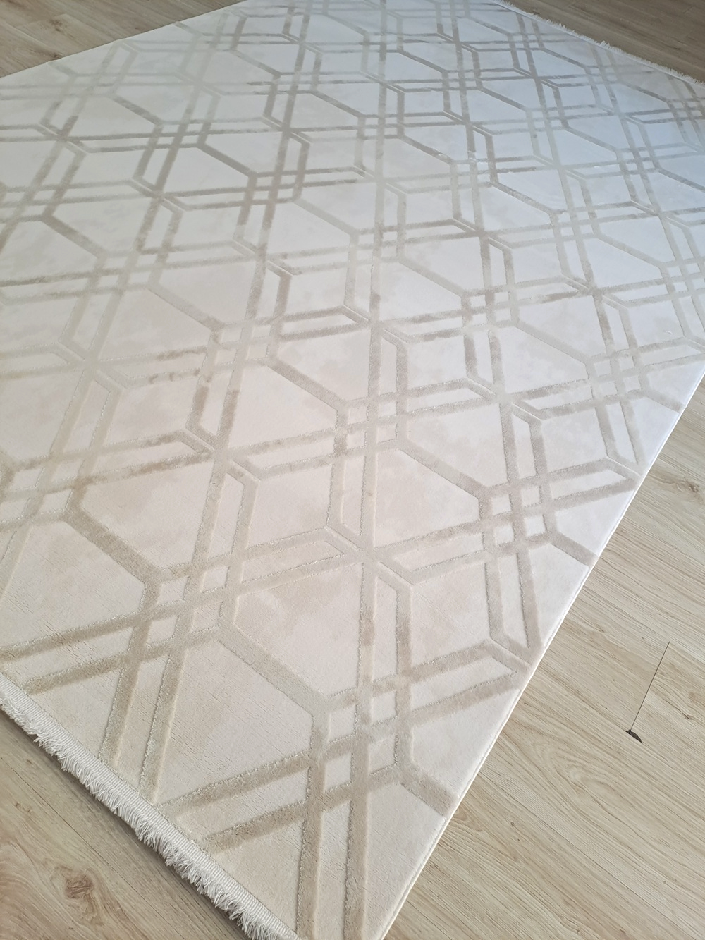 Este un covor modern ivoar cu model geometric bej deschis ieșit ușor în relief.