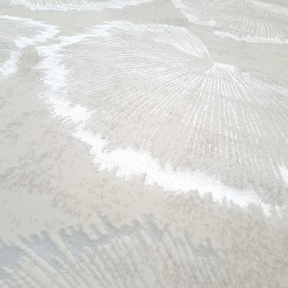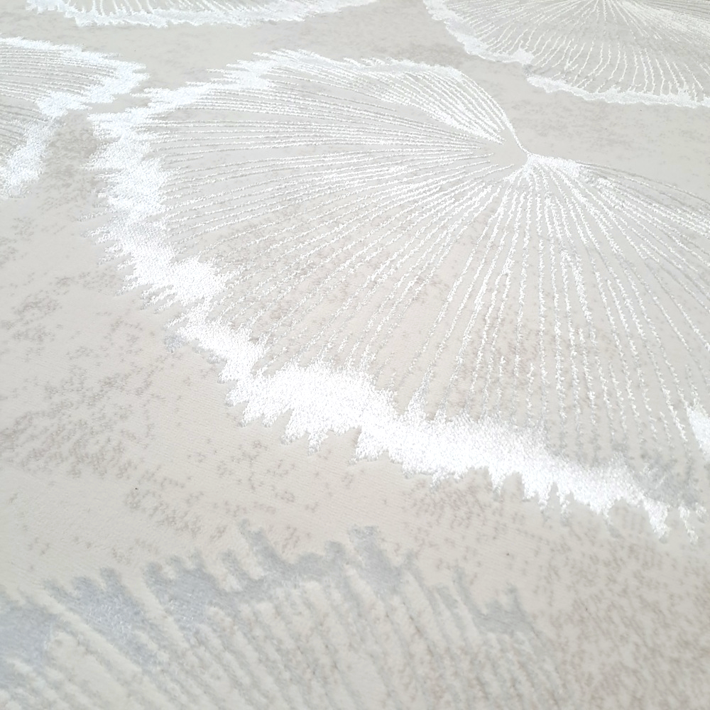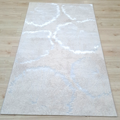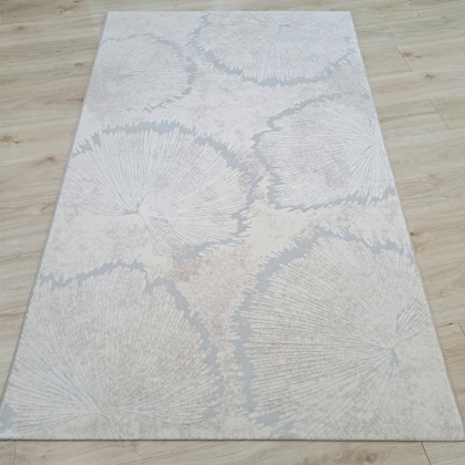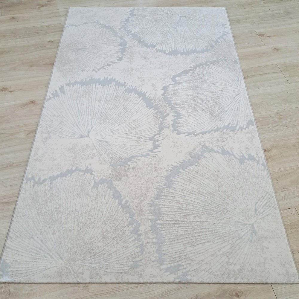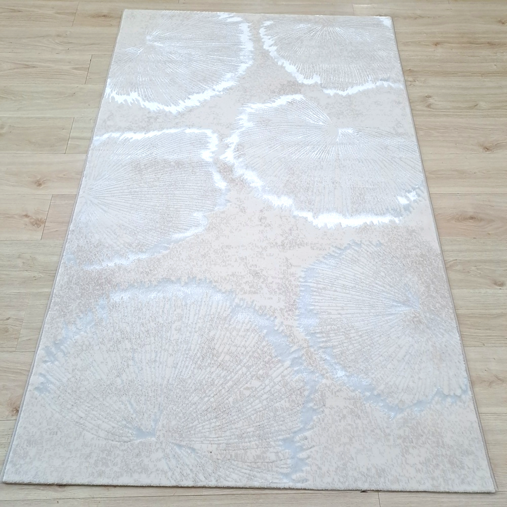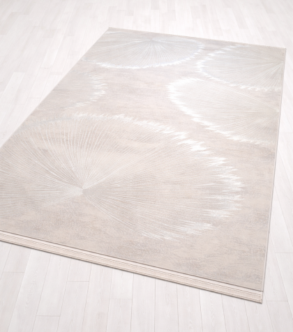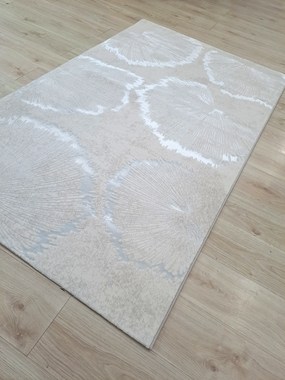 Este un covor din acril în stil modern în tonuri de ivoar, grej și inserții mătăsoase.