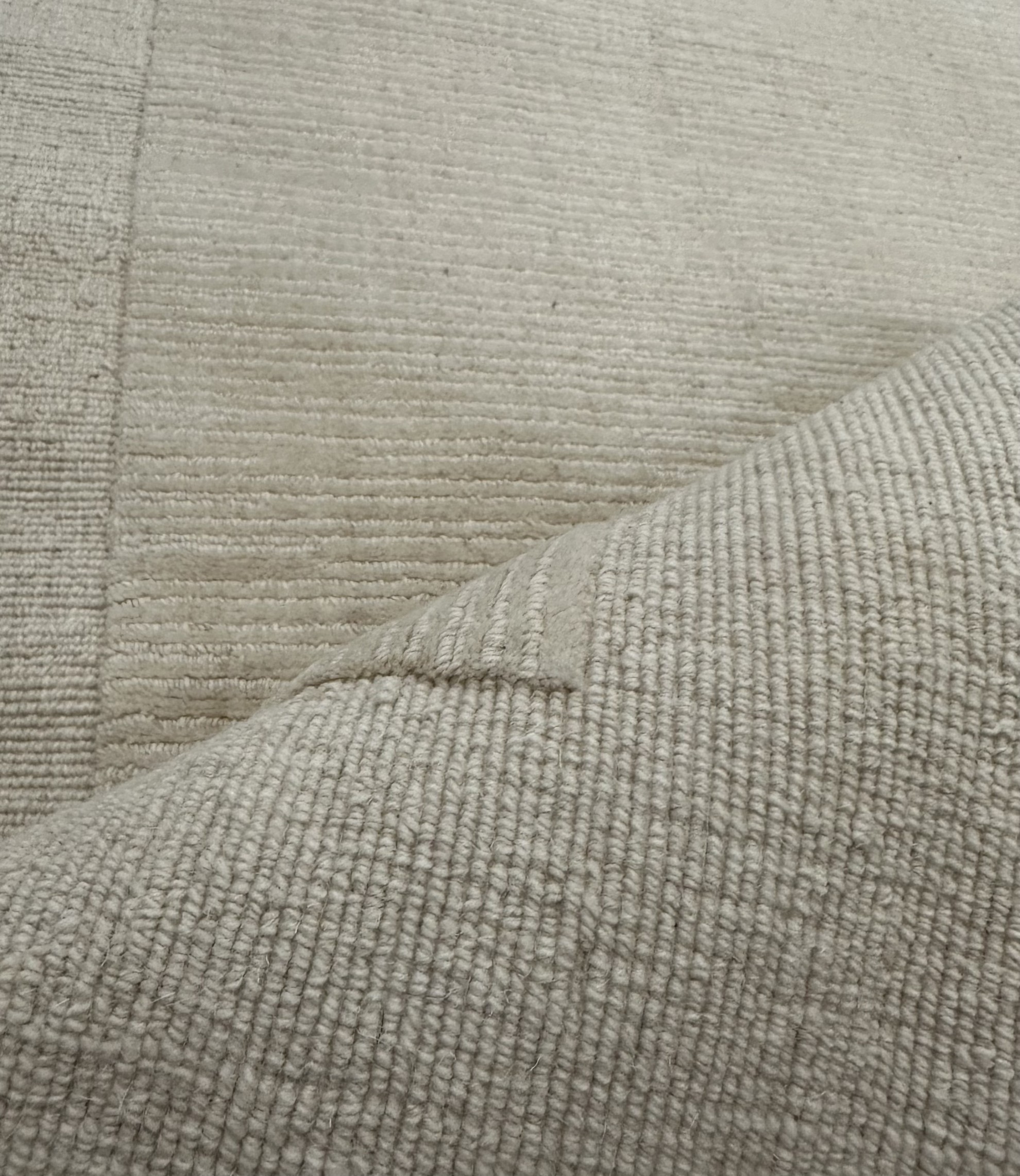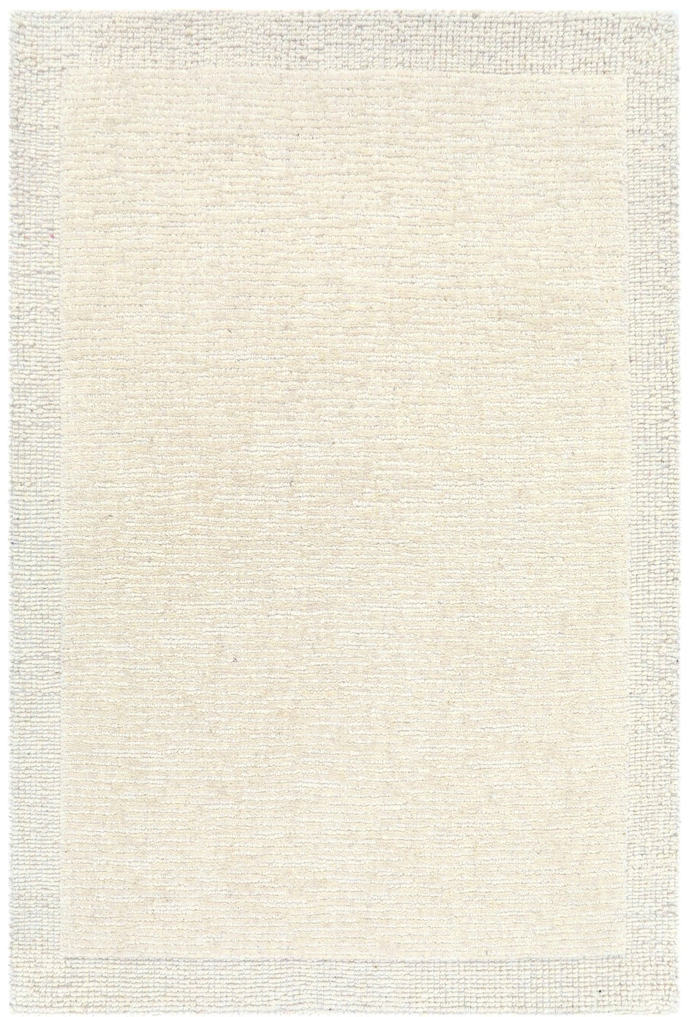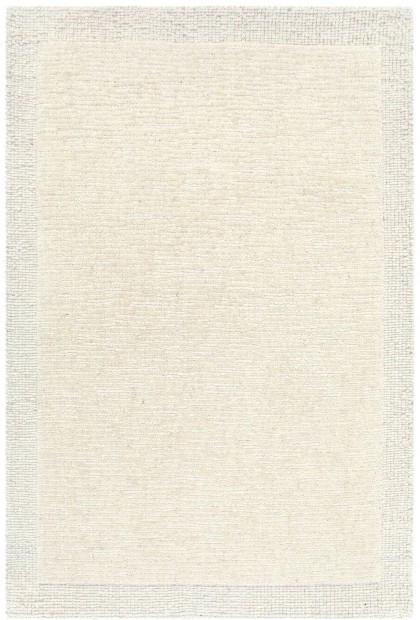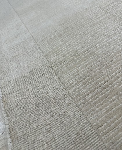 Este un covor modern bej natur cu chenar împletit.