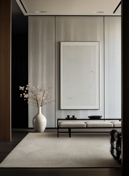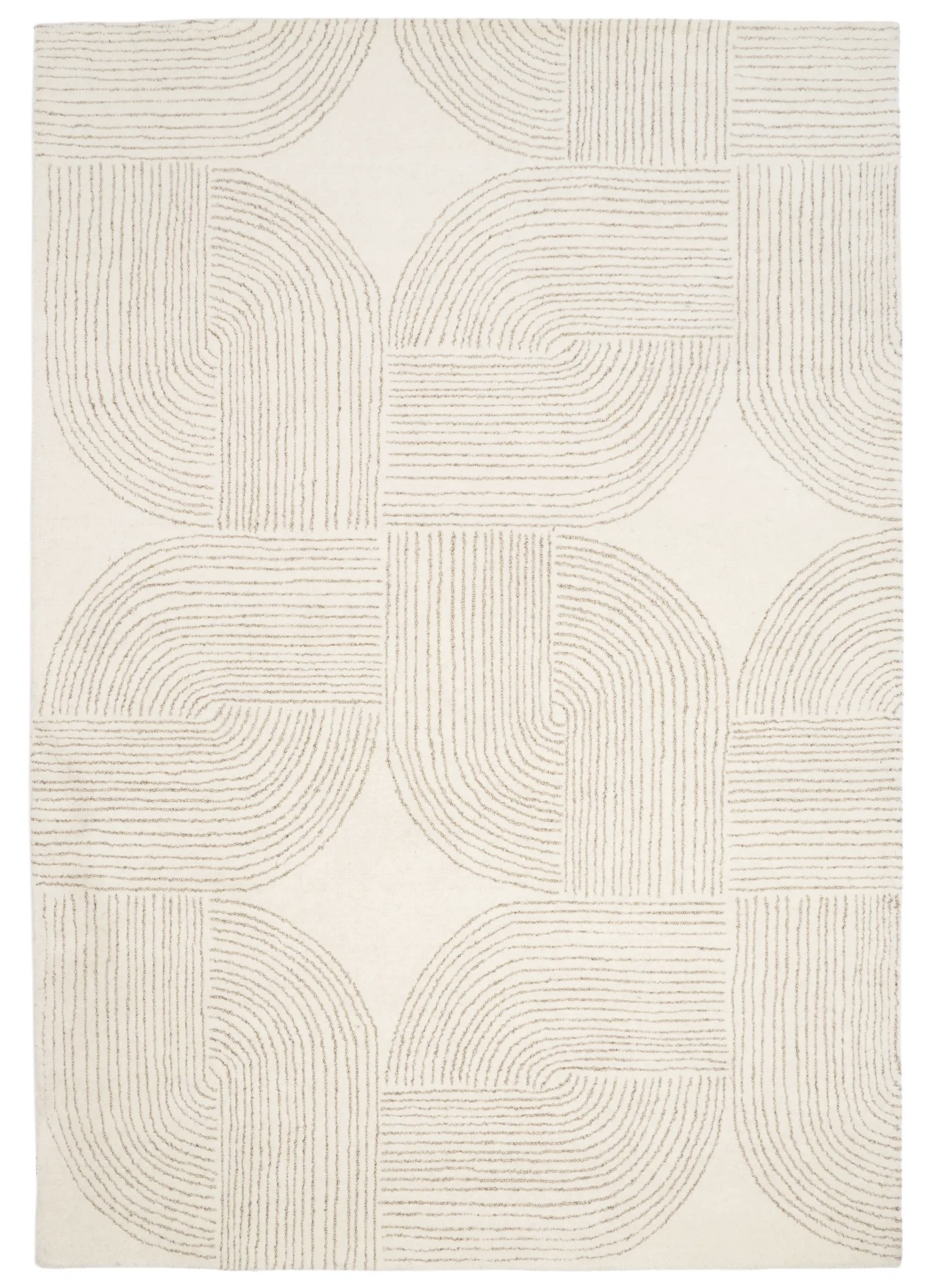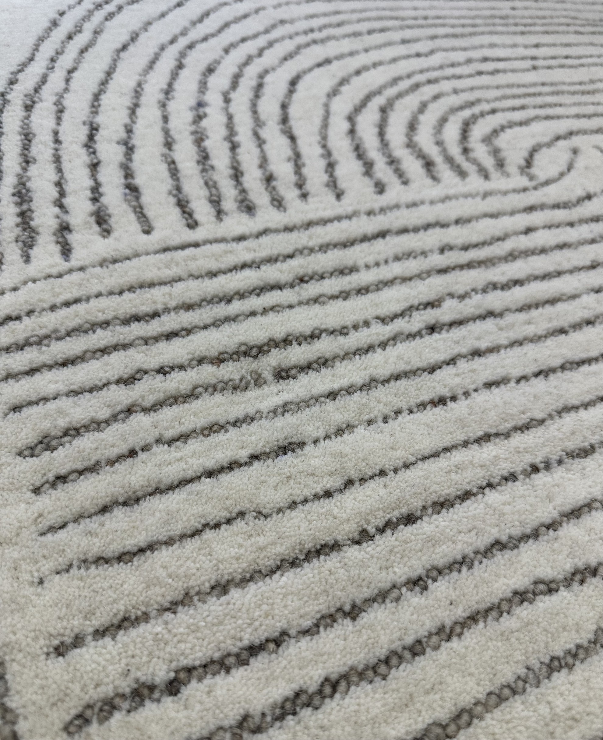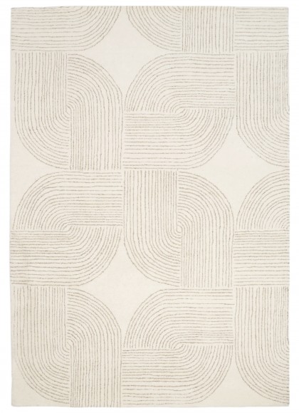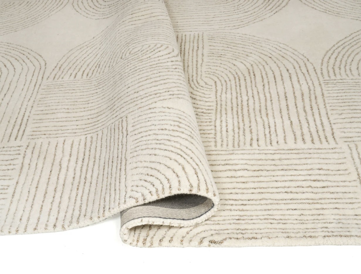 Este un covor modern bej natur cu chenar împletit.