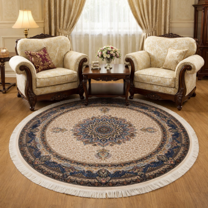 Este un covor bleumarin cu model oriental vegetal dispus pe margini sub formă de chenar.