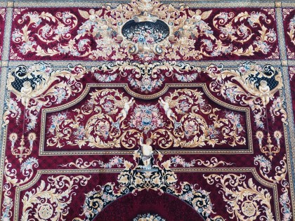 Este un covor roșu-bordo cu model clasic bej auriu.