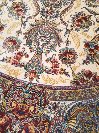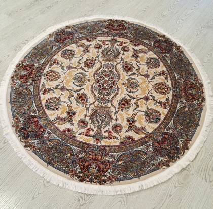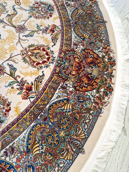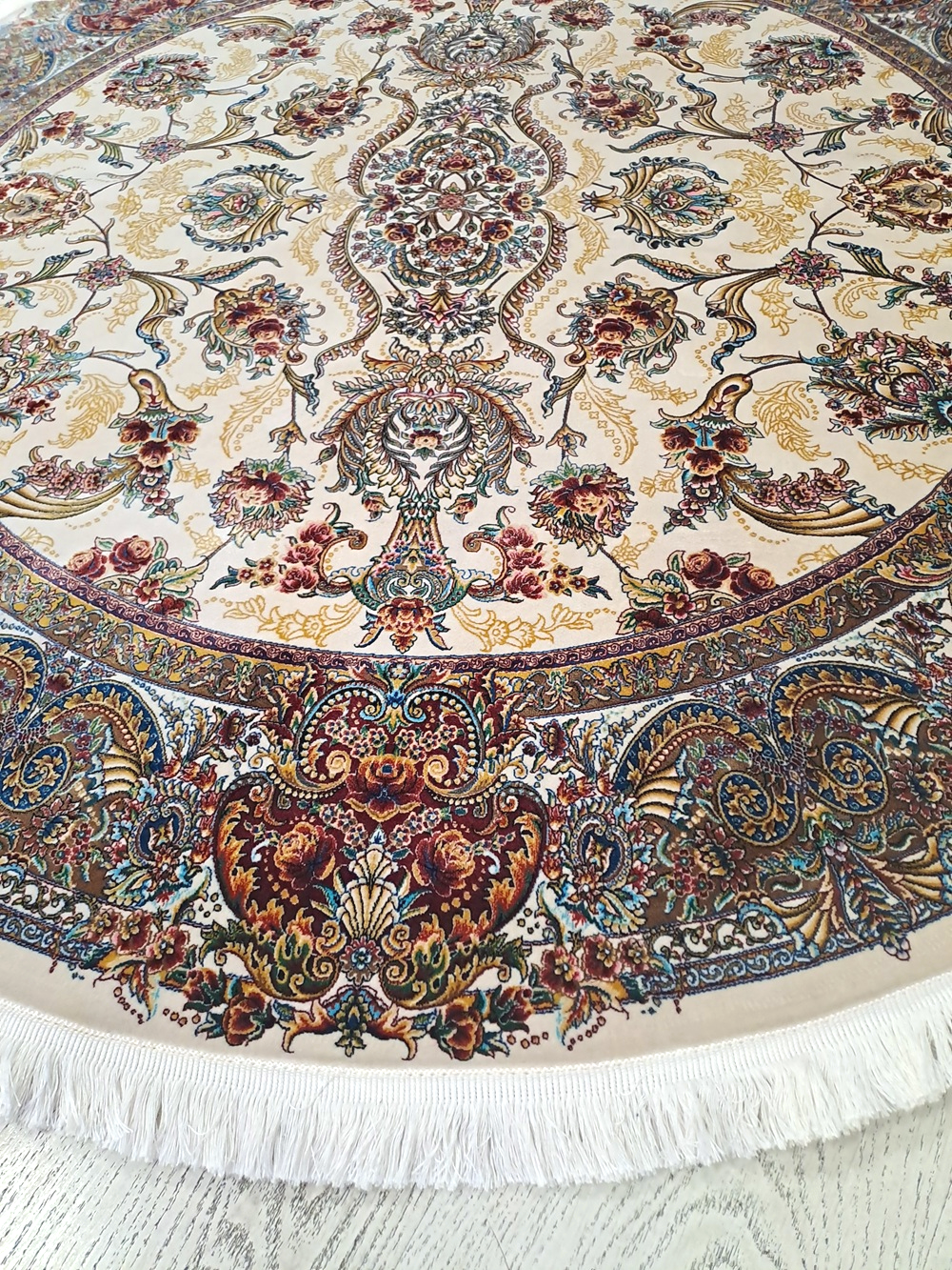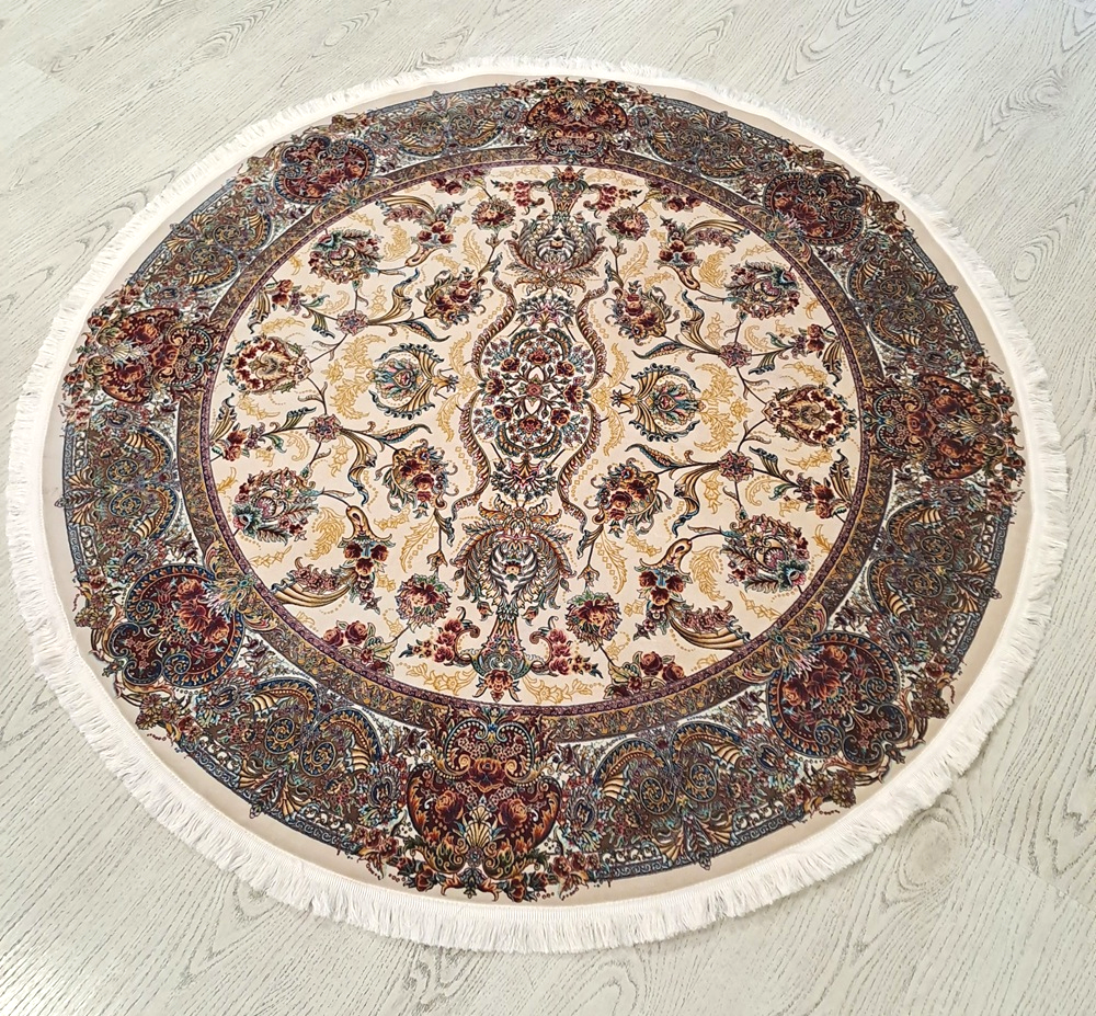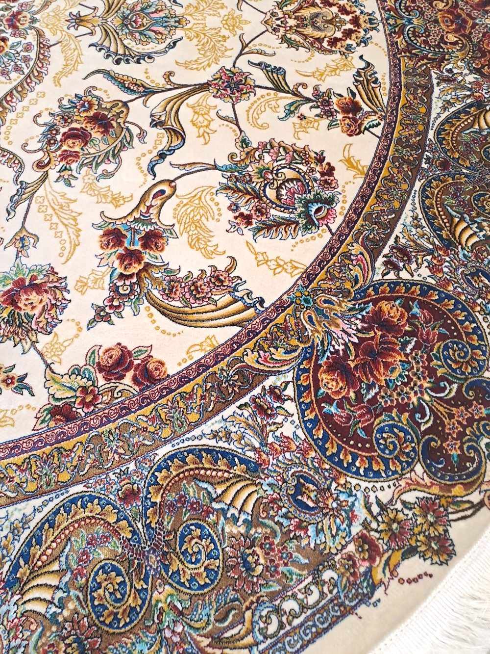 Este un covor rotund, persan din mătase crem cu model clasic viu colorat.