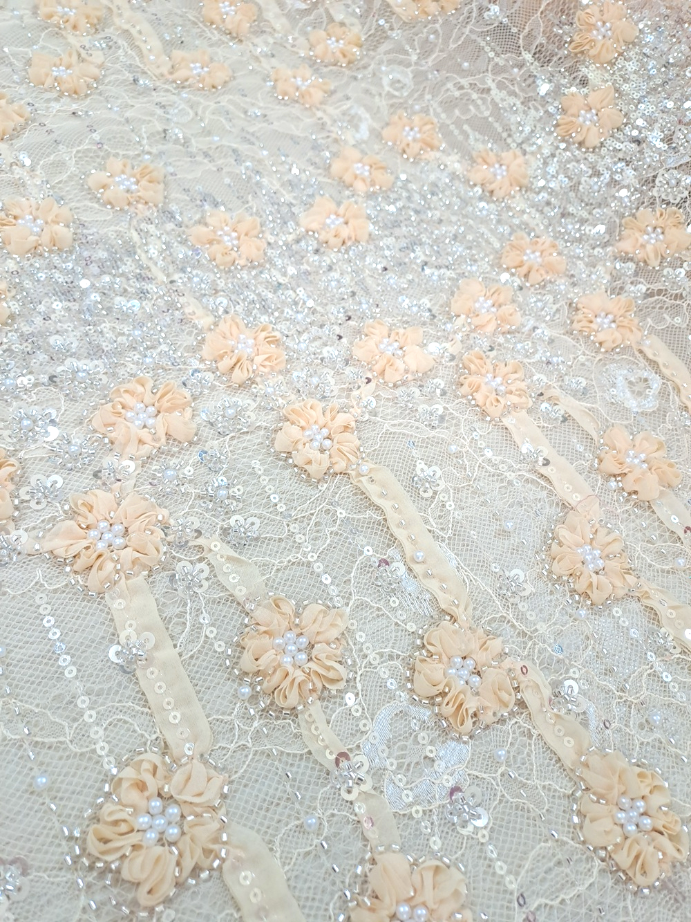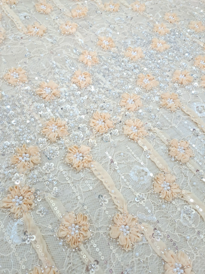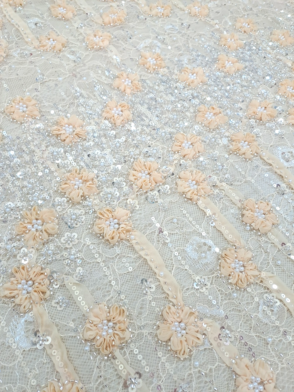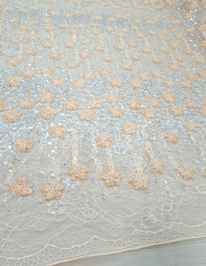 Este o dantelă tip Chantilly frez accesorizată cu panglici în forme florale și drepte, paiete argintii și perle albe.