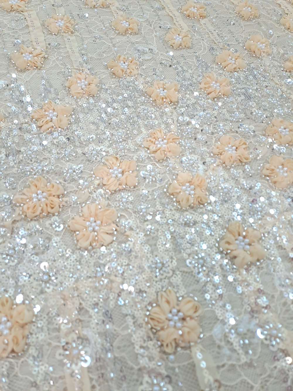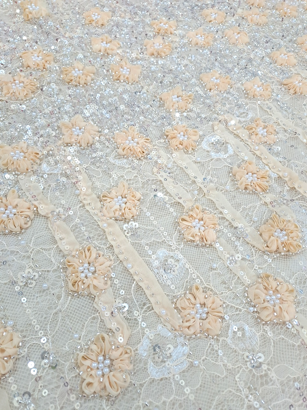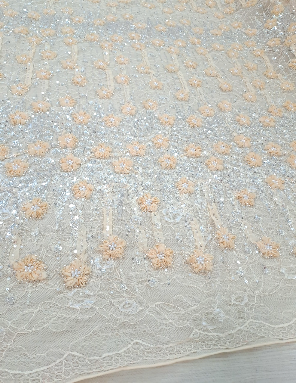 Este o dantelă tip Chantilly frez accesorizată cu panglici în forme florale și drepte, paiete argintii și perle albe.